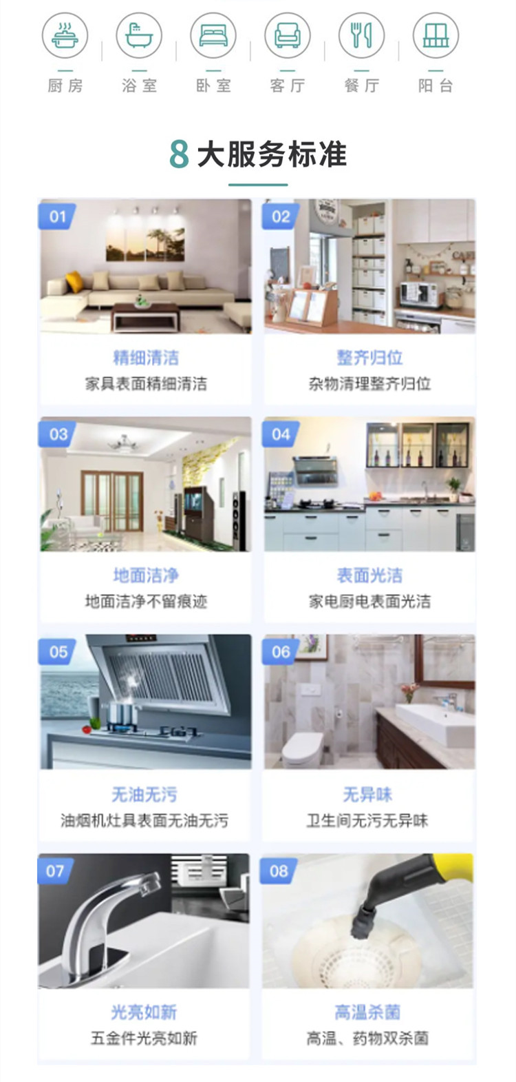 家具表面精细清洁、杂物清理整齐归位、地面洁净不留痕迹、家电厨电表面光洁、油烟机灶具表面无油污、卫生间无污无异味、五金件光亮如新、高温消毒