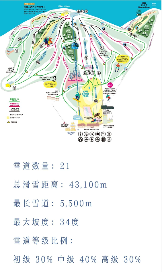 日本安比高原被称为“阿斯匹林粉雪”的故乡,因其雪道人少,缆车不用排队闻名。一天能从早滑到晚,夜场开到9点,体力够的话,一天能滑十多趟,绝对的滑回成本。