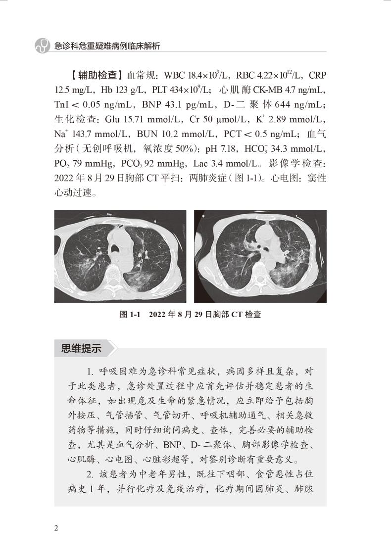 本书的编写团队成员长期工作在急危重症抢救的一线,对急危重症诊疗有着丰富的临床经验。本书收录的急诊病例也是急诊疑难危重病的代表性病例,其中不乏一些容易被漏诊、误诊的不典型病例,包括主动脉夹层、肺动脉栓塞、甲状腺功能减退危象、肾上腺危象、寄生虫病等传染病、膀胱破裂和结肠破裂等。每个病例的诊疗既具有独特的个性,也存在重复的共性,同一疾病可以表现得千变万化,这就是急诊临床诊疗和多样性的魅力所在,确有“山重水复疑无路,柳暗花明又一村”的感觉。