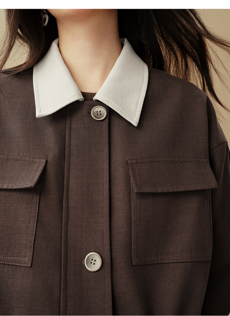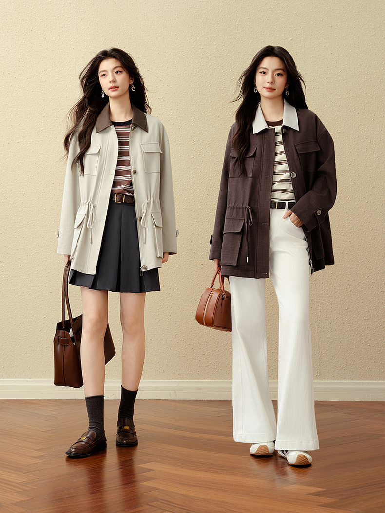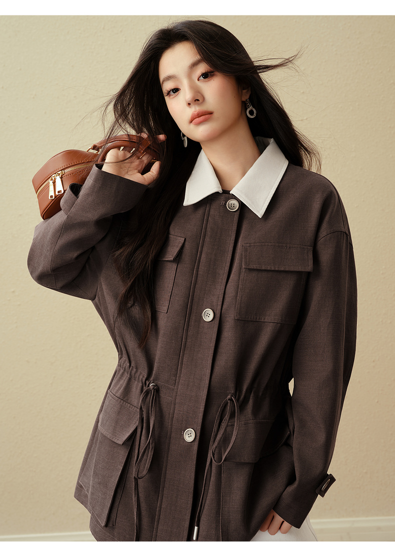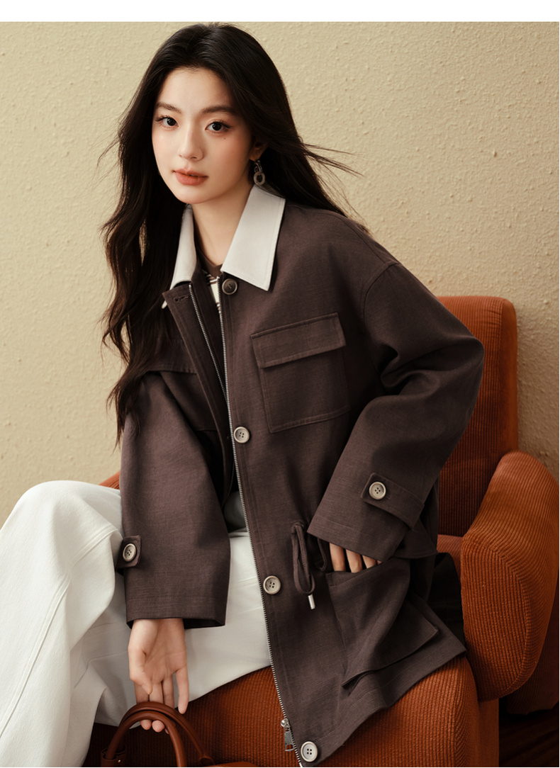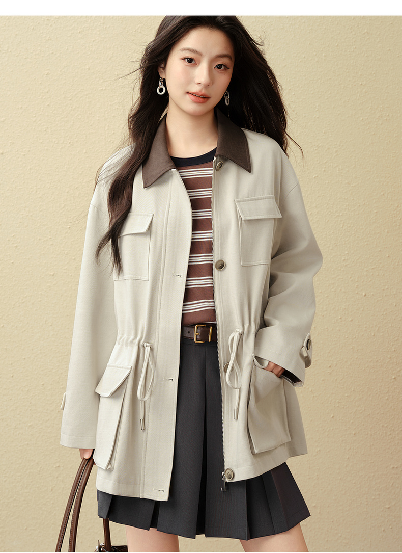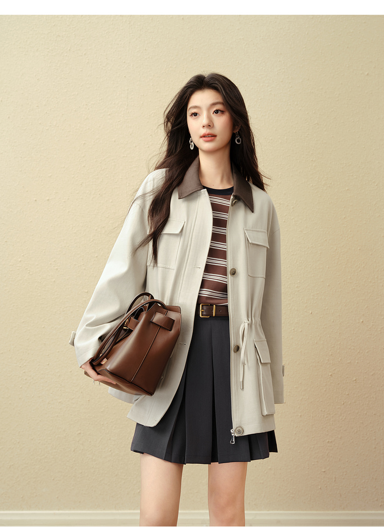 【严选】诗凡黎巴恩风撞色翻领质感风衣25秋新款天丝棉复古抽绳轻便短外套7G8160241