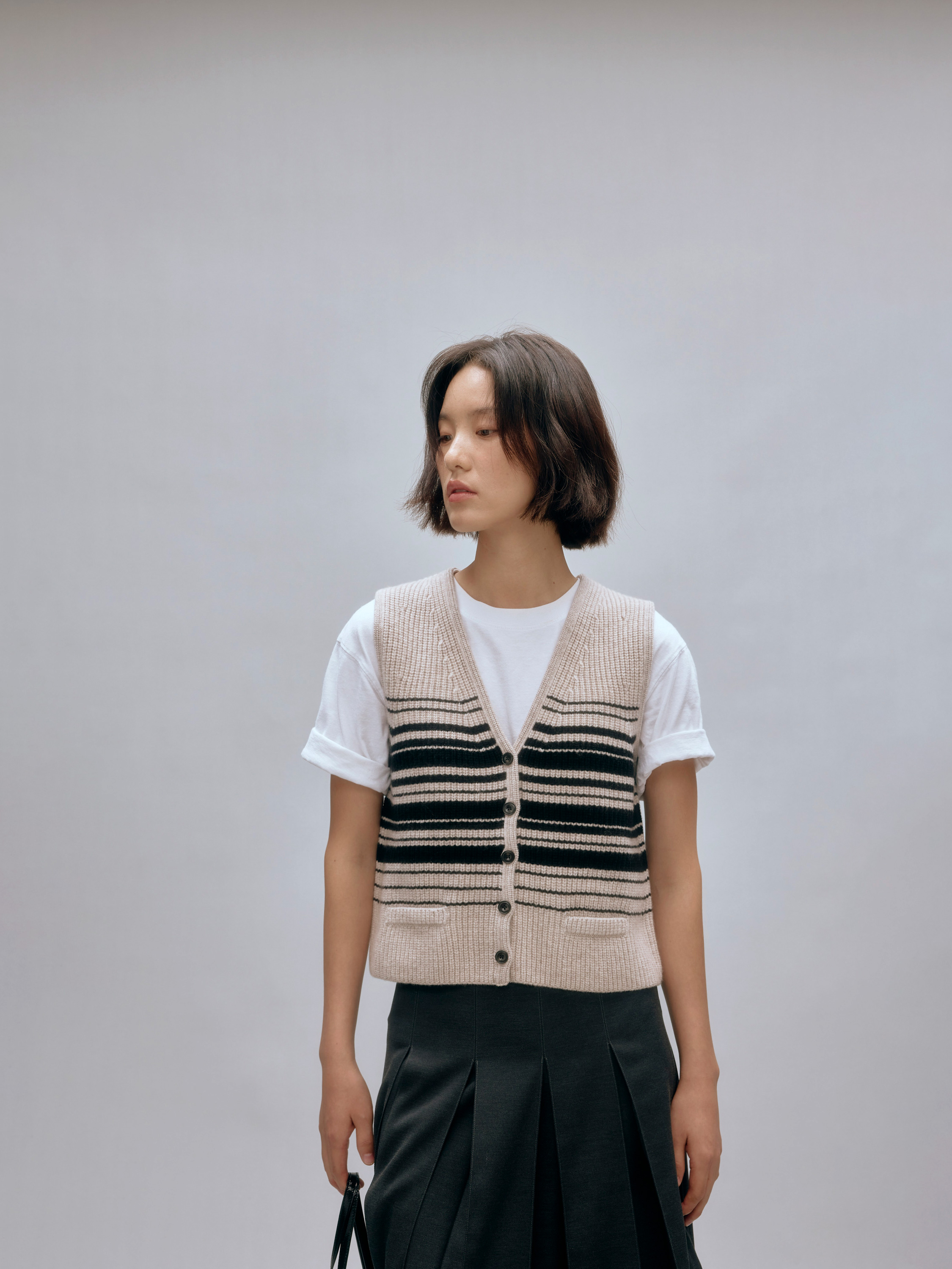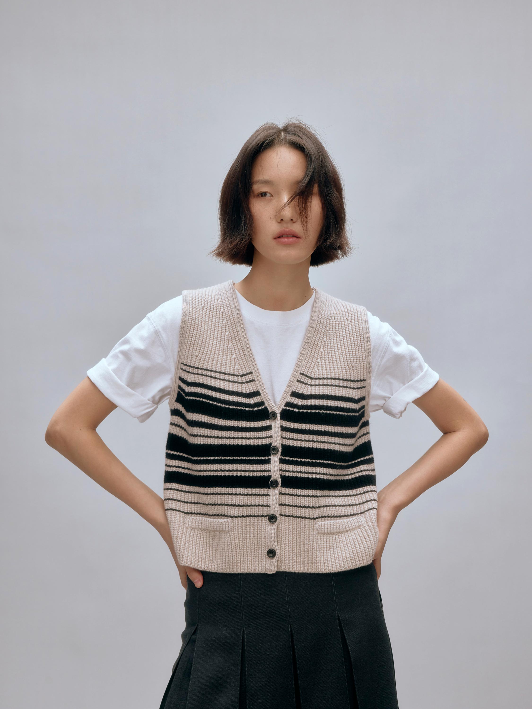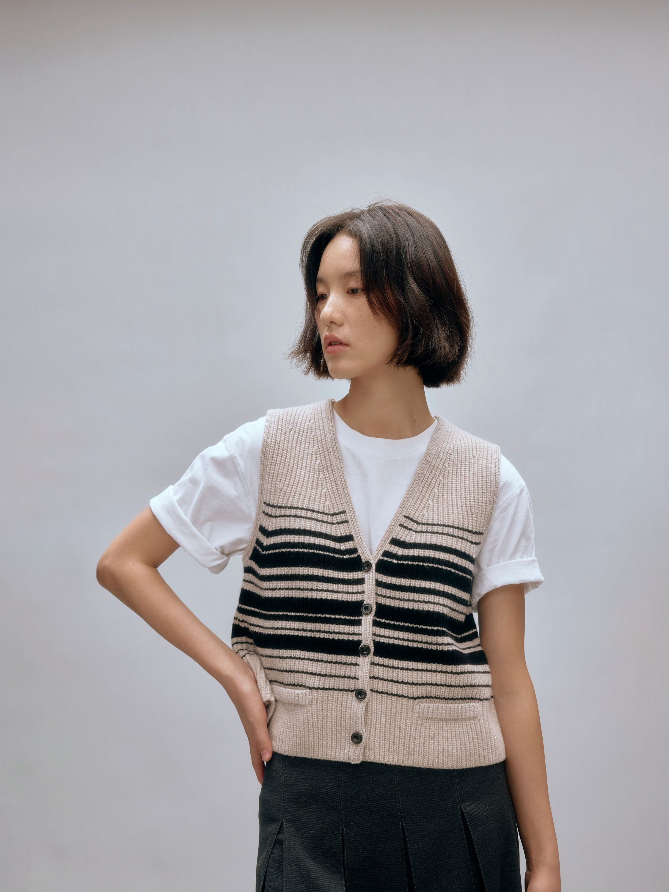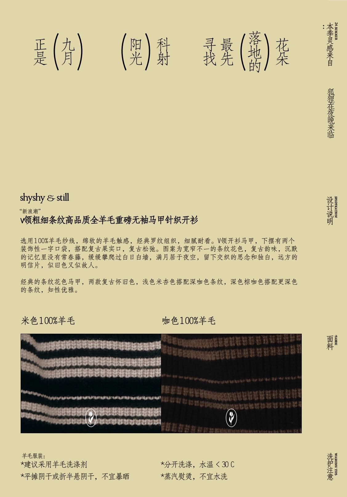 shyshystill/shy202408016/v领粗细条纹高品质全羊毛重磅无袖马甲