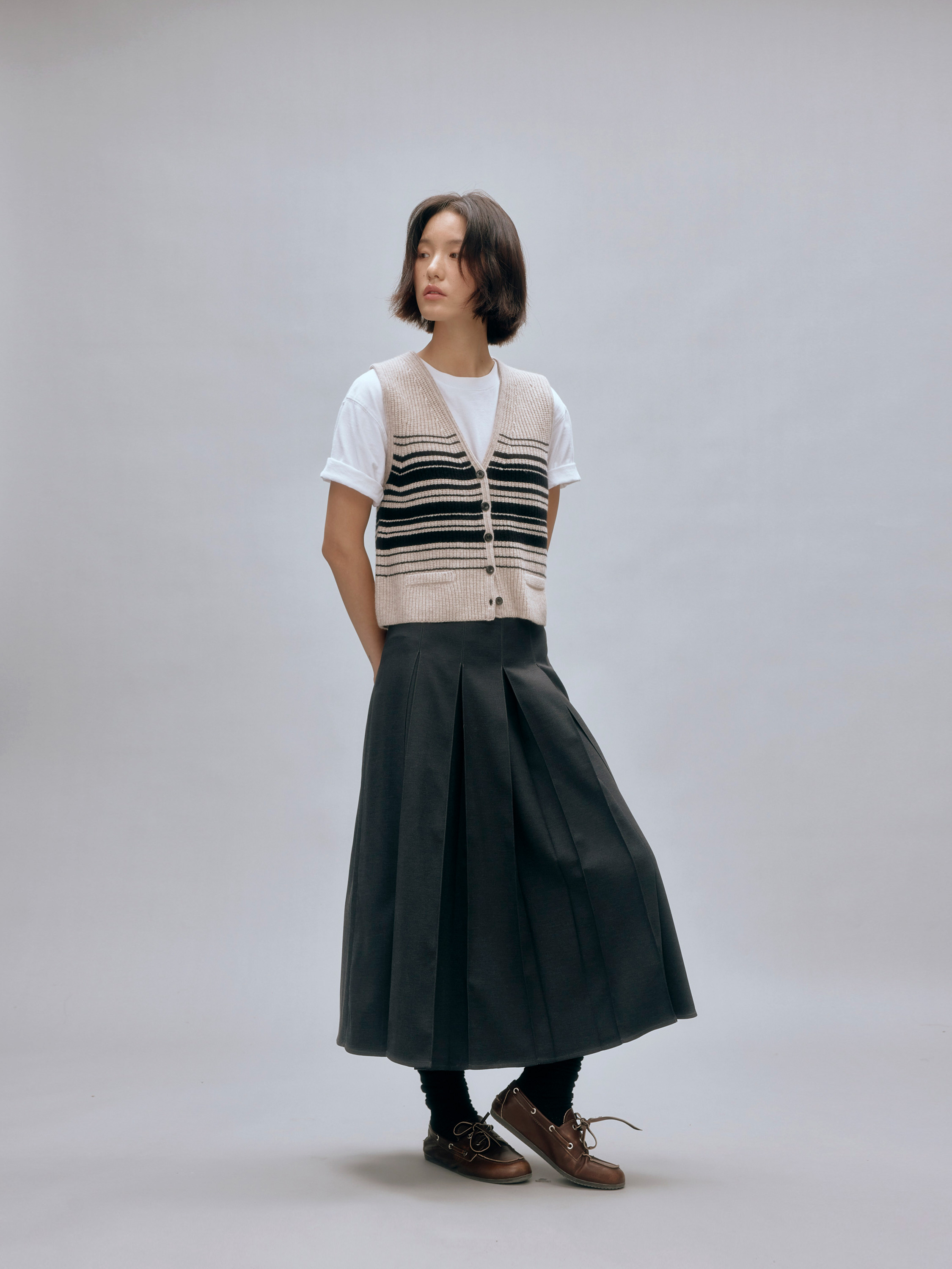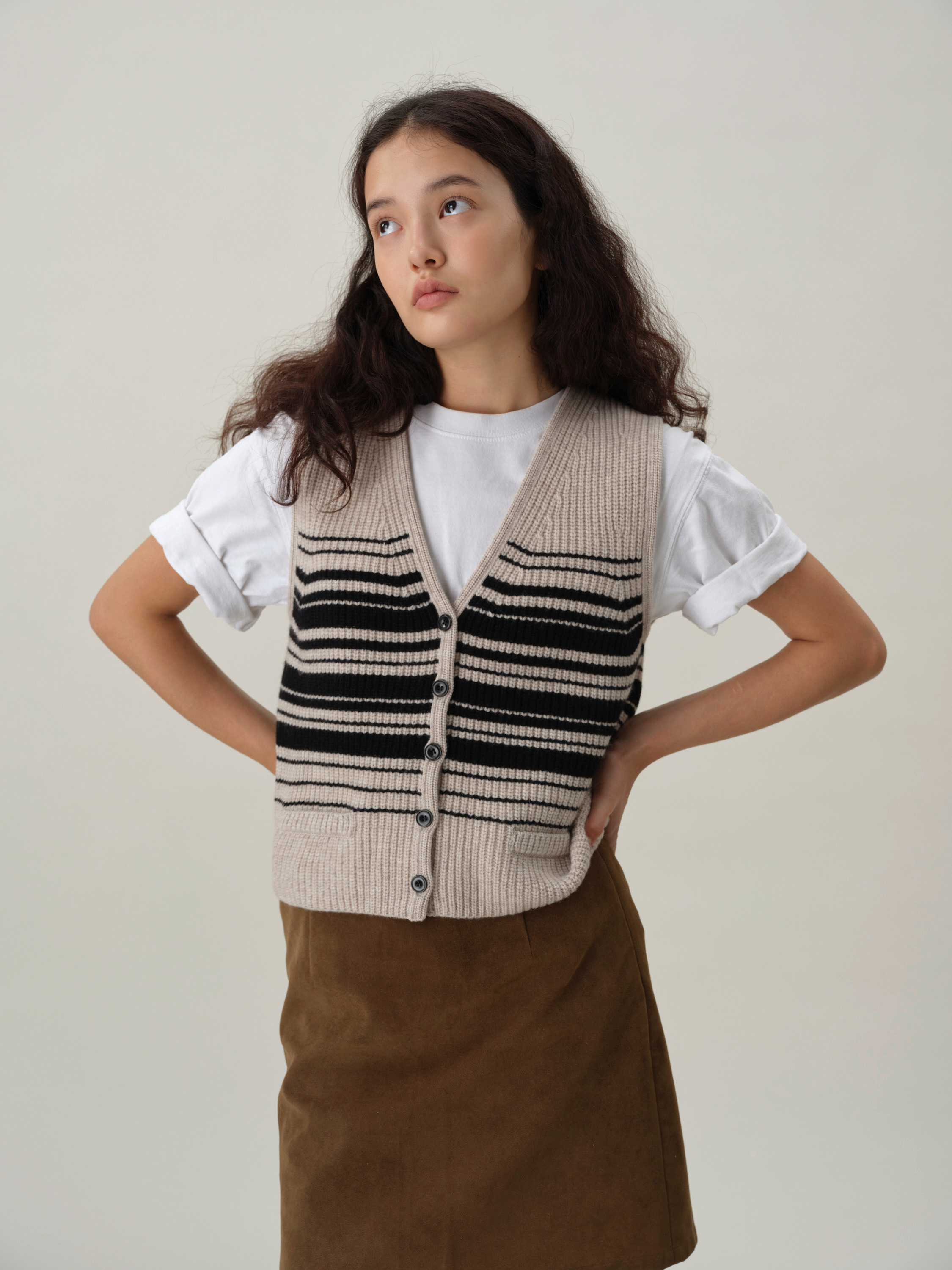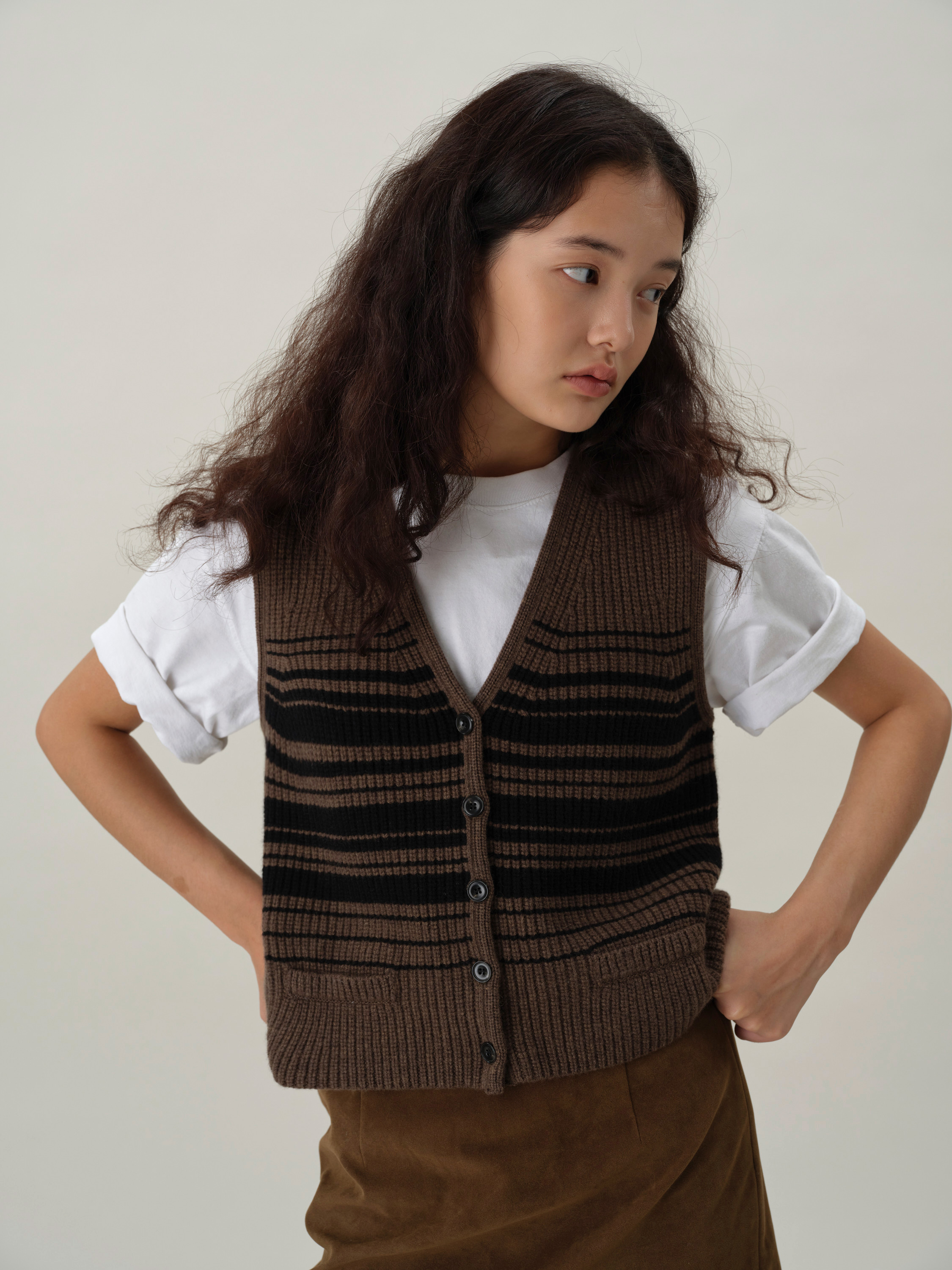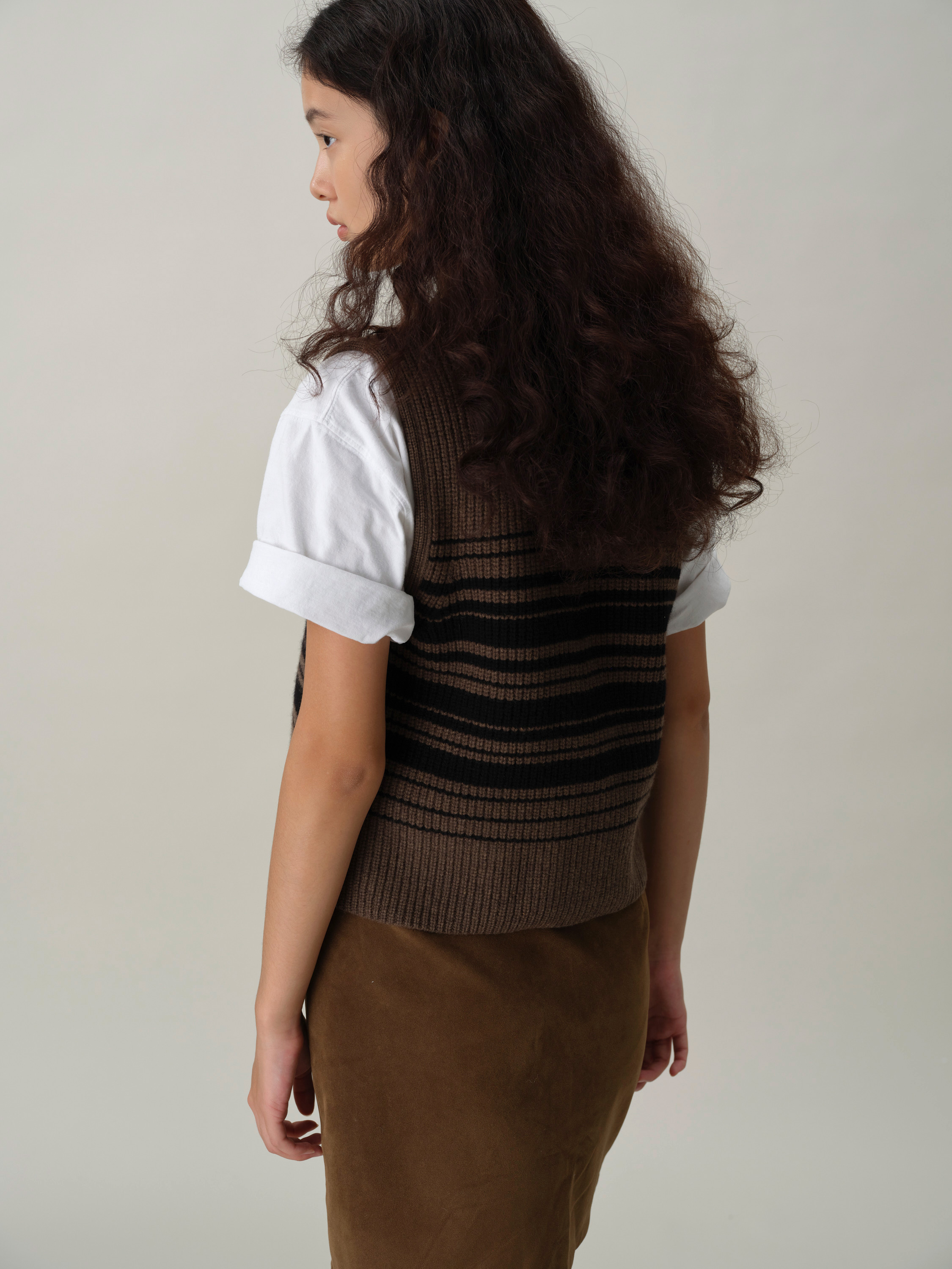 shyshystill/shy202408016/v领粗细条纹高品质全羊毛重磅无袖马甲
