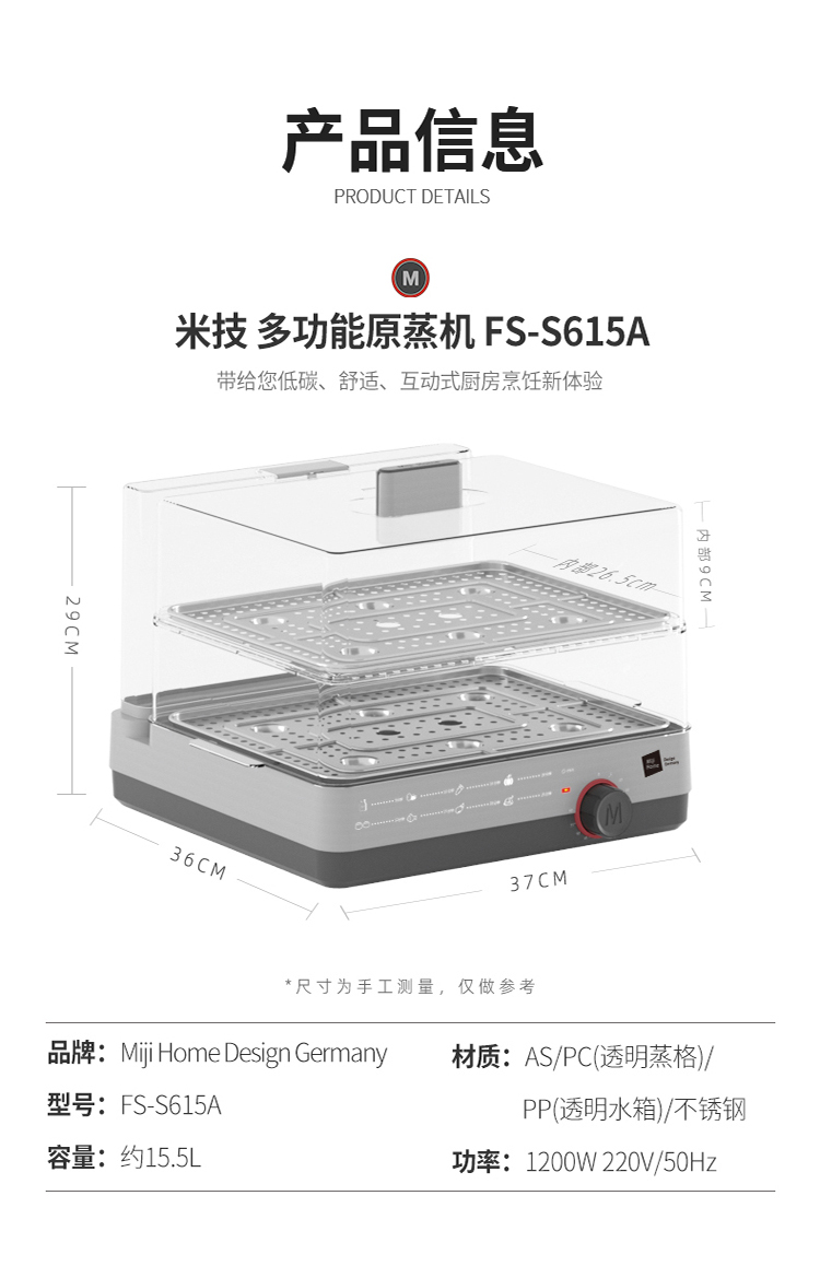 Miji德国米技原蒸机FS-S615A家用蒸汽料理机电蒸锅大容量蒸汽箱