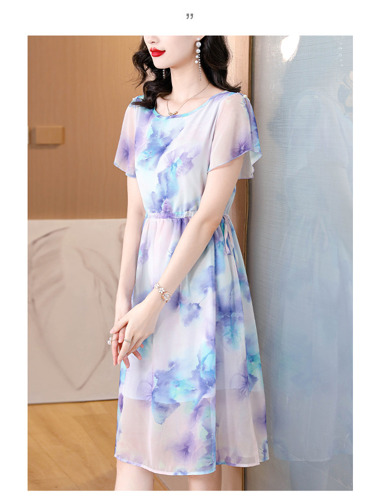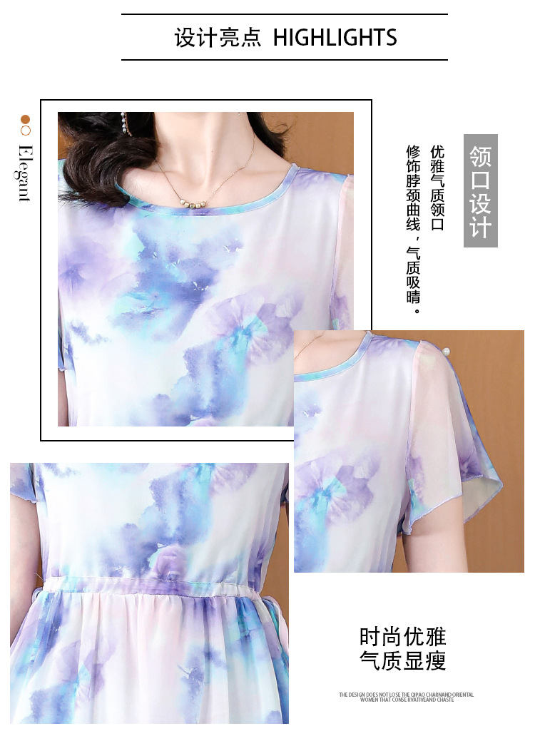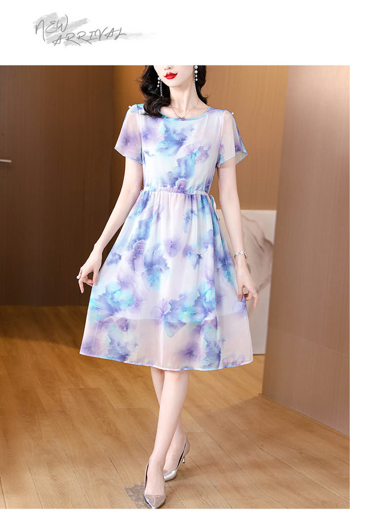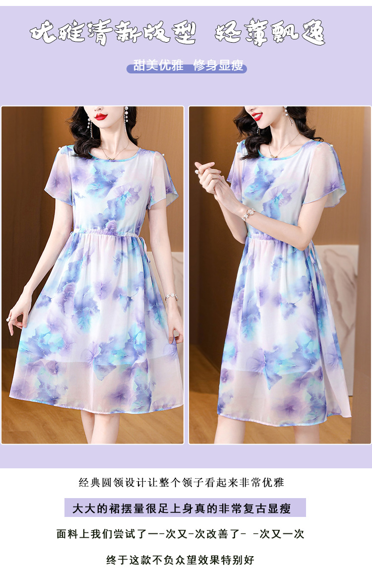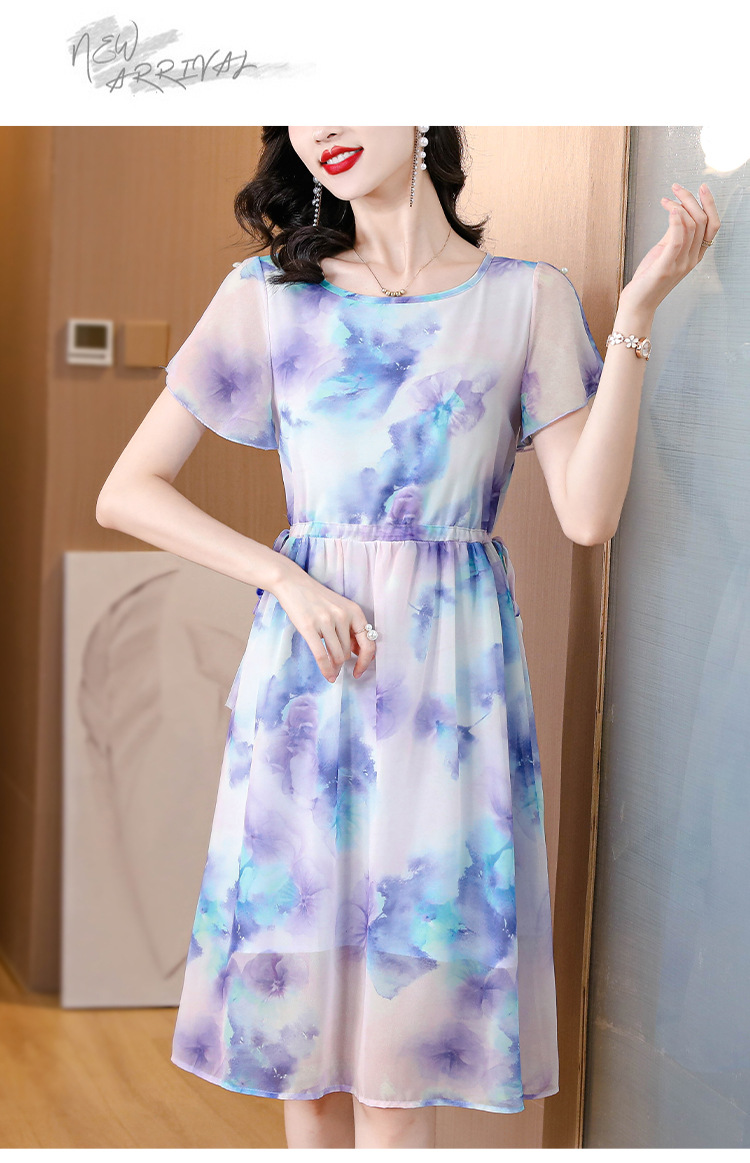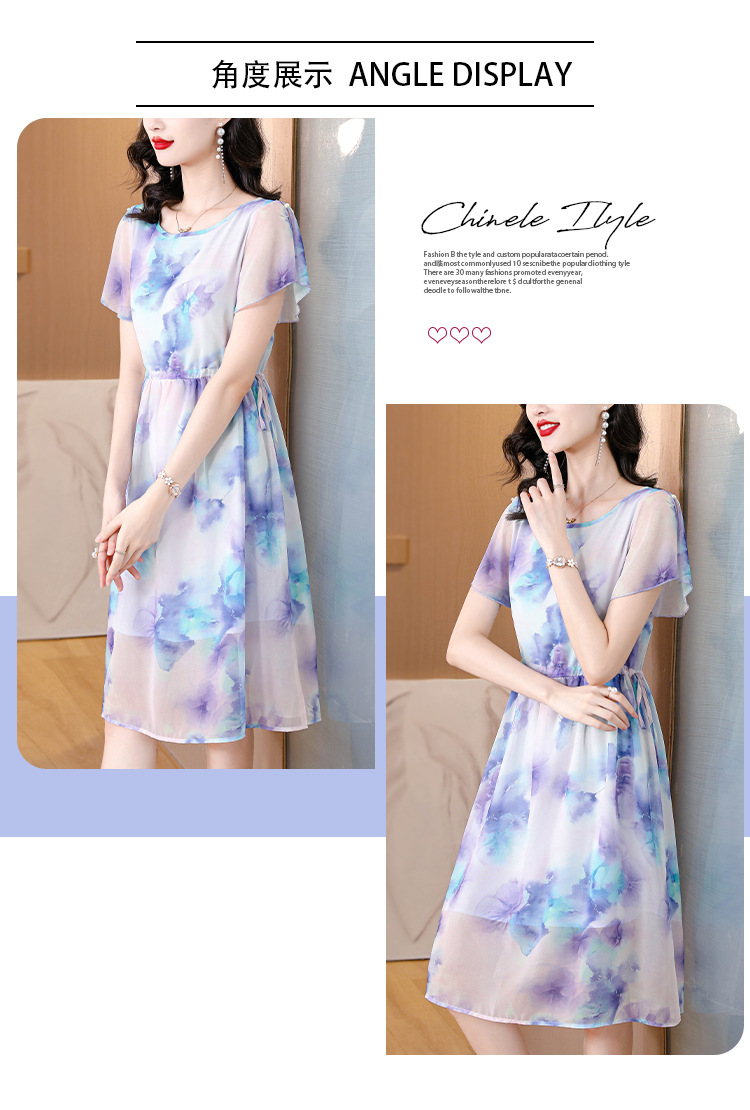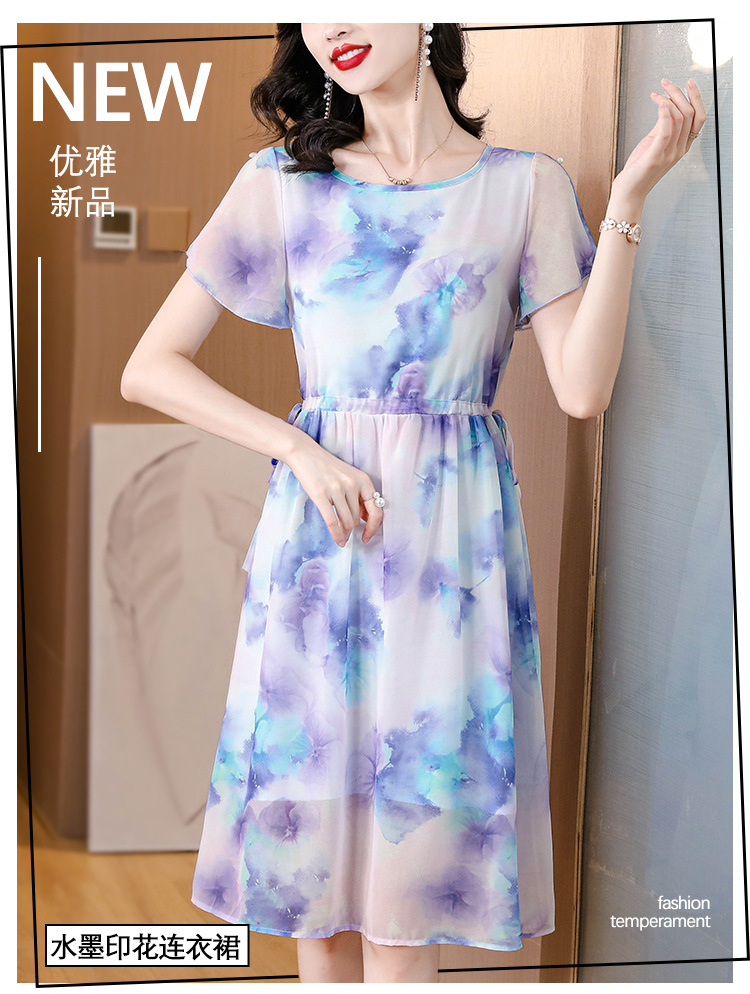 时尚优雅,夏季新款短袖气质收腰水墨印花法式雪纺连衣裙AHM-ybb5059