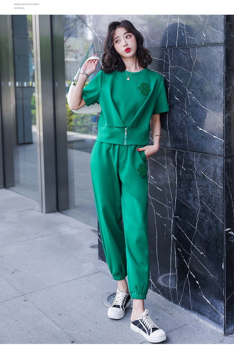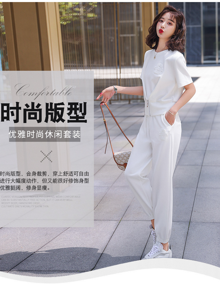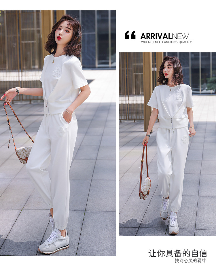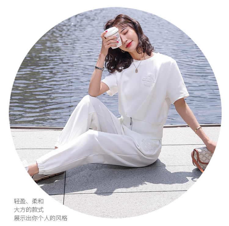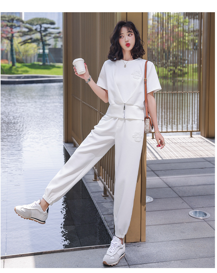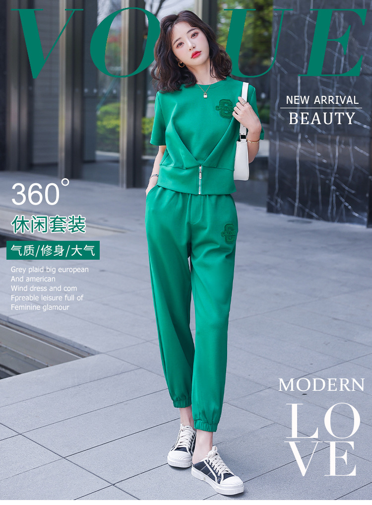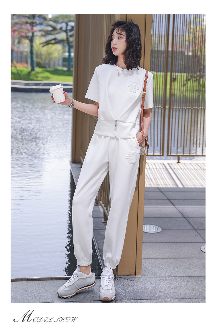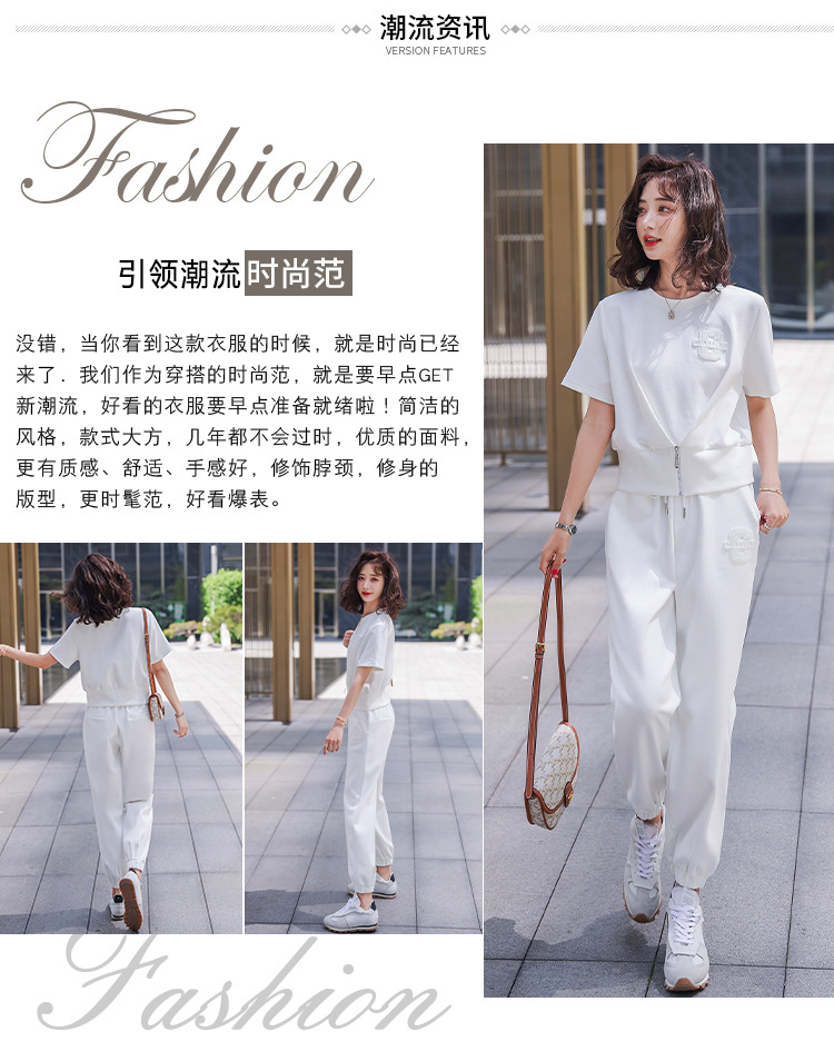 休闲百搭大气时尚,圆领前拉链胸前刺绣字母短款T恤松紧腰套装HR-ANY621