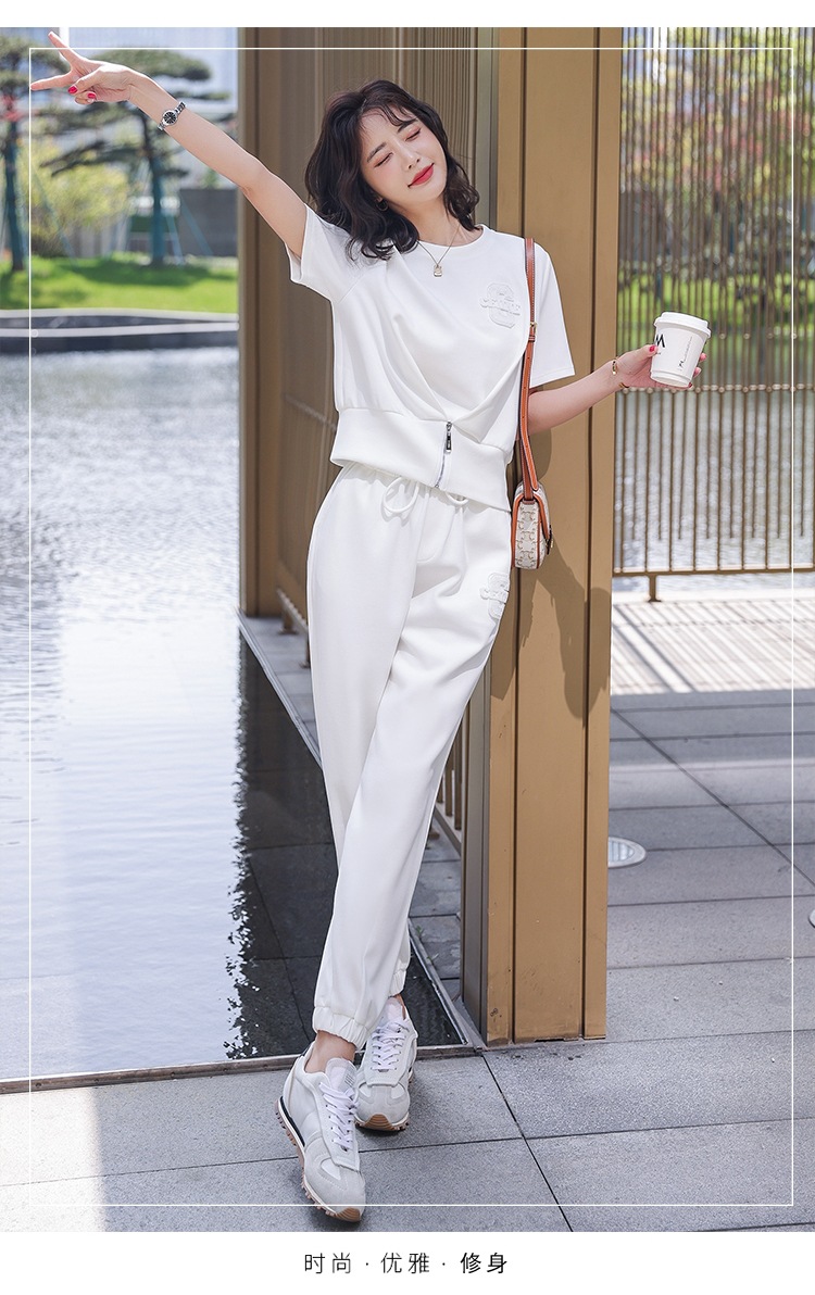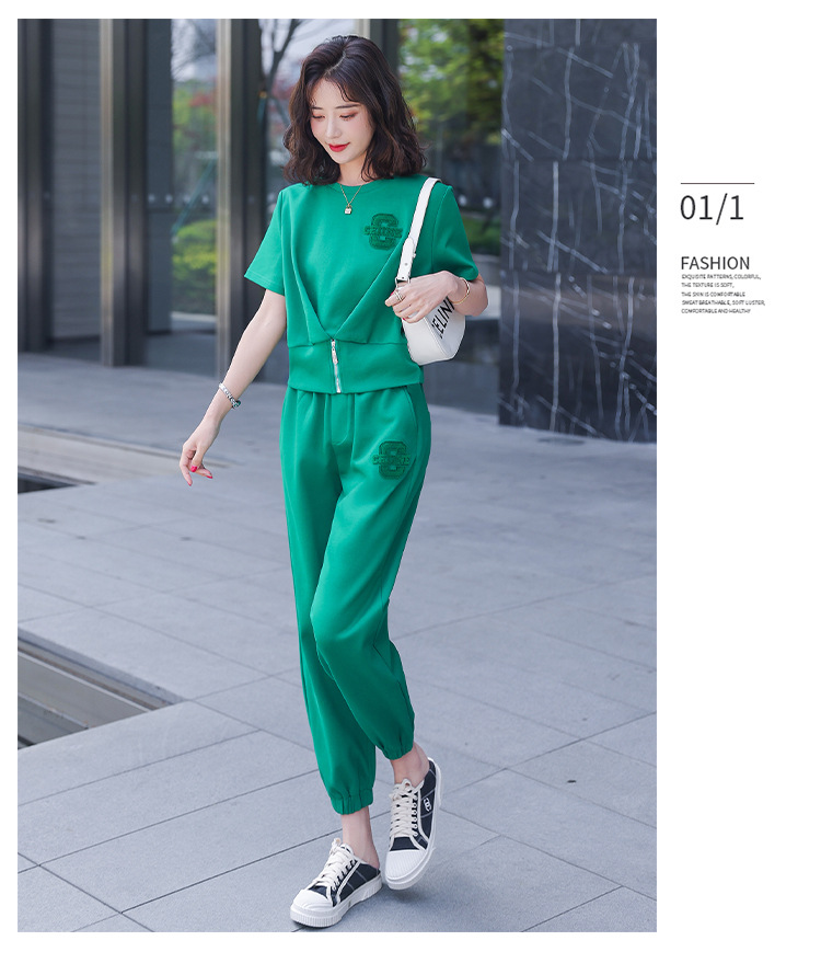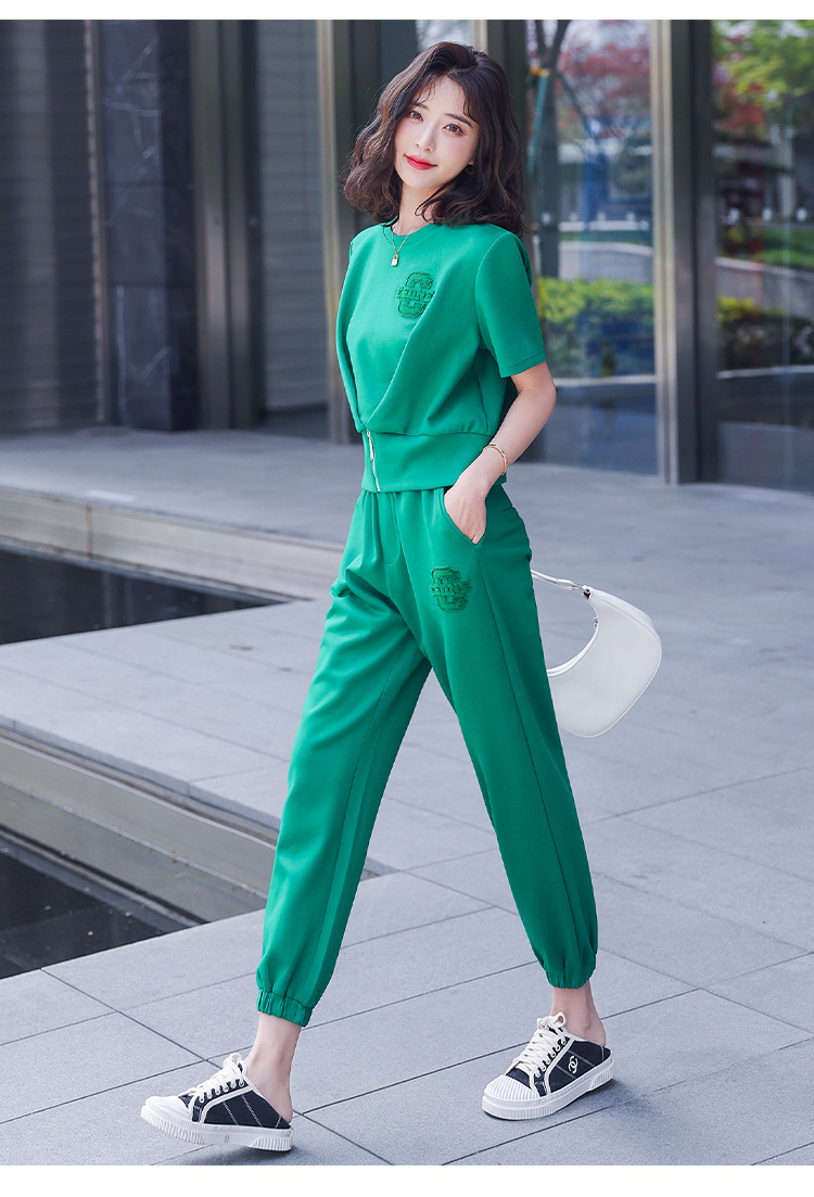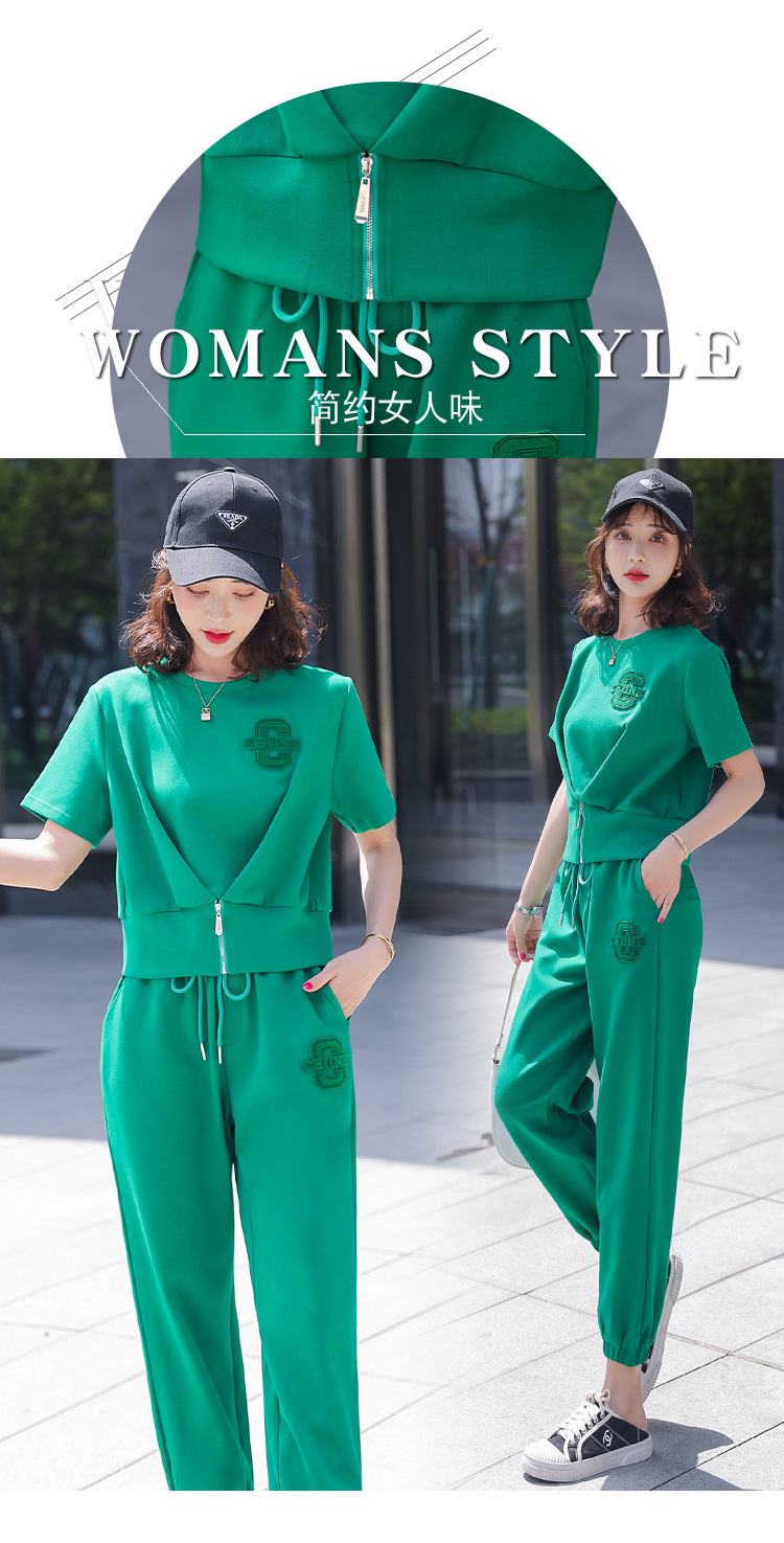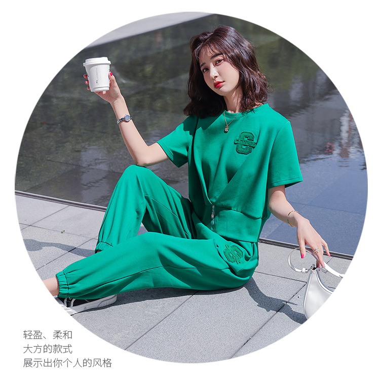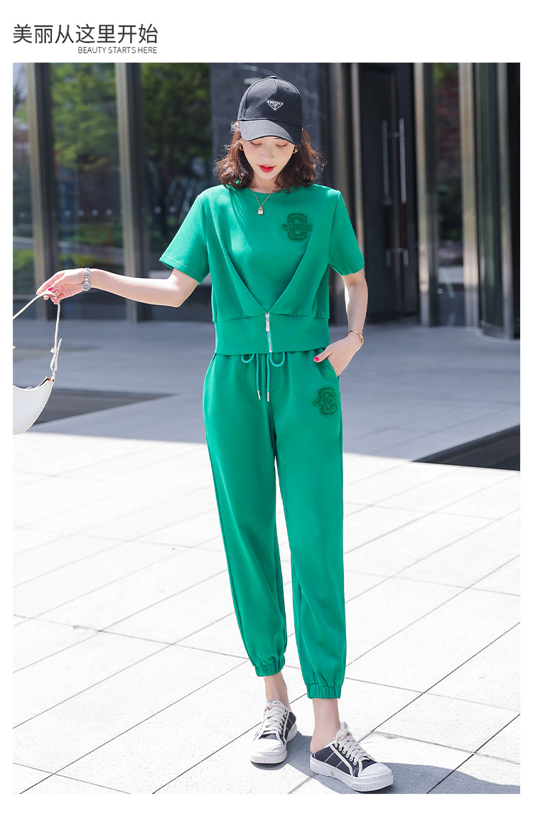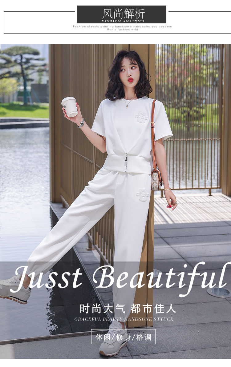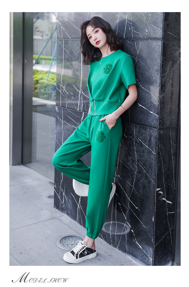 休闲百搭大气时尚,圆领前拉链胸前刺绣字母短款T恤松紧腰套装HR-ANY621