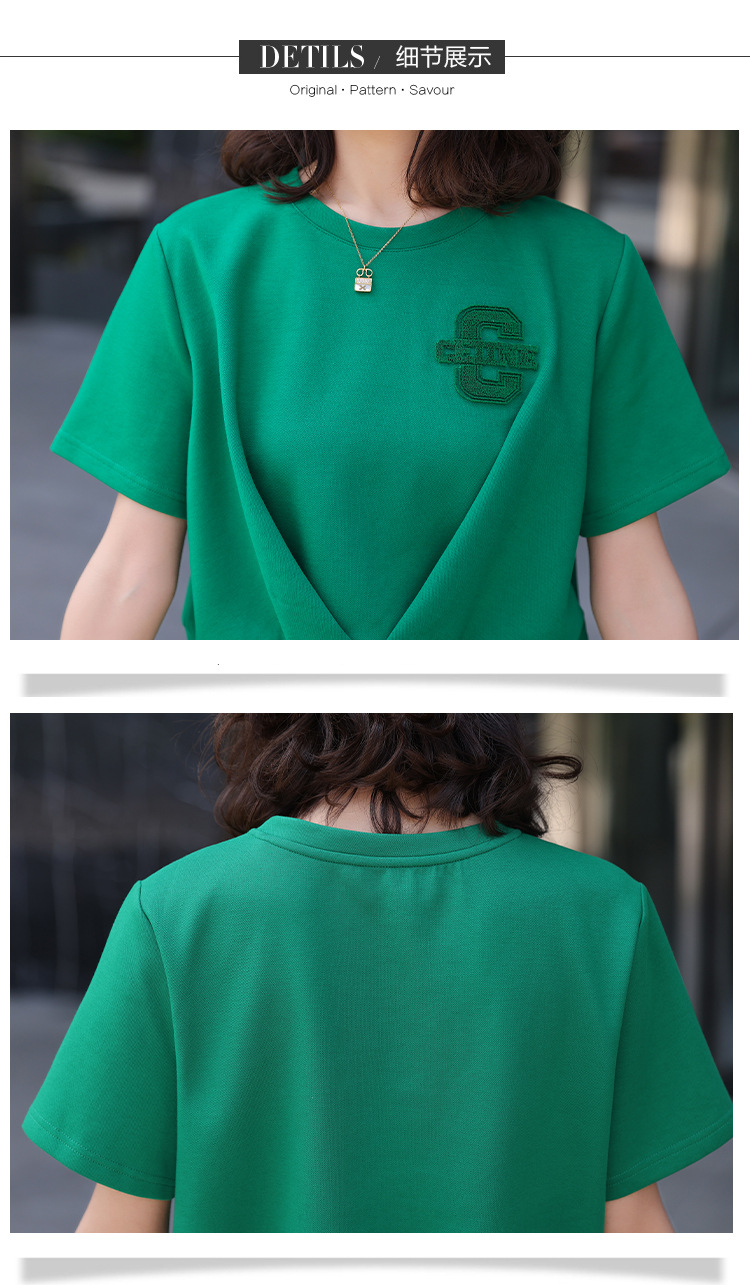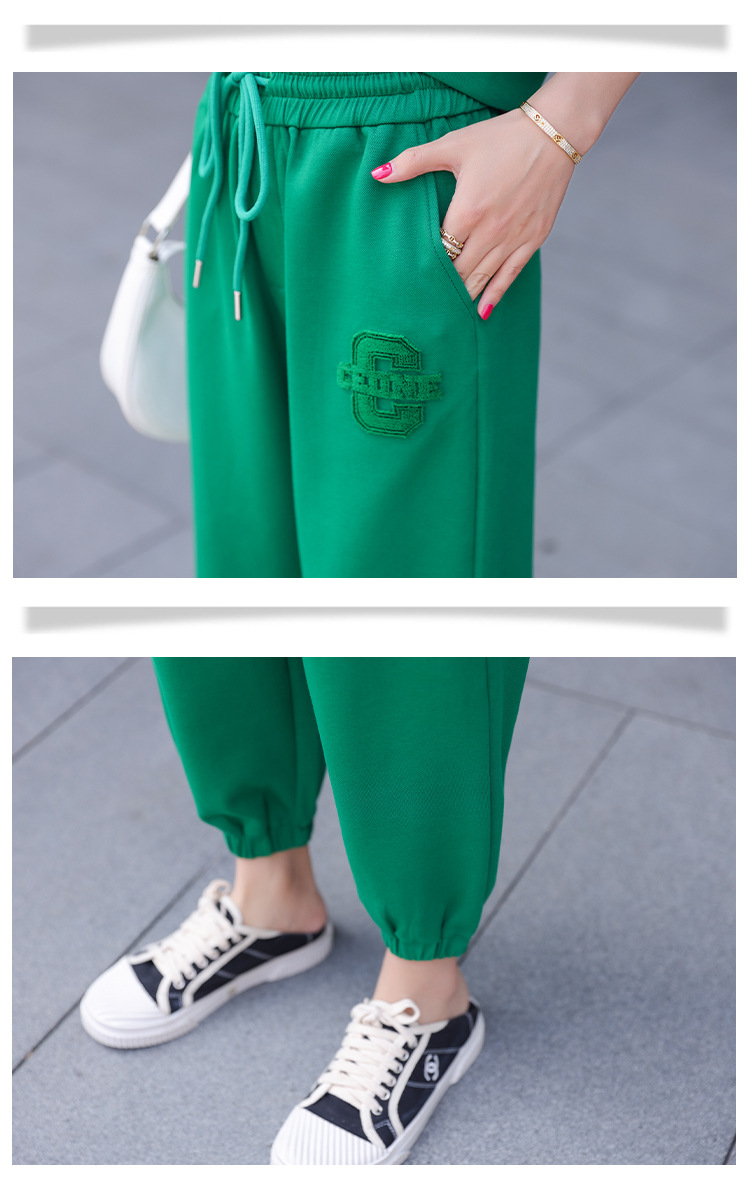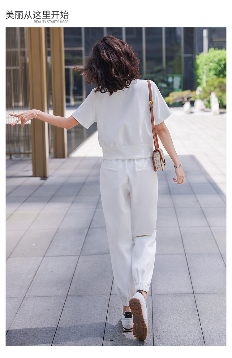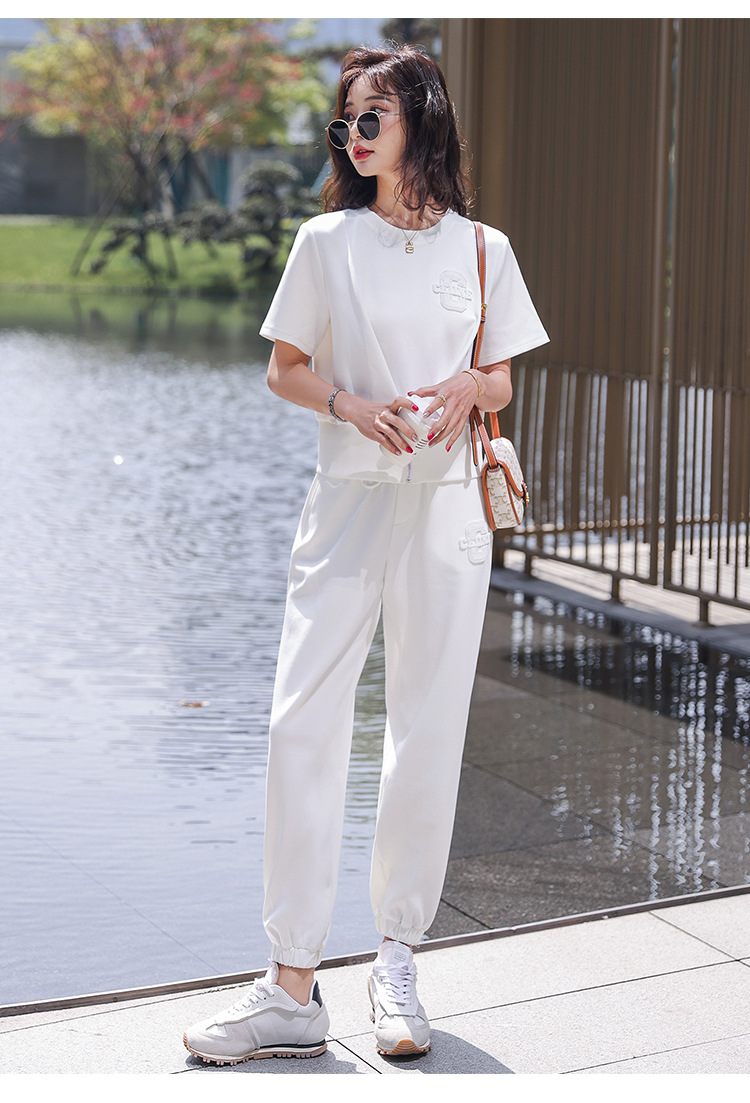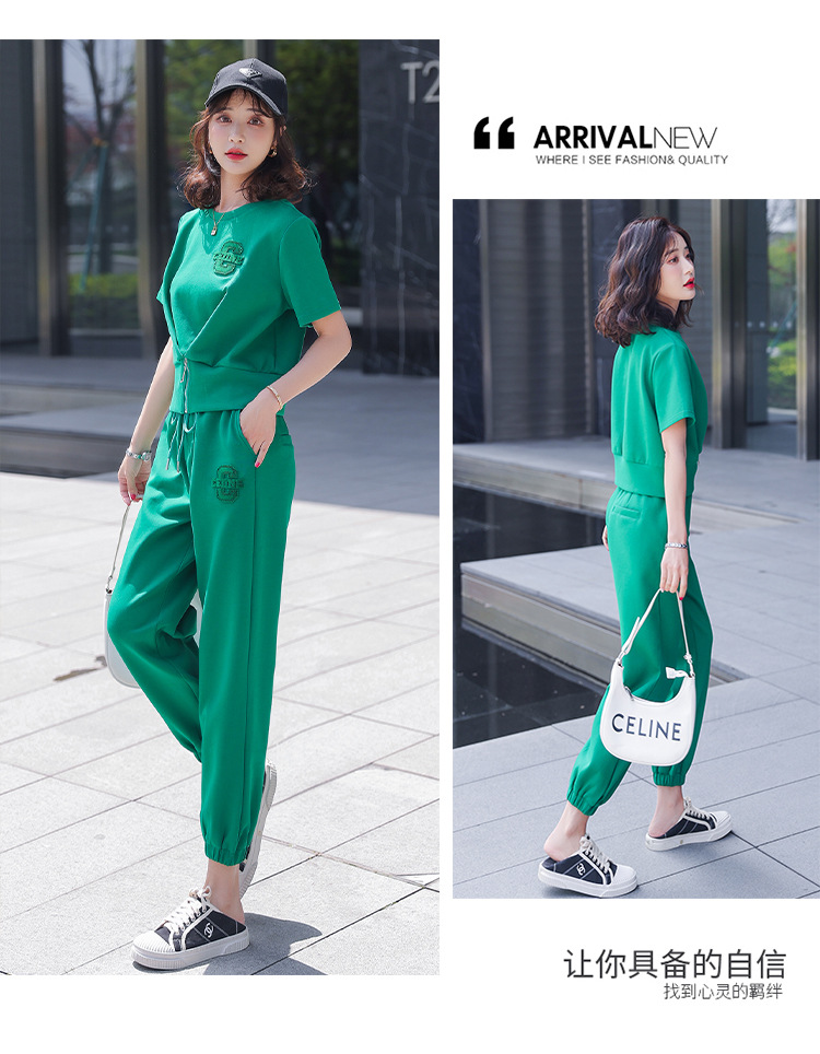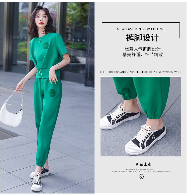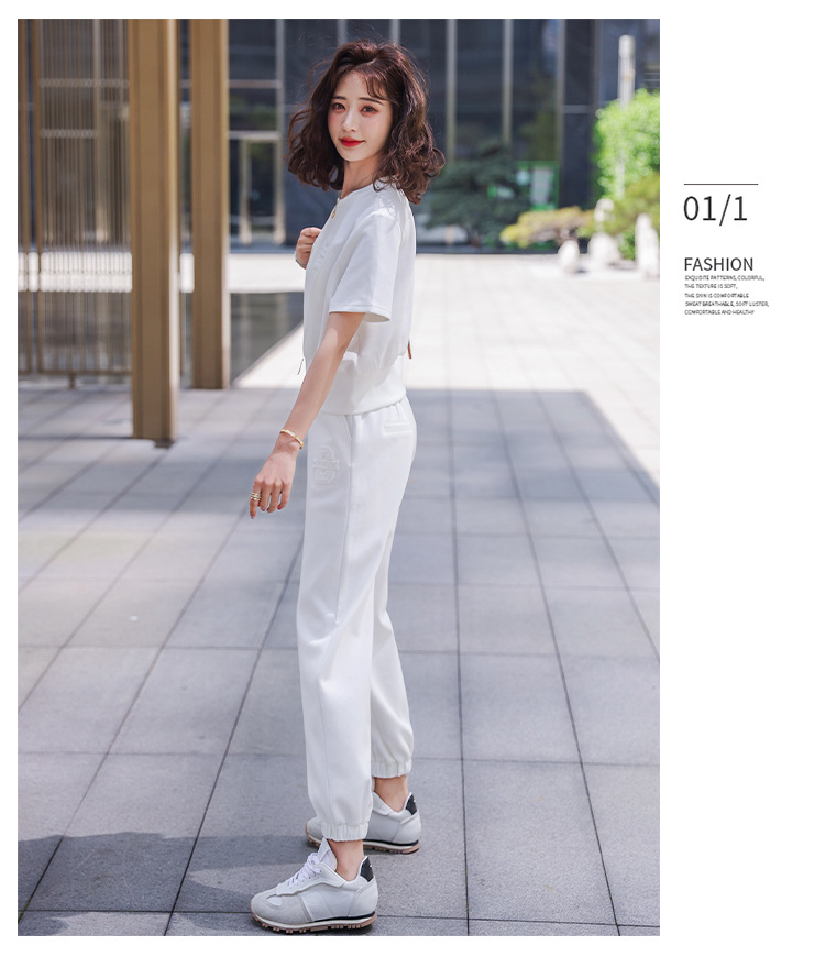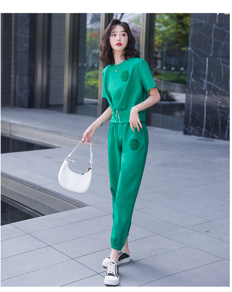 休闲百搭大气时尚,圆领前拉链胸前刺绣字母短款T恤松紧腰套装HR-ANY621