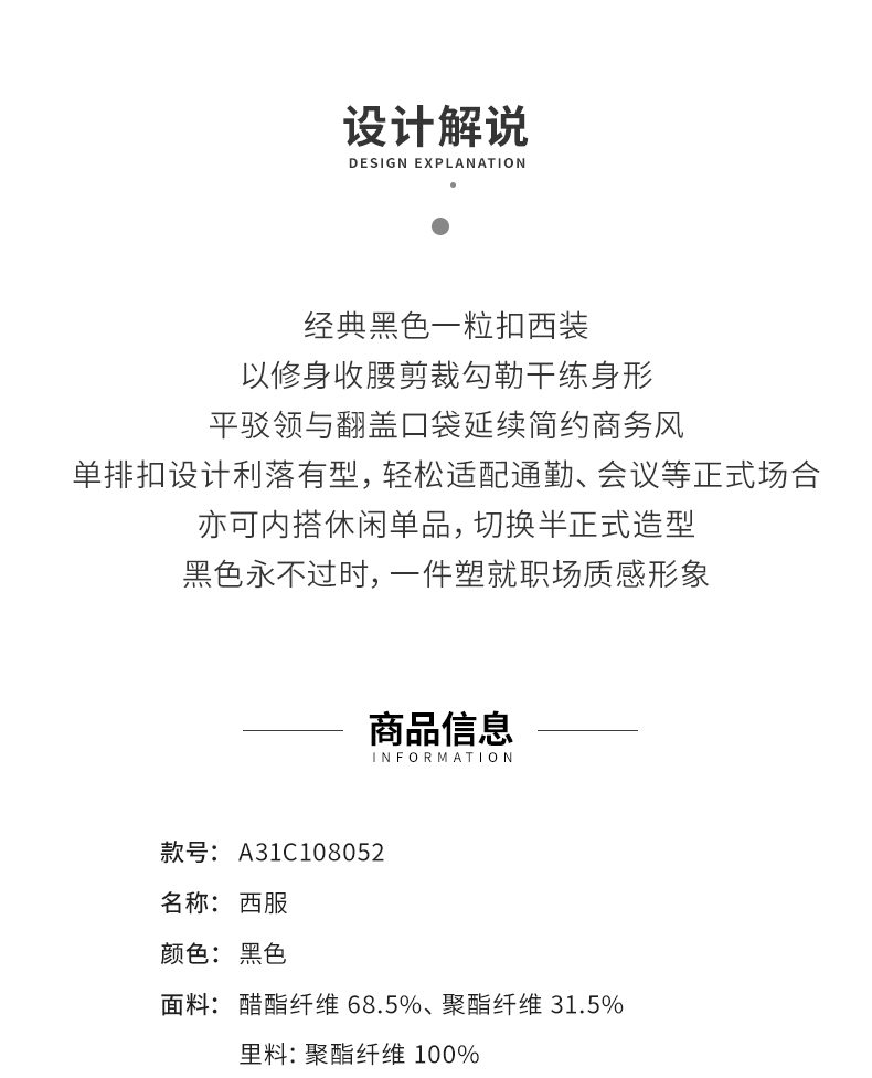 【商场同款】阿菁娜春季新款通勤经典一粒扣西装平驳领收腰剪裁轻松hold住正式场合A31C108052