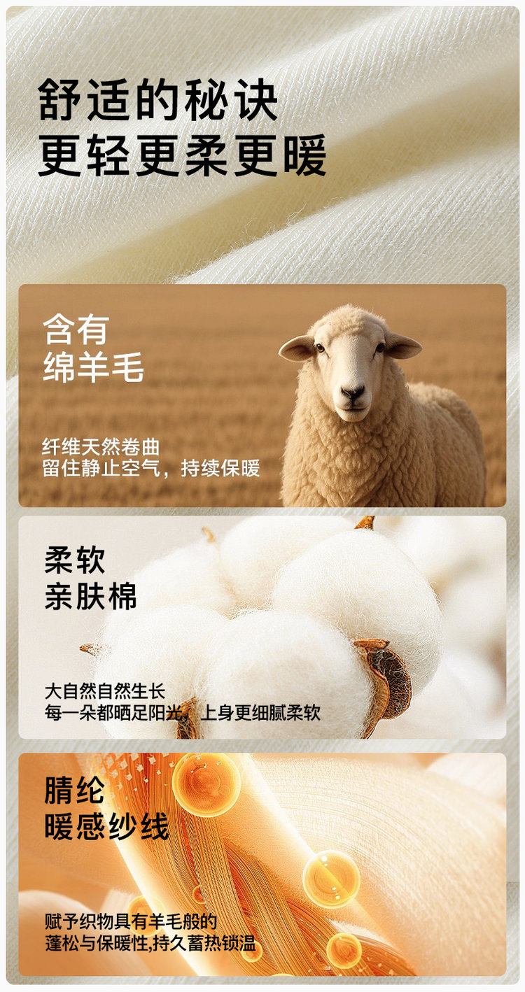 ✅腈纶赋予织物具有羊毛般的蓬松与保暖性,吸湿发热,轻柔亲肤,棉纤维有助于抗起球,亲肤透气,羊毛天然暖感。