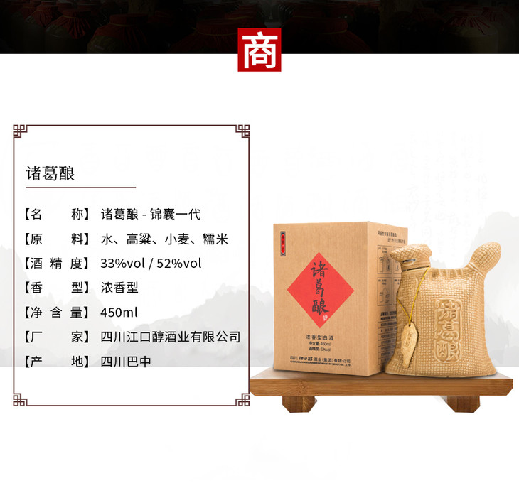 诸葛酿 珍藏特酿盛世锦囊 33度浓香型白酒 酒中妙品 52度450ml纯粮酿造酒水