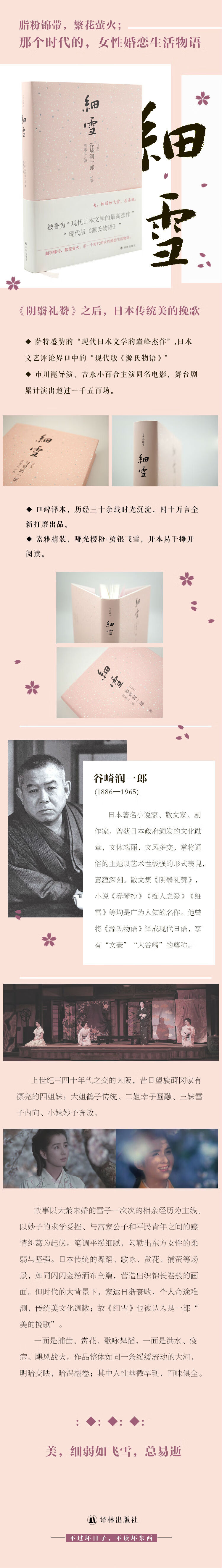 《细雪》是日本唯美主义文学大师谷崎润一郎的代表作长篇小说,曾获“每日出版文化奖”“朝日文化奖”。作品在第二次世界大战期间开始连载,曾被认为有“反战”意图而一度遭日本军方禁止。后多次改编为影视作品,其中市川昆导演、吉永小百合主演的同名电影堪称经典;舞台剧累计演出超过一千五百场。法国文学家萨特盛赞本书是“现代日本文学的巅*杰作”,日本评论界誉之为“现代版的《源氏物语》”。