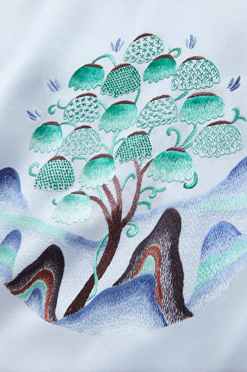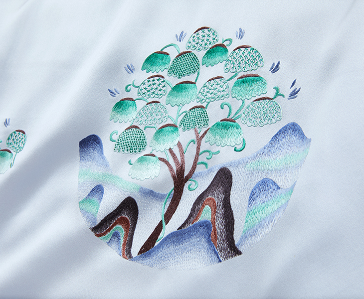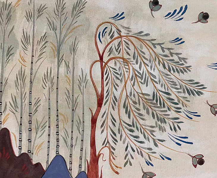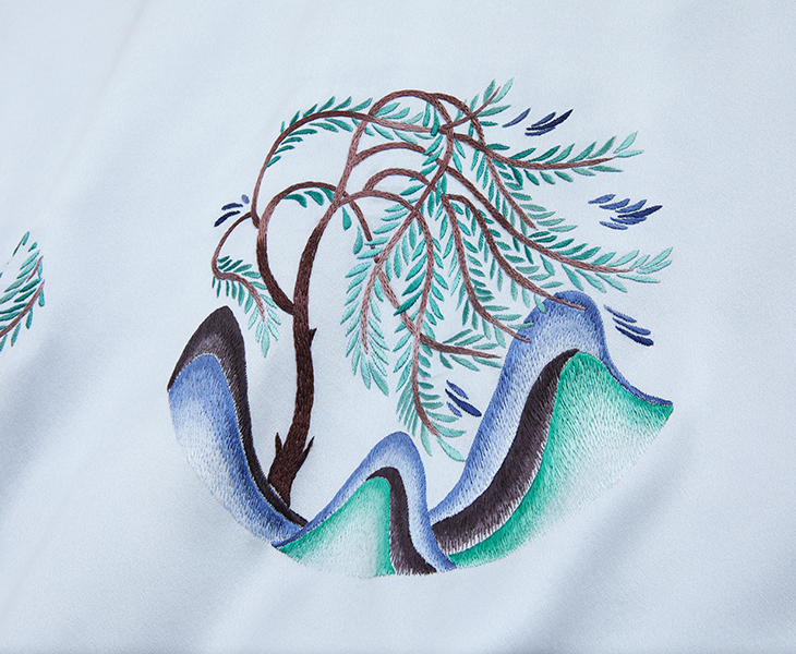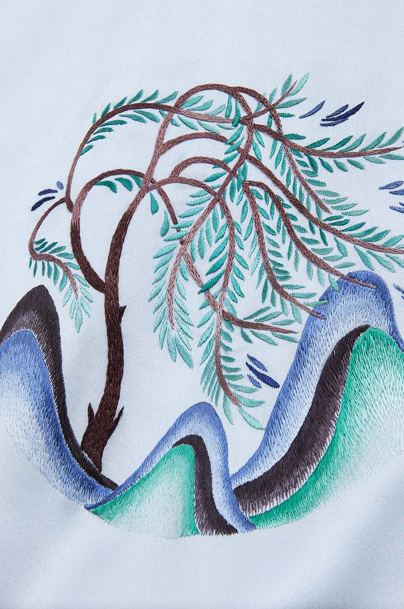 脱胎于敦煌壁画的柳树图案,在色彩上比原图案略微鲜艳,姿态上更加舒展,强调画面的构图和形式,整体感觉清爽、舒朗。