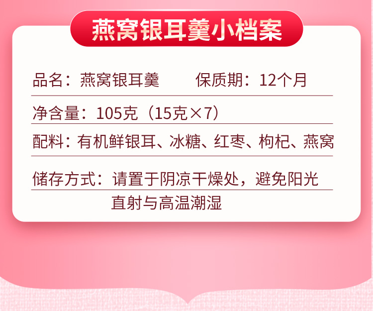 3.燕窝银耳羹收到后请置于阴凉干燥处储存,通常可存放约12个月左右。