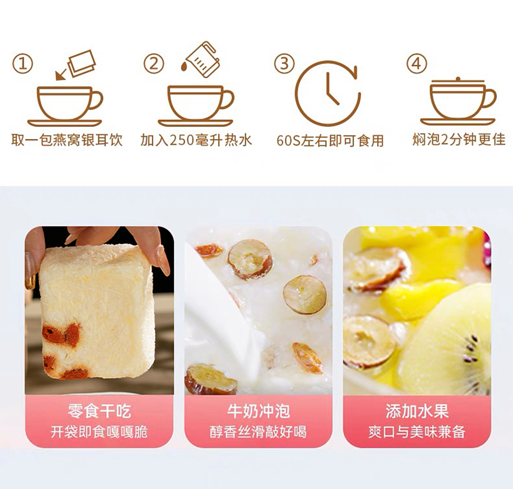 1.冲泡食用:取一小袋15g的燕窝银耳,加250ml开水或热牛奶,冲泡1分钟即可食用;喜欢更软糯口感的朋友,可以再多焖3-5分钟左右。