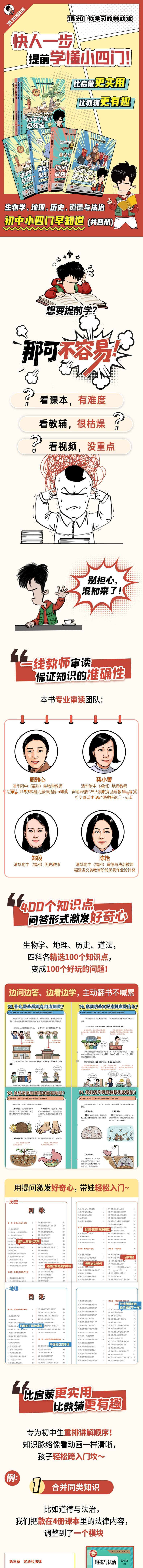 《初中小四门早知道》涵盖初中历史、地理、生物、道德与法治四门学科。这套书紧密贴合教材,系统梳理初中三年的全部重点知识,为学生搭建起完整且清晰的知识框架。每册书的内容讲解都细致入微,还创新性地配备思维导图,将课本知识串联起来,助力学生轻松理解各个知识点,构建系统的知识体系。比如历史分册通过时间轴串联重大历史事件,让历史发展脉络一目了然;地理分册利用详细地图标注关键地理信息,帮助学生理解不同区域的地理特征。书中还采用趣味十足的呈现方式激发学习兴趣。道德与法治分册结合热门社会事件解读法律知识与道德准则,生物分册则展示变色龙变色机制等有趣现象,让学生从被动学习转为主动探索。