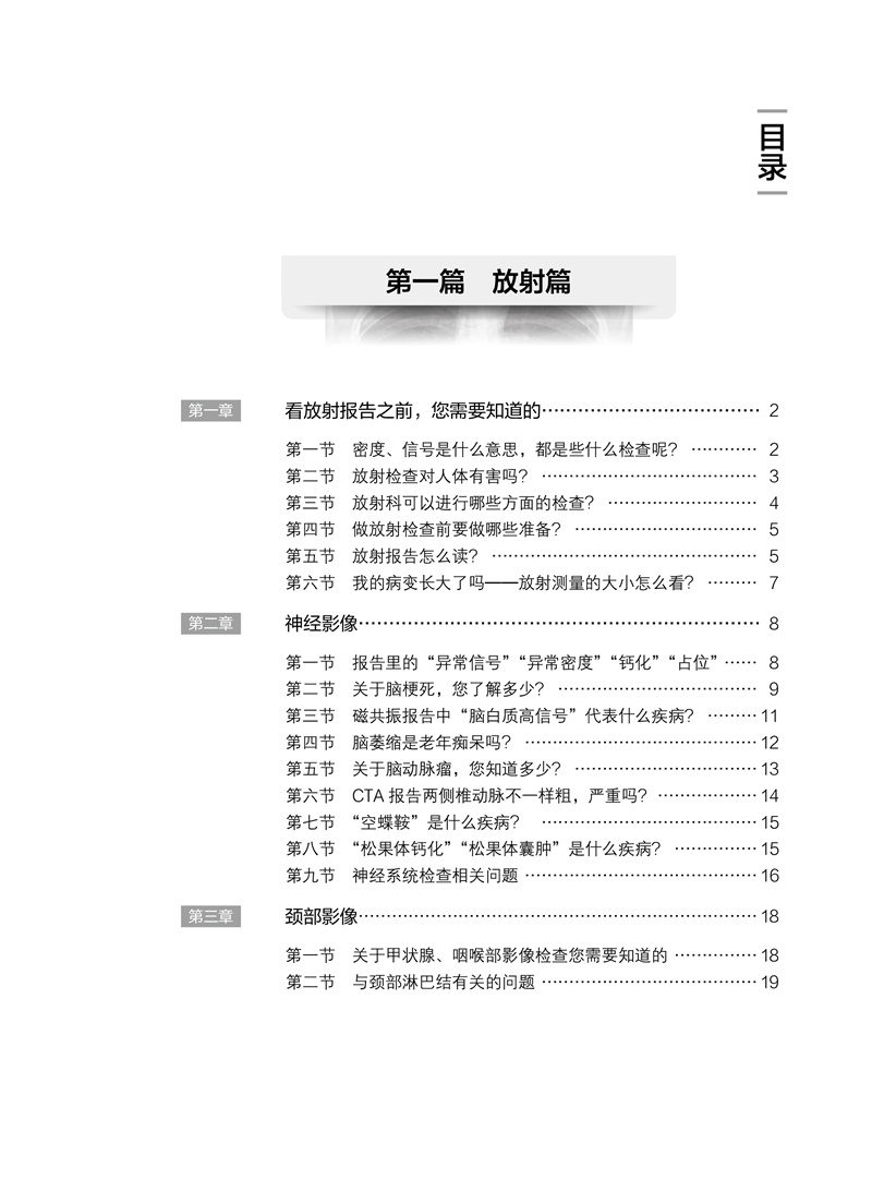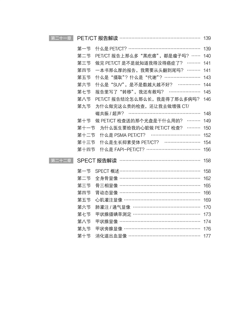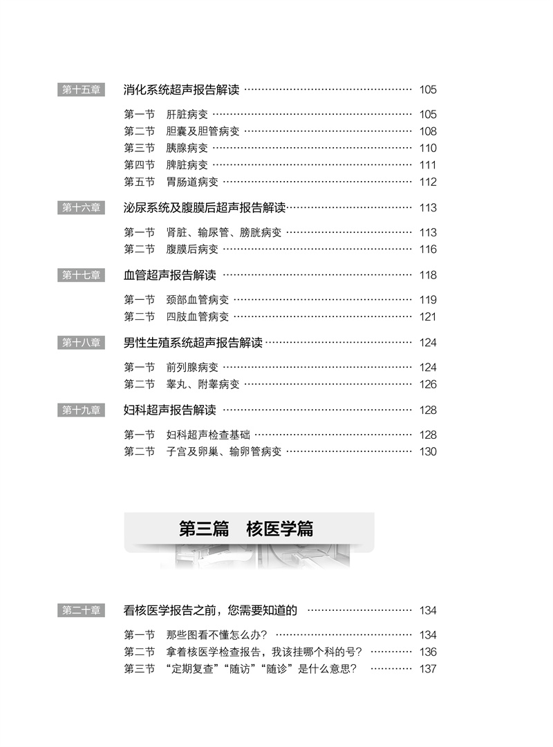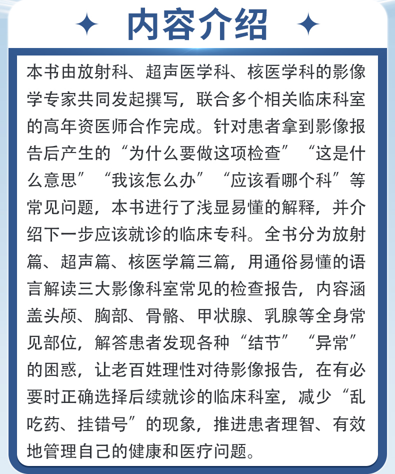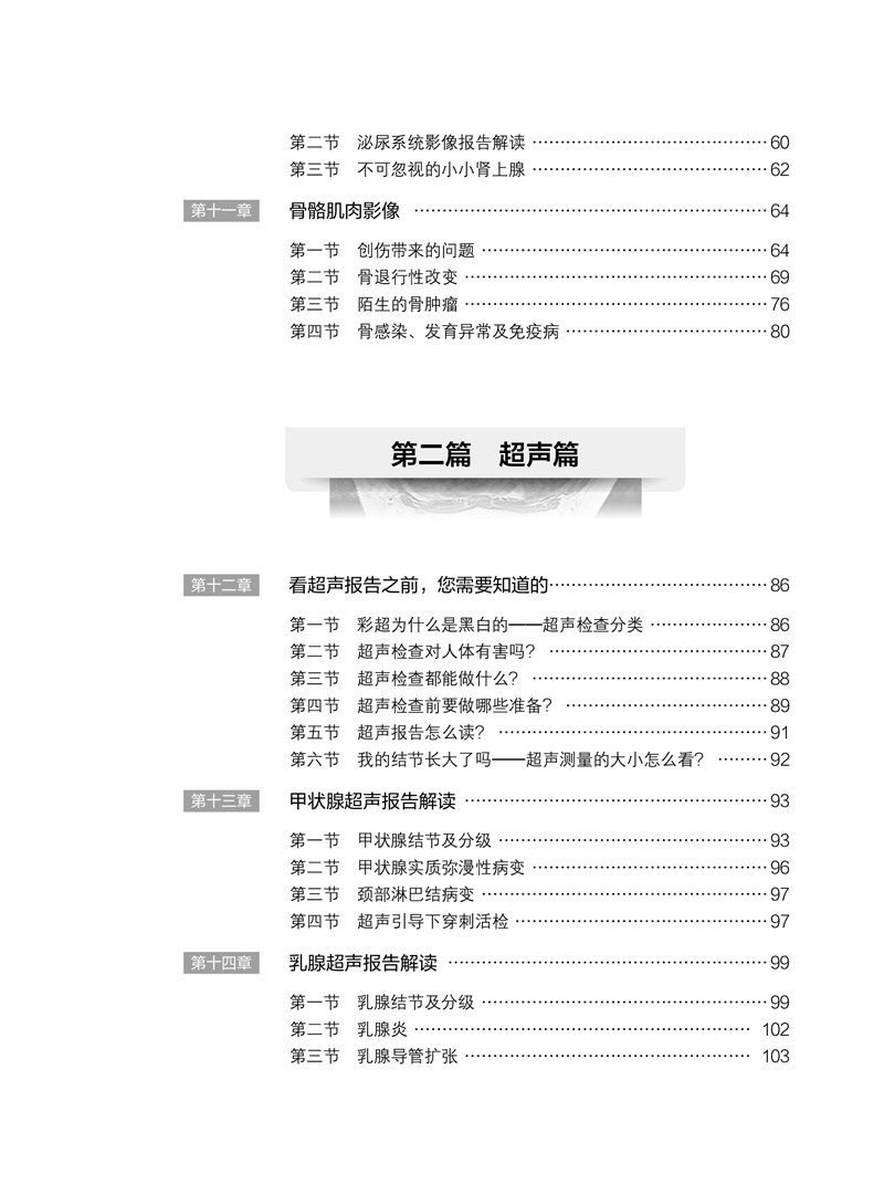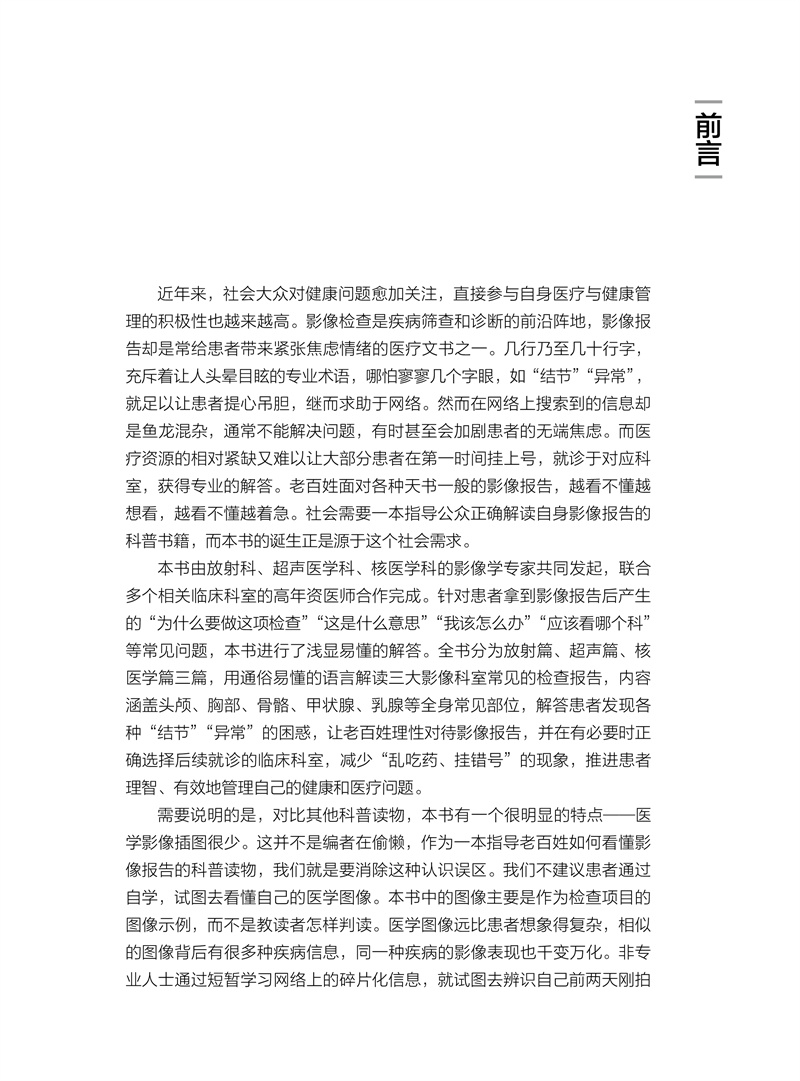 本书由放射科、超声医学科、核医学科的影像学专家共同发起撰写,联合多个相关临床科室的高年资医师合作完成。针对患者拿到影像报告后产生的“为什么要做这项检查”“这是什么意思”“我该怎么办”“应该看哪个科”等常见问题,本书进行了浅显易懂的解释,并介绍下一步应该就诊的临床专科。全书分为放射篇、超声篇、核医学篇三篇,用通俗易懂的语言解读三大影像科室常见的检查报告,内容涵盖头颅、胸部、骨骼、甲状腺、乳腺等全身常见部位,解答患者发现各种“结节”“异常”的困惑,让老百姓理性对待影像报告,在有必要时正确选择后续就诊的临床科室,减少“乱吃药、挂错号”的现象,推进患者理智、有效地管理自己的健康和医疗问题。