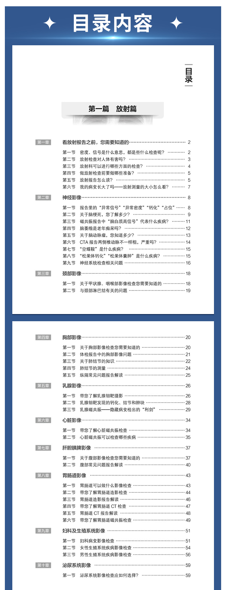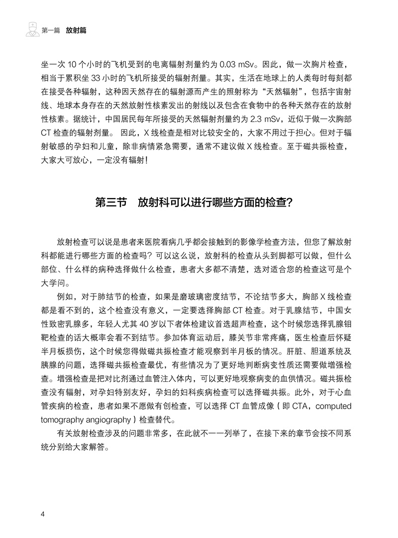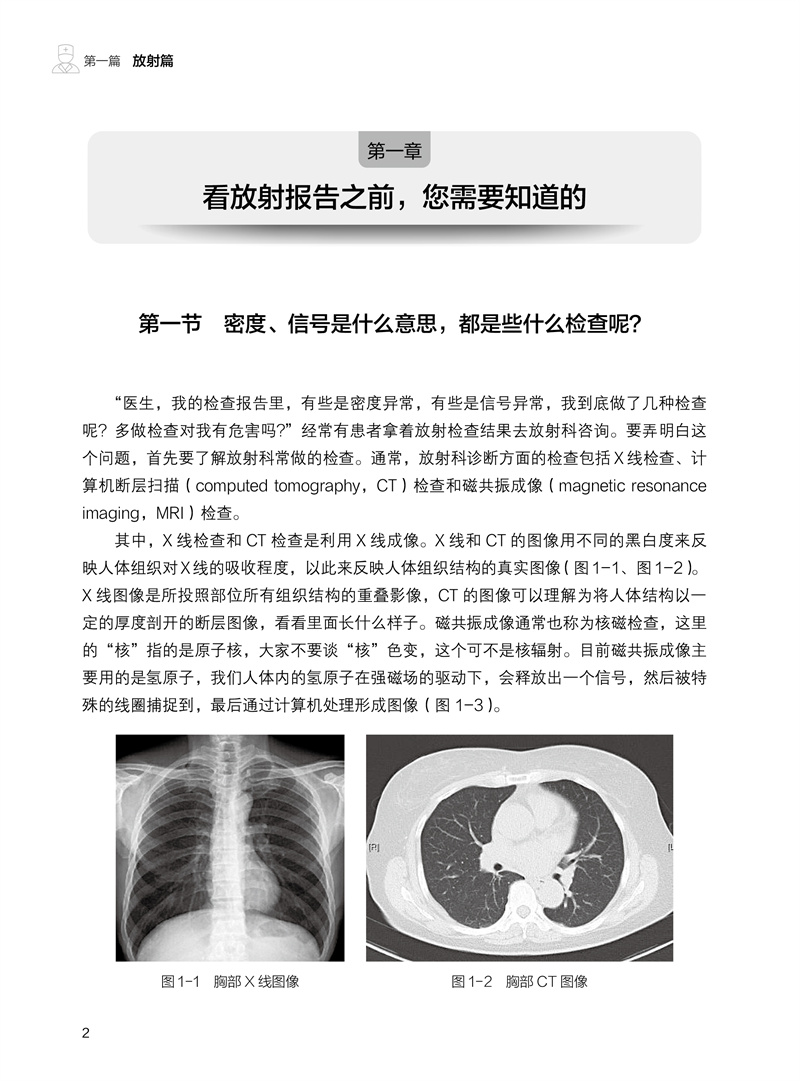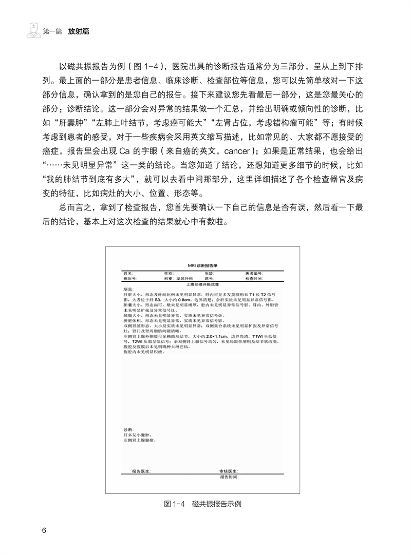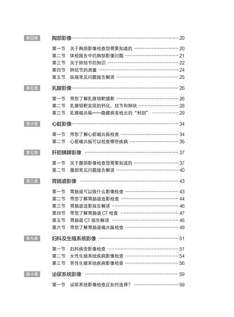 本书由放射科、超声医学科、核医学科的影像学专家共同发起撰写,联合多个相关临床科室的高年资医师合作完成。针对患者拿到影像报告后产生的“为什么要做这项检查”“这是什么意思”“我该怎么办”“应该看哪个科”等常见问题,本书进行了浅显易懂的解释,并介绍下一步应该就诊的临床专科。全书分为放射篇、超声篇、核医学篇三篇,用通俗易懂的语言解读三大影像科室常见的检查报告,内容涵盖头颅、胸部、骨骼、甲状腺、乳腺等全身常见部位,解答患者发现各种“结节”“异常”的困惑,让老百姓理性对待影像报告,在有必要时正确选择后续就诊的临床科室,减少“乱吃药、挂错号”的现象,推进患者理智、有效地管理自己的健康和医疗问题。