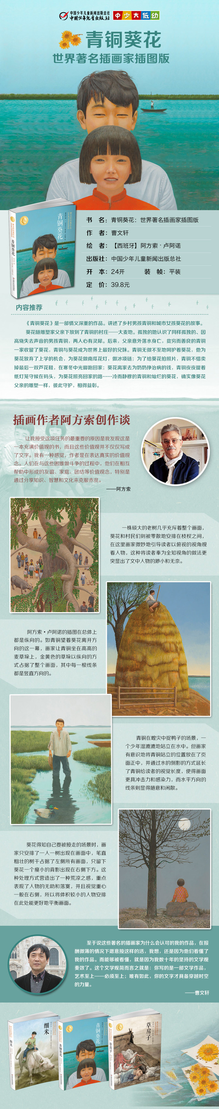 2. 《青铜葵花》是曹文轩*受欢迎的作品之一,自出版以来,长销不衰。曹文轩擅长乡村题材,擅长写情,擅长写困境中人们的守望相助。他不回避苦难,而且总能在苦难中体现人性的温暖。《青铜葵花》就是这样一部无比温暖的作品。