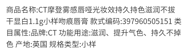 【爆款超低价预售 急单慎拍】CT摩登雾感唇膏1.1g小样吻痕/枕边话 哑光豆沙色口红滋润不干