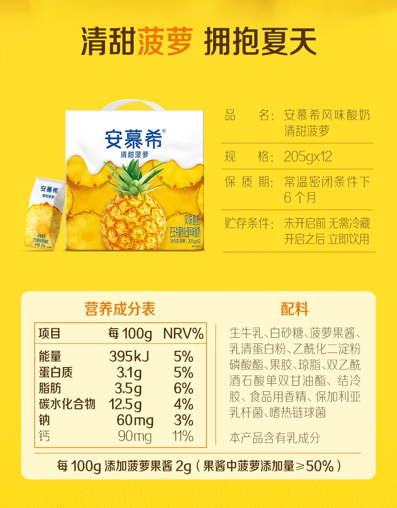 安慕希清甜菠萝味酸奶205g*12盒