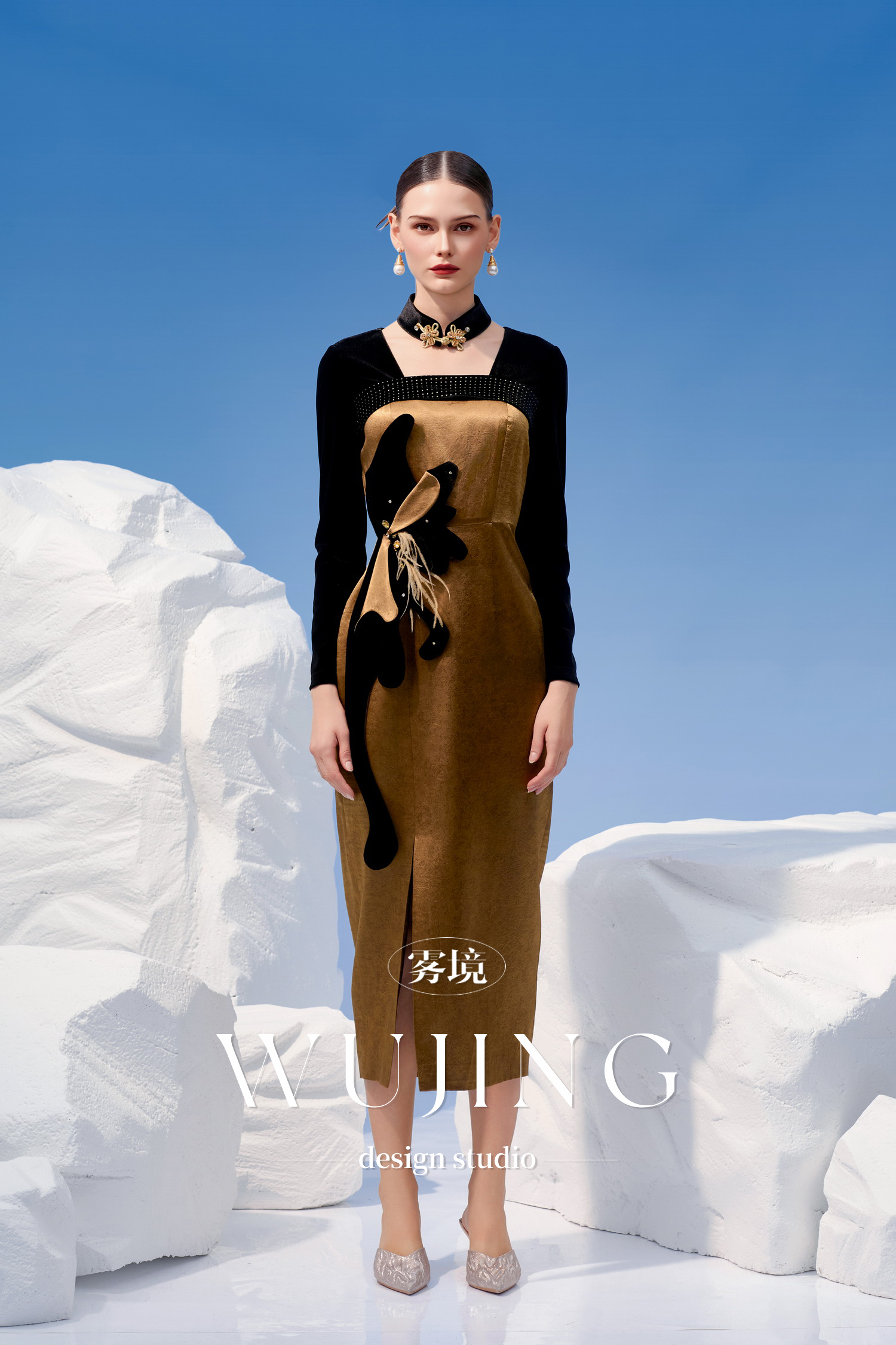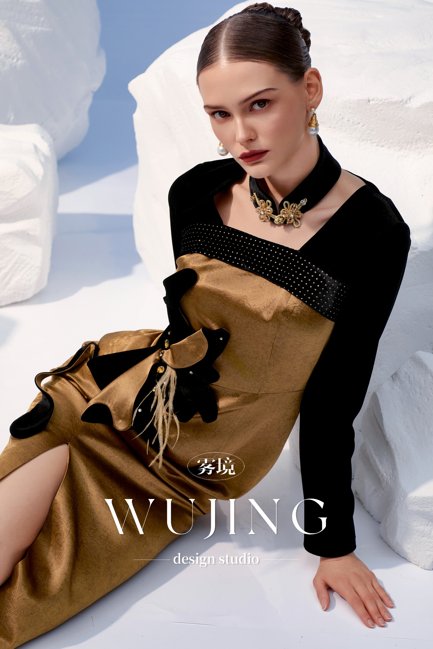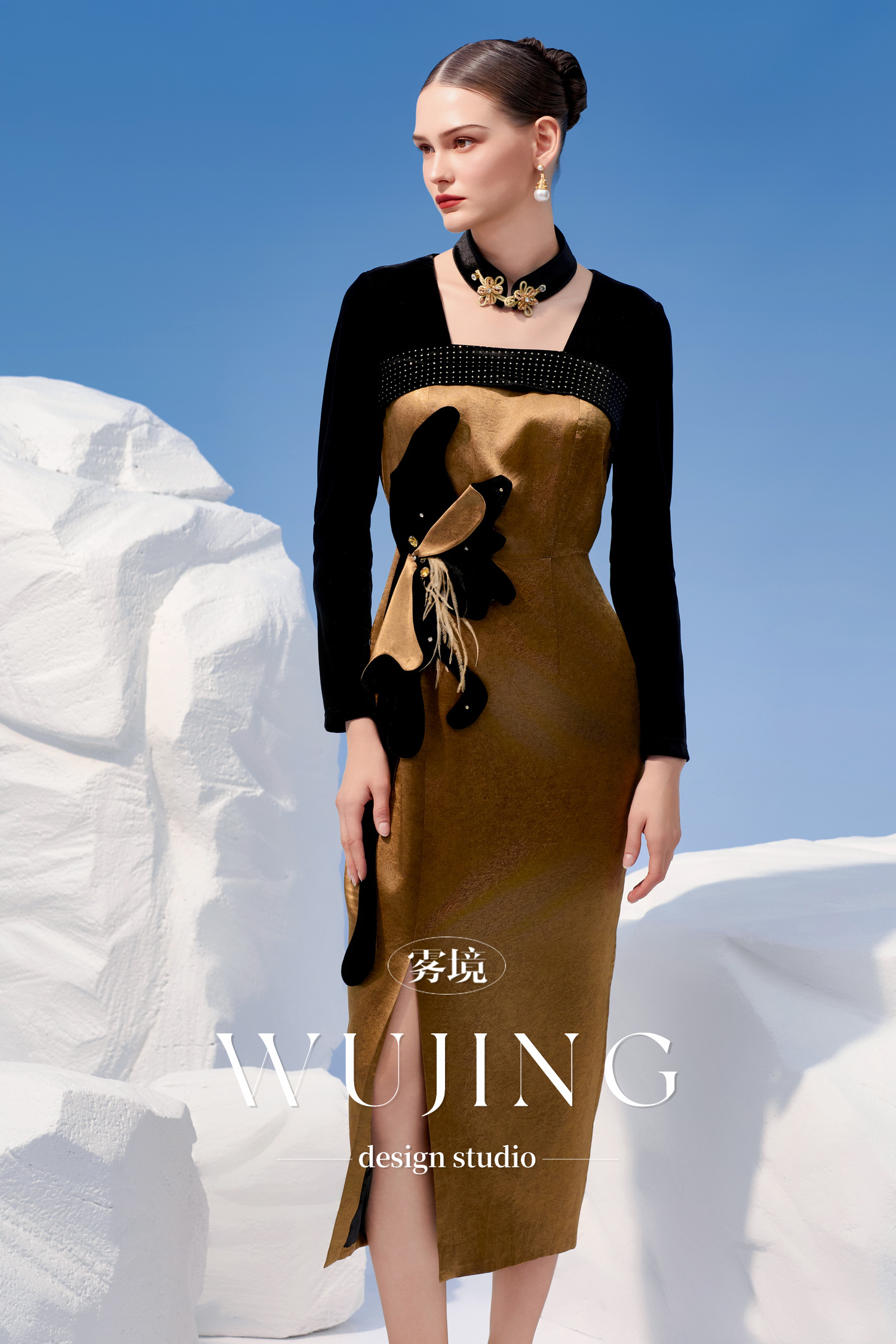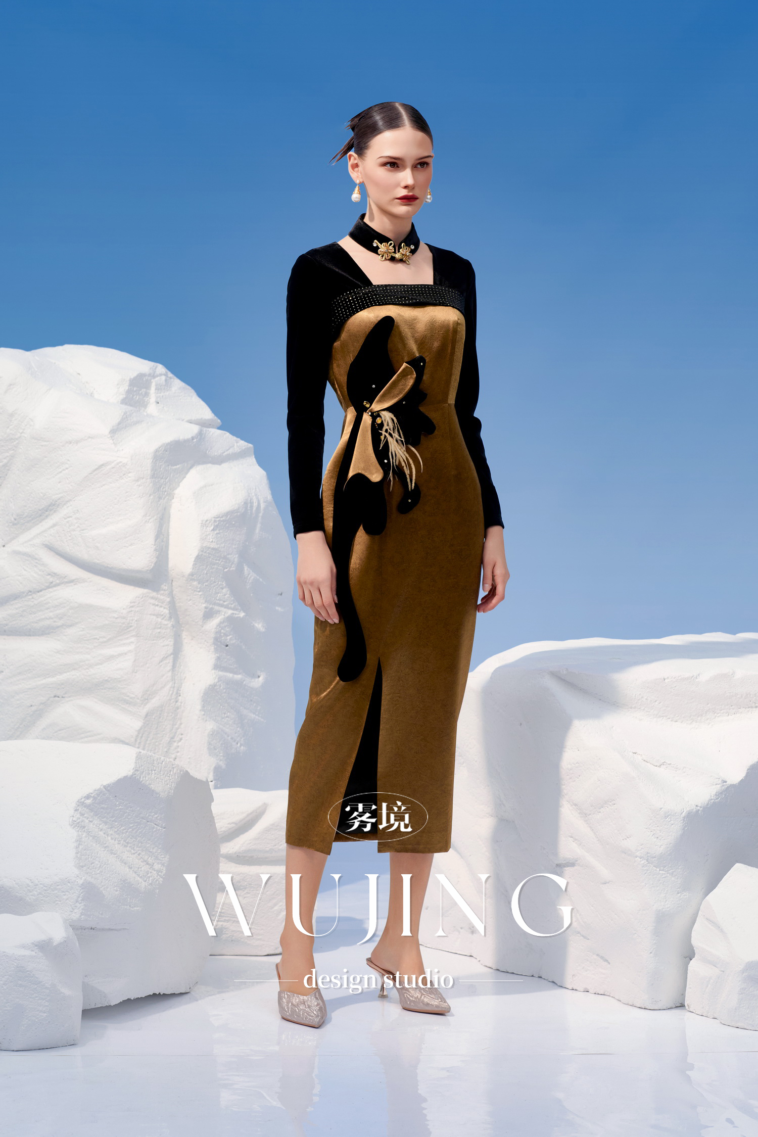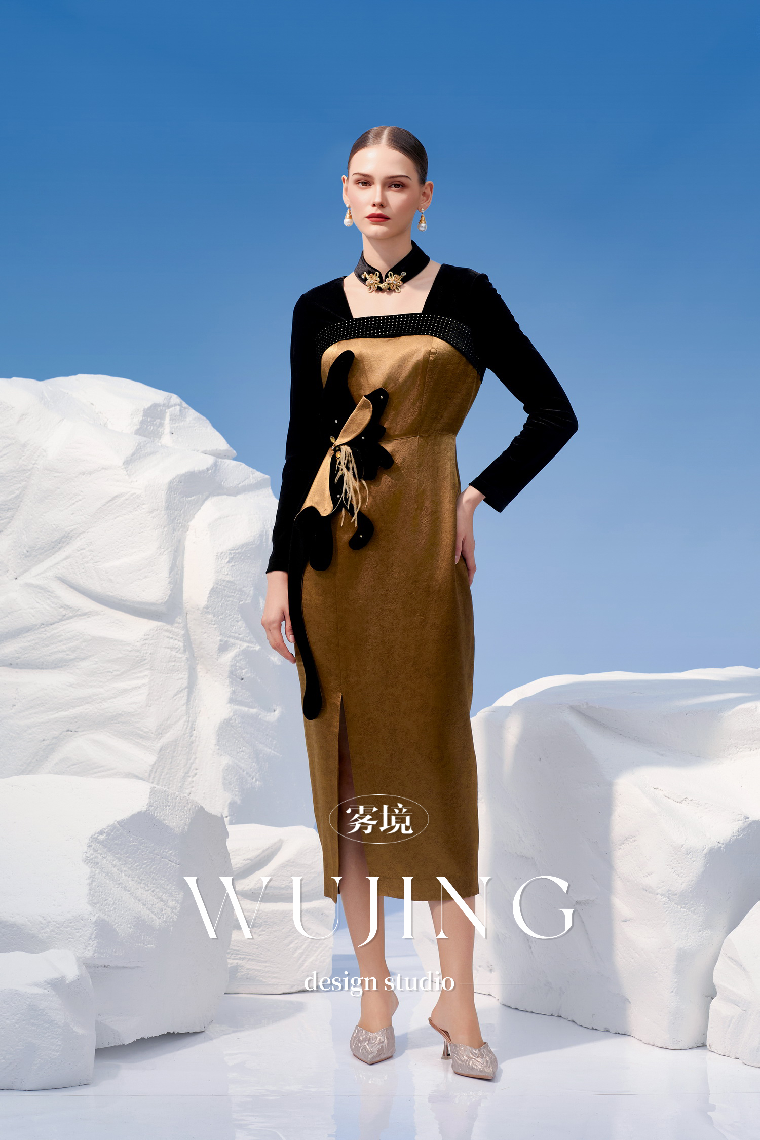 4202051 古潼怀金 进口双色醋酸连衣裙 雾境