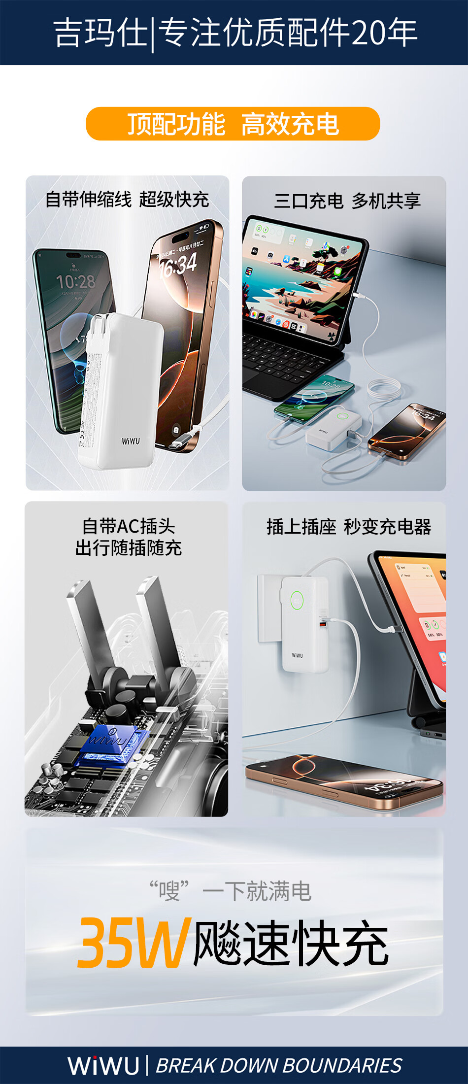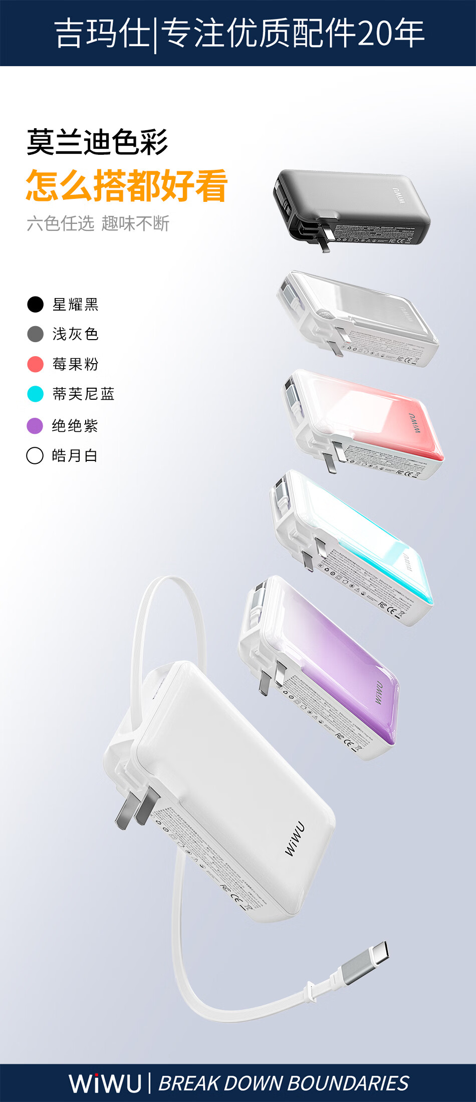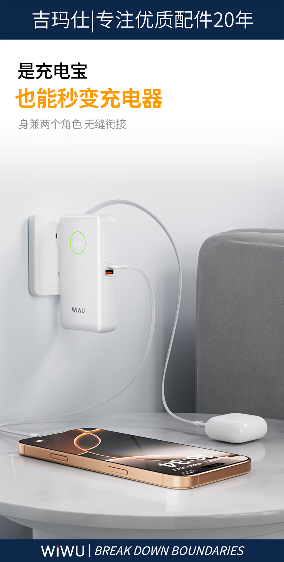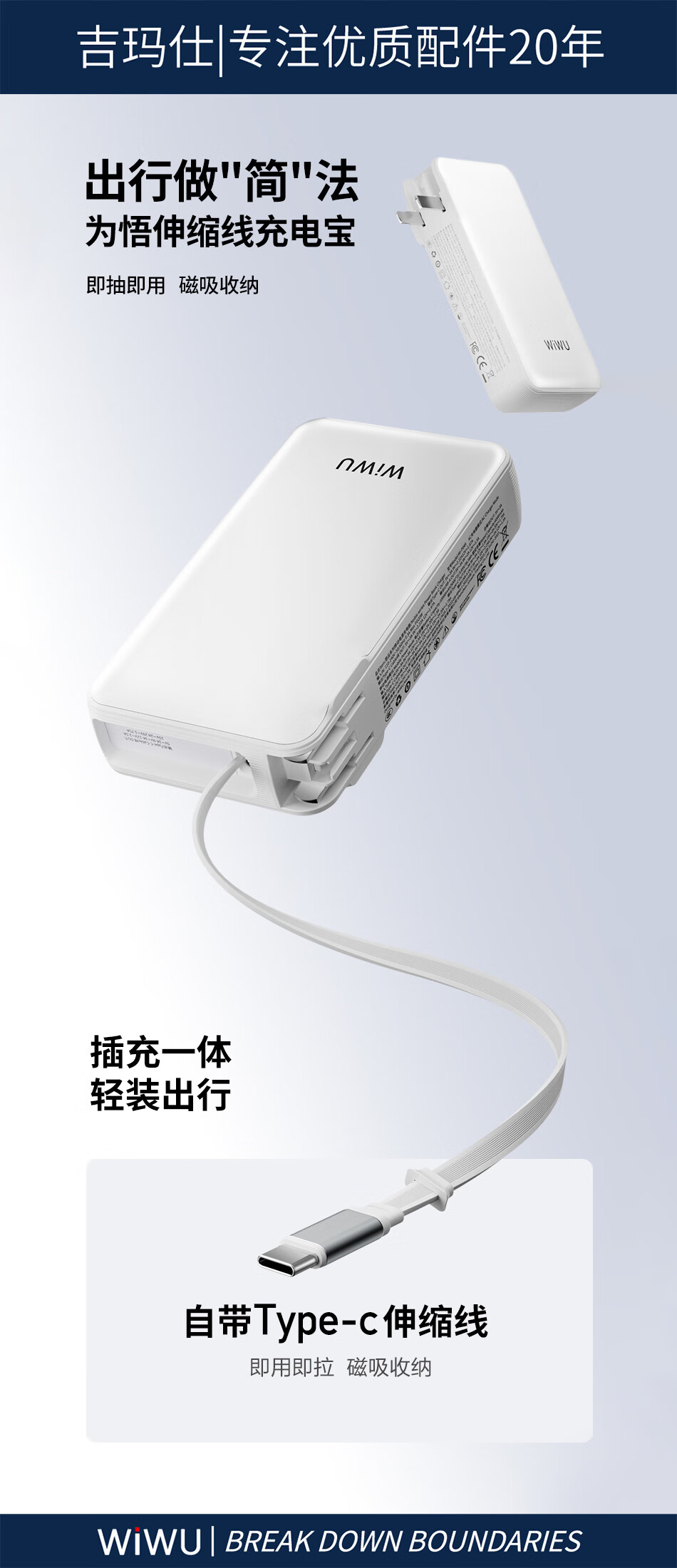 ZGA DY25 10000mAh插头快充移动电源Type-C双线合一充电宝自带线