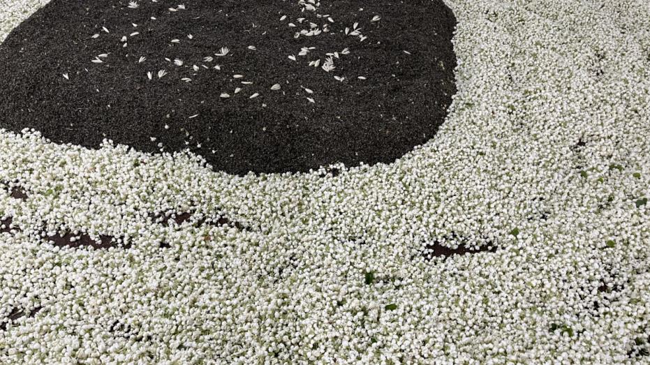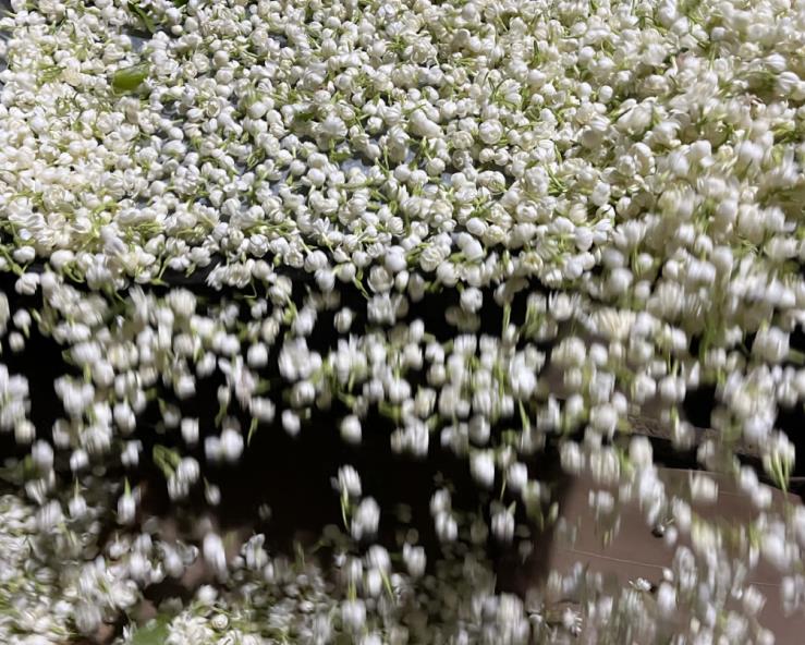 将茉莉鲜花摊放在干净的场地,侍花人会不断的用大花铲翻动花堆,经过一次又一次的“复堆”“通花”等繁琐步骤,使得花堆的温度、湿度、氧气都得到平衡,这样茉莉花才会在十点左右绽开。