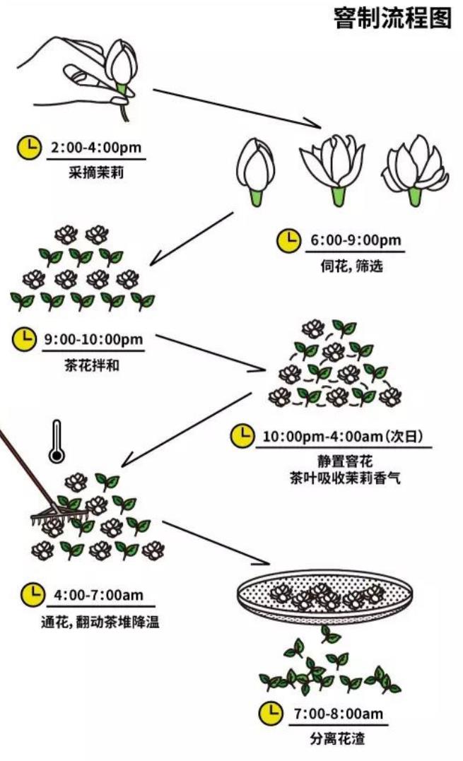 因此窨制过程中茶人都是通宵达旦,每隔15分钟便要将手伸进花茶堆中确认温度,因此没有多年的经验积累是做不来的。