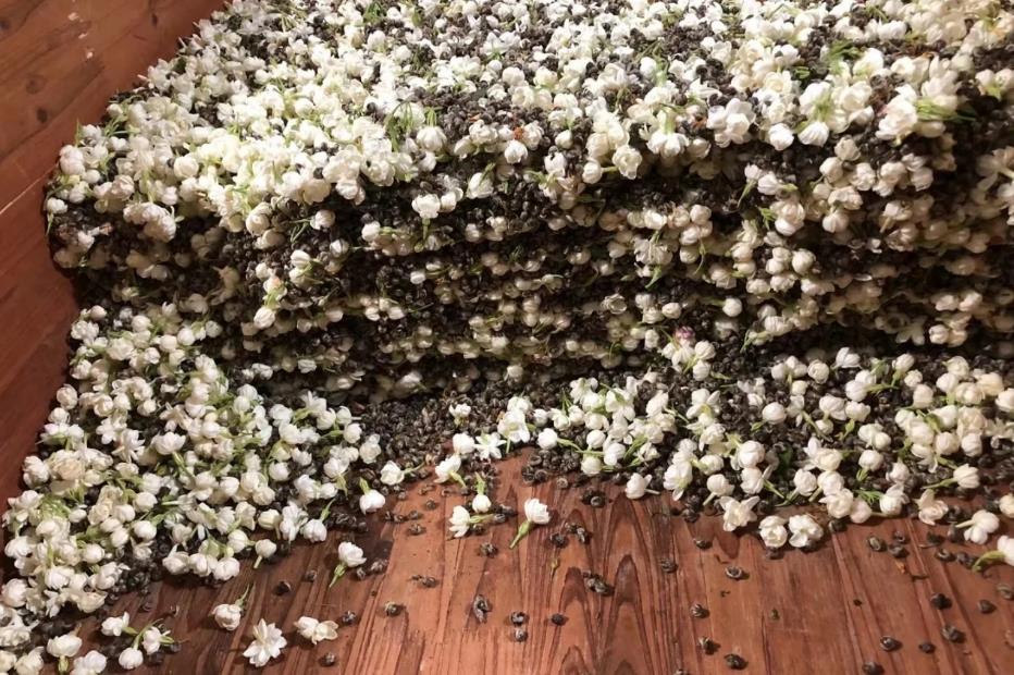 一层龙珠、一层茉莉,茶叶与鲜花层叠平铺在一起,鲜花吐香,茶叶吸香,反复几次让香味互相渗透,蔓延开来。