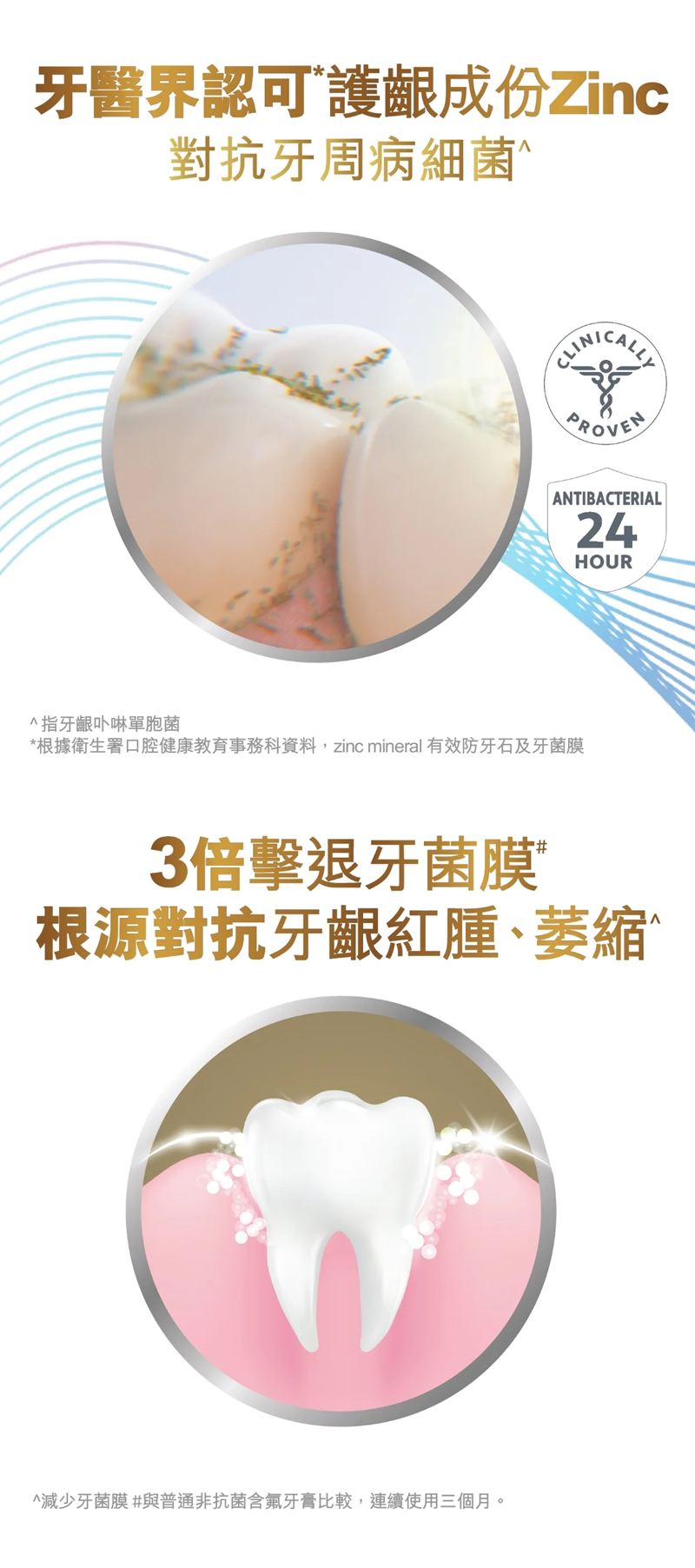 从减少牙龈流血、红胀等牙龈问题, Amino Foam科技以微米级泡泡深入牙龈, 将Zinc物质带到牙龈底层 针对性清洁牙龈线下3mm的牙菌膜, 增强牙龈。