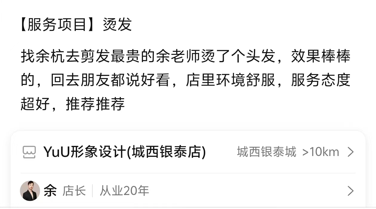 Yuu形象设计是杭州城西银泰周边的一家超级发型工作室,创始人从业20年,专注于剪发、烫发(免打理烫发),是一家注重品质的工作室