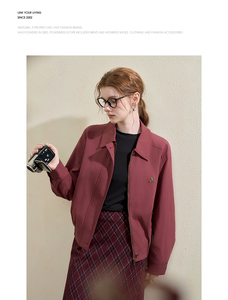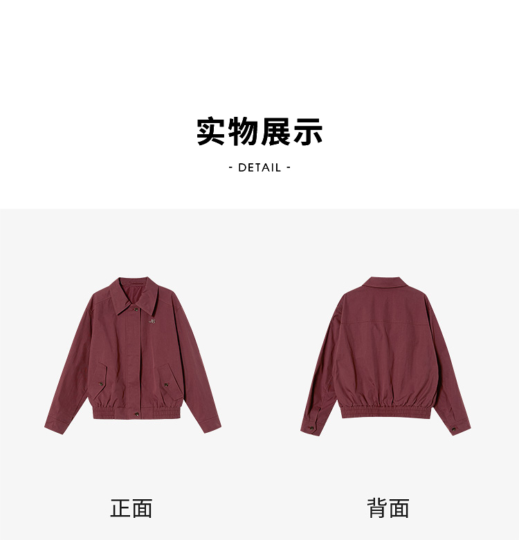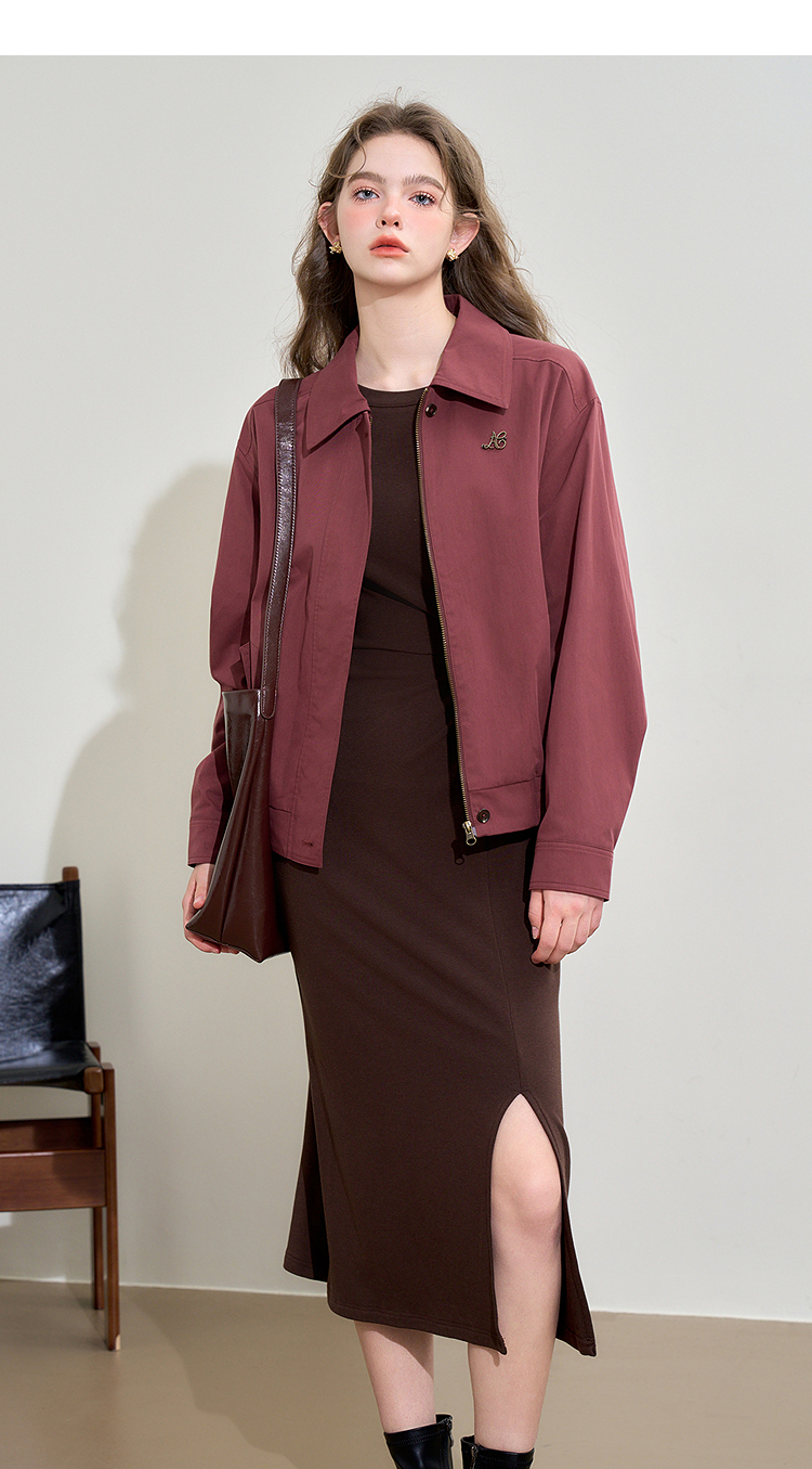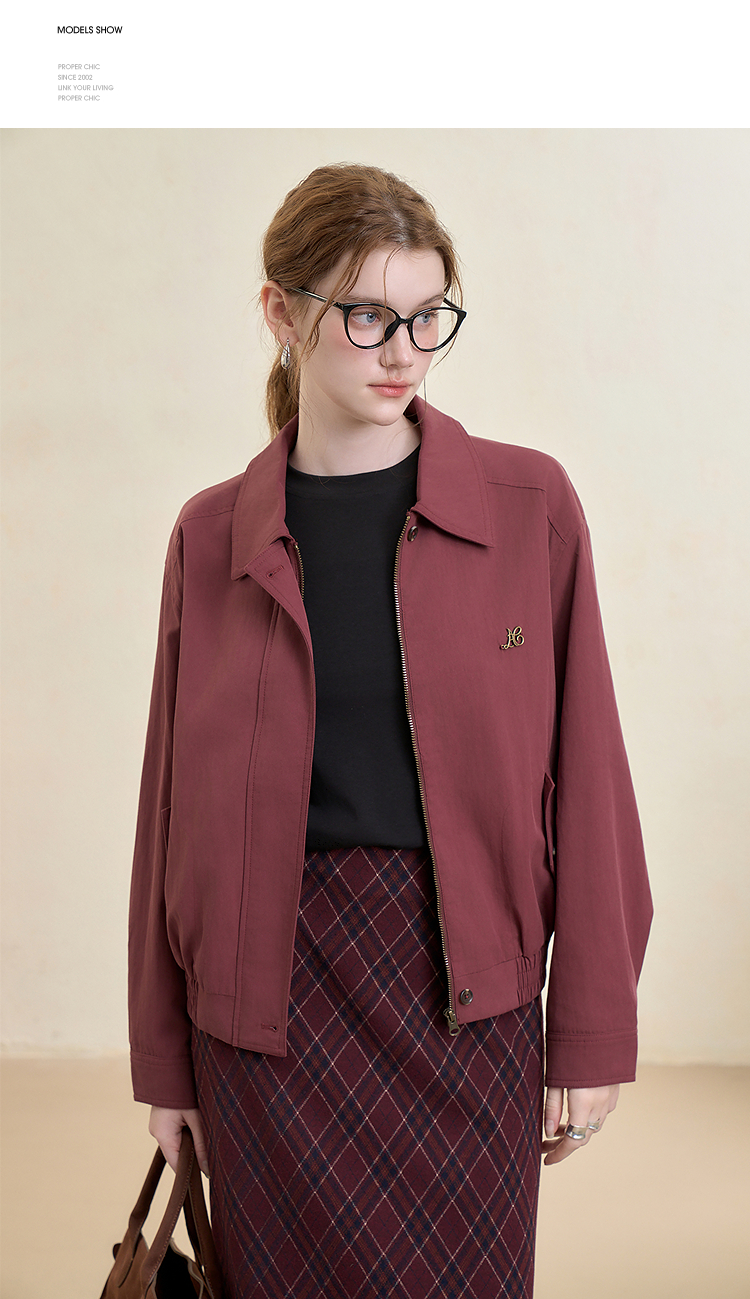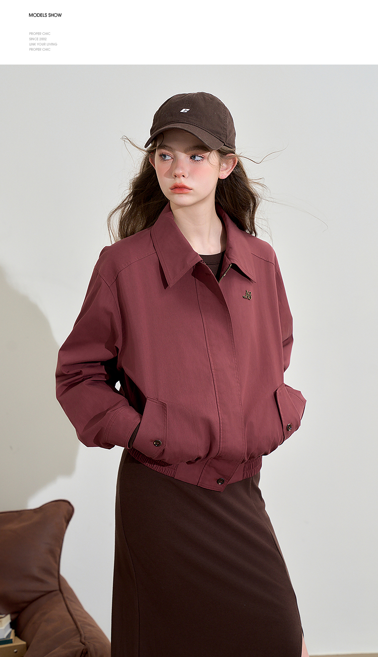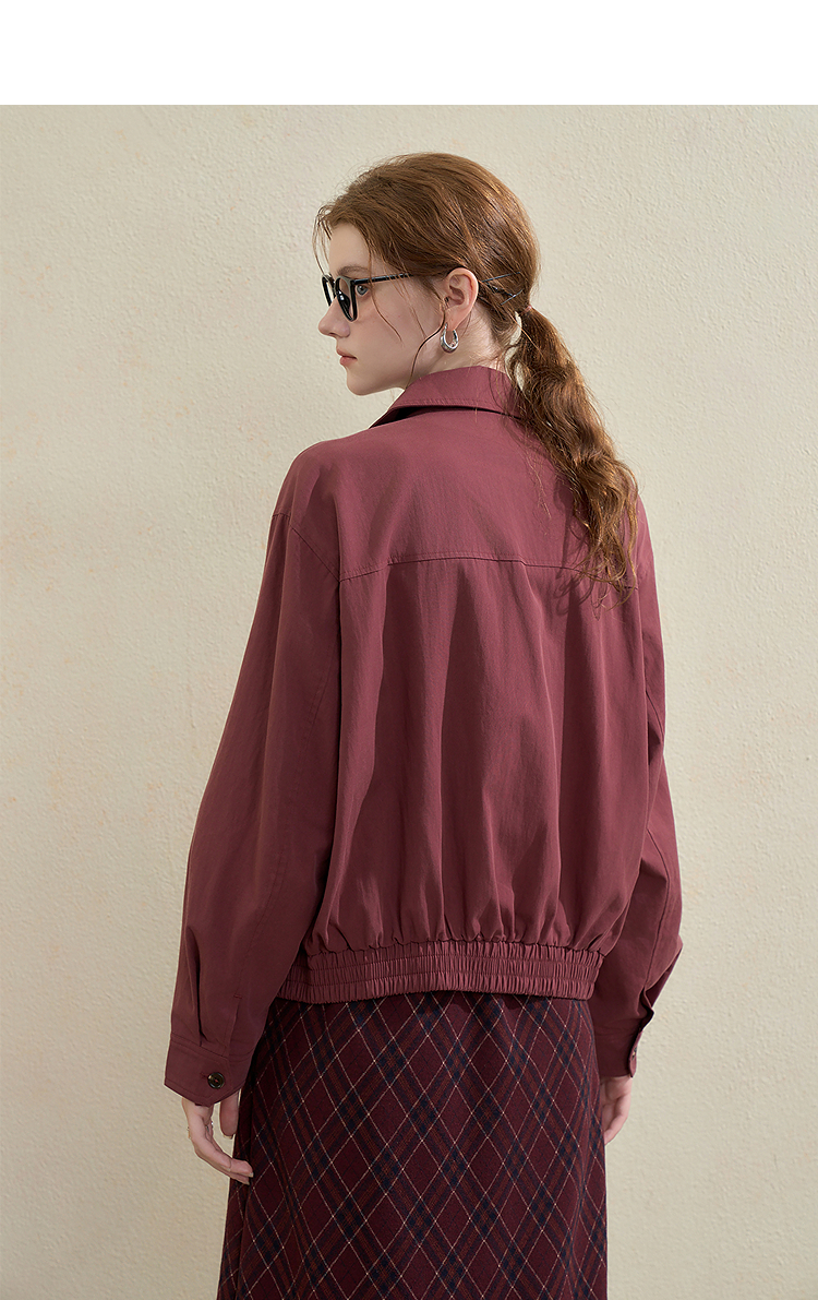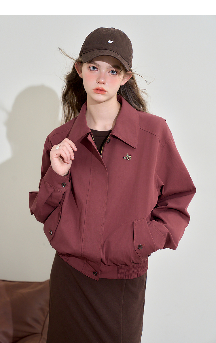 西遇翻领梭织夹克女新款枣红色美式复古落肩防风外套D3342228