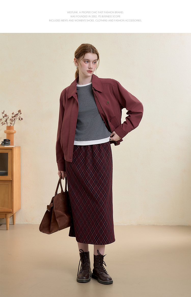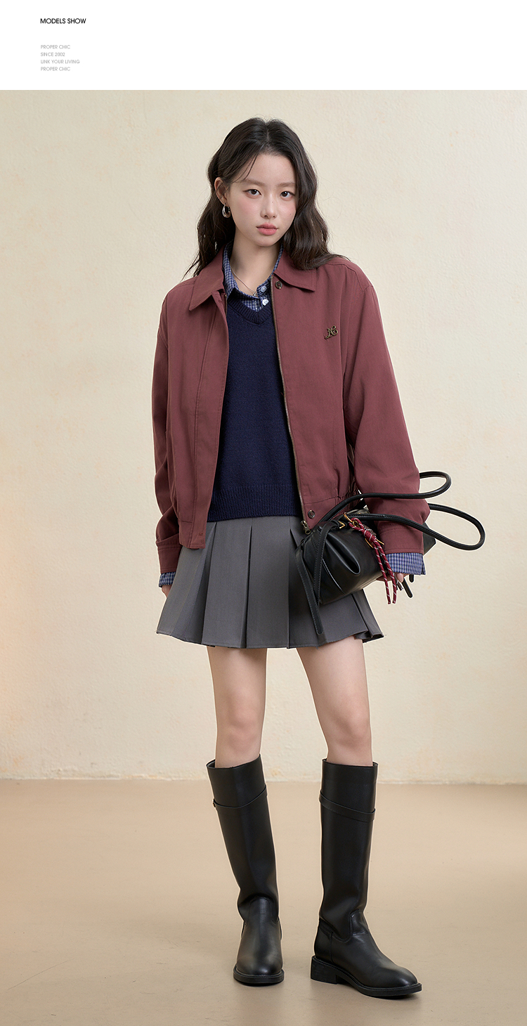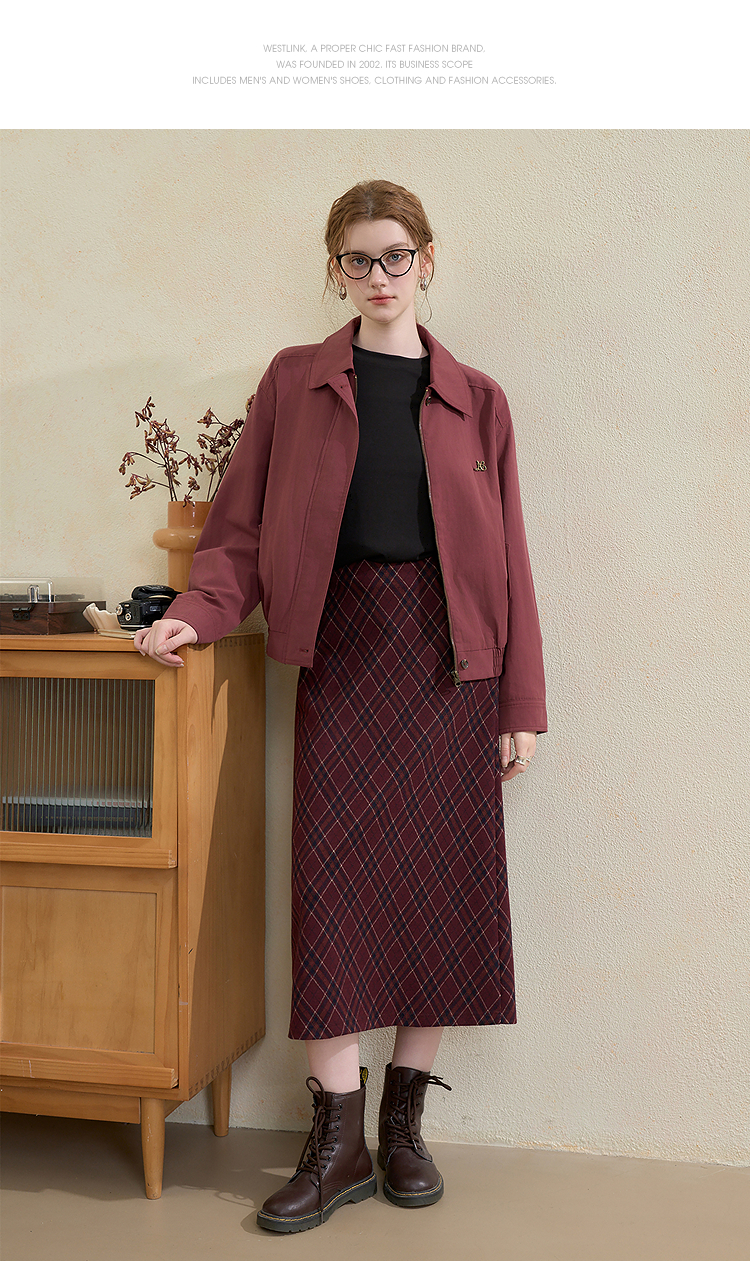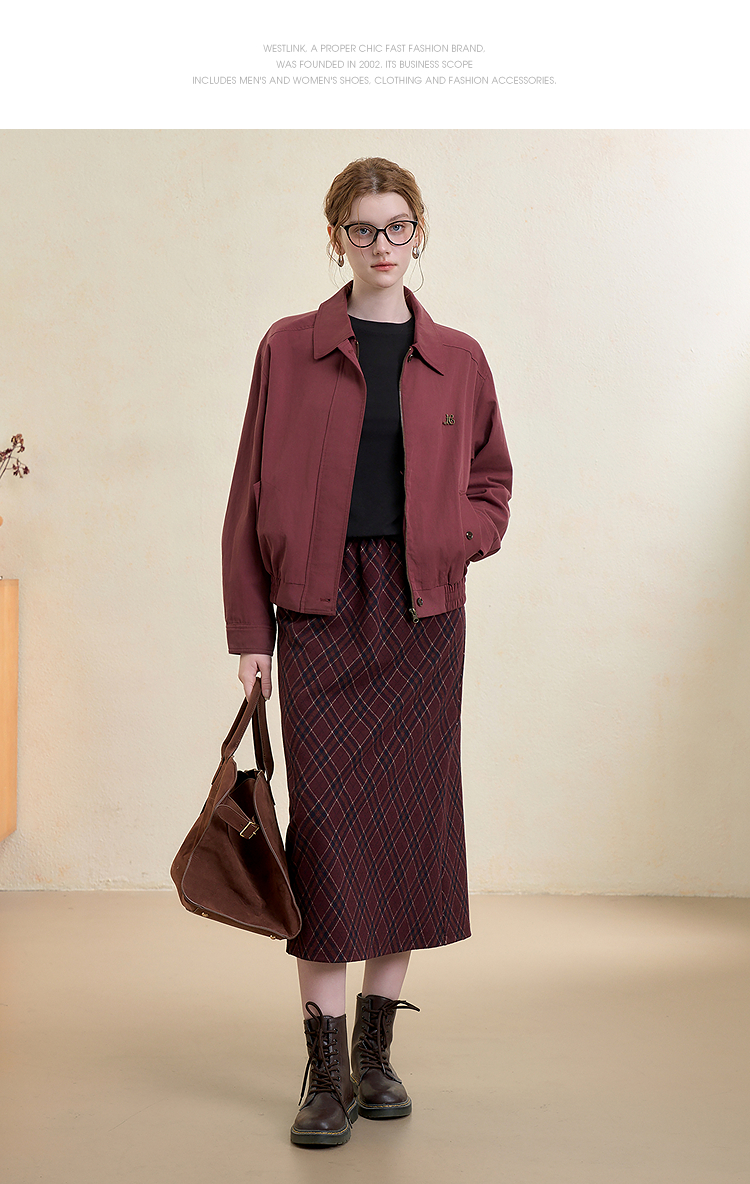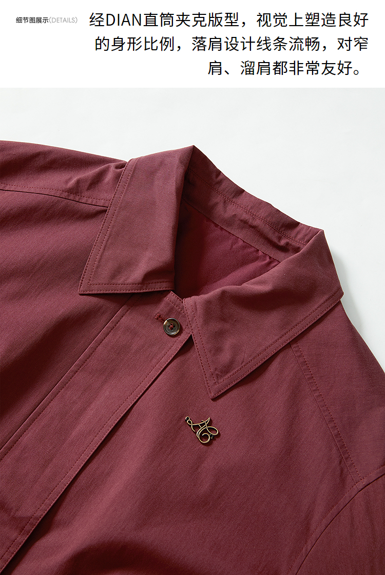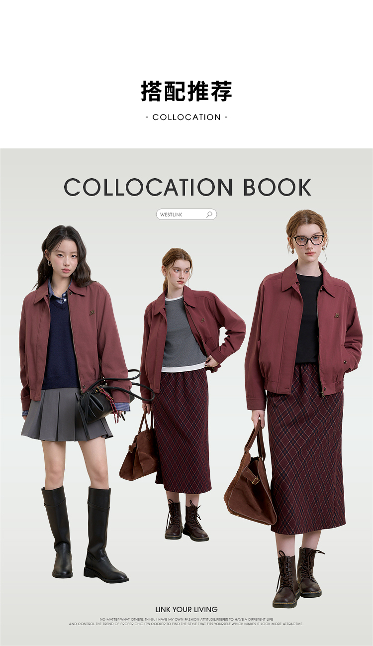 西遇翻领梭织夹克女新款枣红色美式复古落肩防风外套D3342228
