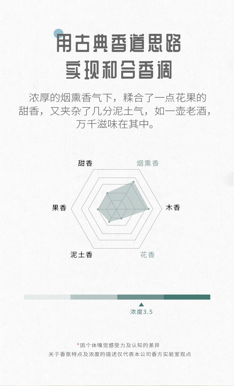 老粉最爱推荐香品之一!古韵新调的新中式合香,以沉香为主料,以广藿香、香根草等复构调和出酒意烟熏调,营造人生得意须尽欢的微醺香氛。