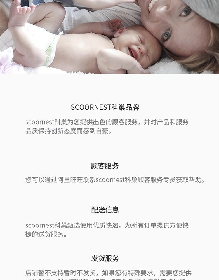 - Scoornest始终秉承给每一位宝宝送去科学的、关心的、创新的成长体验,通过提供商品和服务,使顾客形成守护、发展、巩固这种弥足珍贵的亲情的爱。