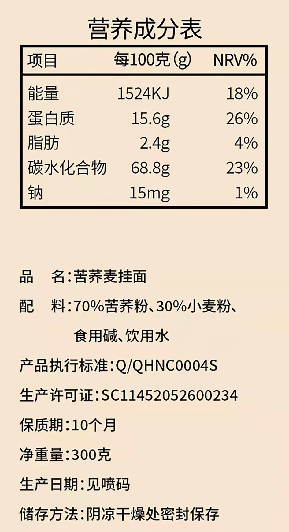看看一心匠品苦荞麦挂面的配料:70%苦荞、30%小麦粉、食用碱、饮用水!