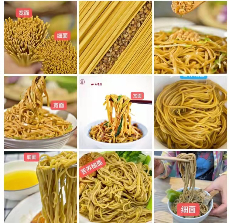 咱们的面条为什么不是黑色的,是因为我们的面条是苦荞粒脱壳后由苦荞芯制作面成的面条,苦荞芯里有大量的芦丁,去皮遇见会成黄色。