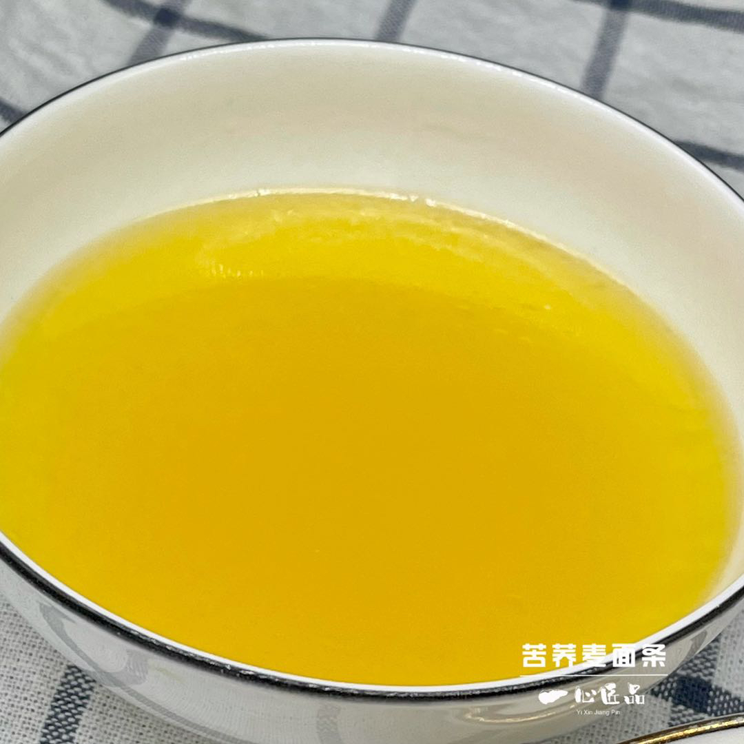 苦荞中含有黄酮和芦丁,这类抗氧化物平时几乎是无色的,但处于碱性环境中(面条中需要加食用碱)就会表现成鲜明的黄色,所以苦荞面才会是黄色的(偏一点绿色)同时,煮出来的【面汤】色也是深黄色的,这个是正宗苦荞才会有的现象。以此可以辨别真伪苦荞面,并且可以根据汤色的颜色来估算苦荞面中的苦养成分含量,咱家此款苦荞面含有70%苦荞粉,属于优质的苦荞面!