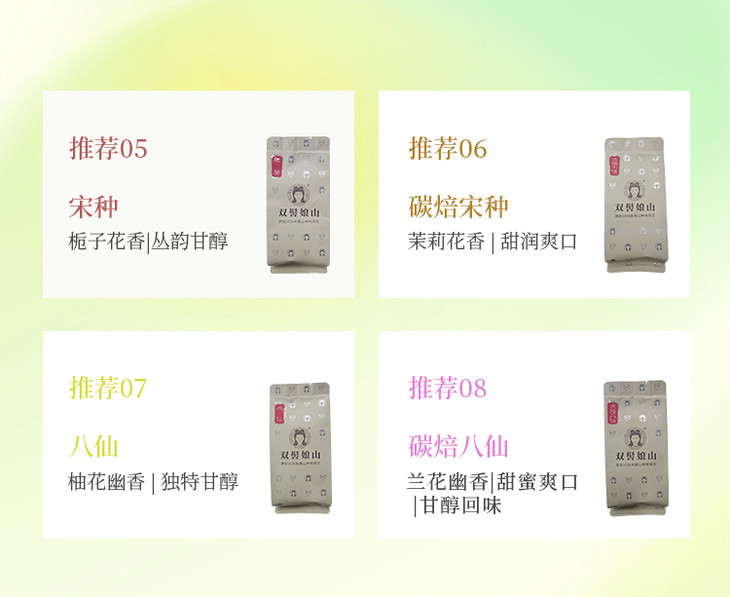 内含:雪芽、鸭屎香、大富翁、柚花香、锯朵仔、石岩香、贡香、杏仁香(各1包)