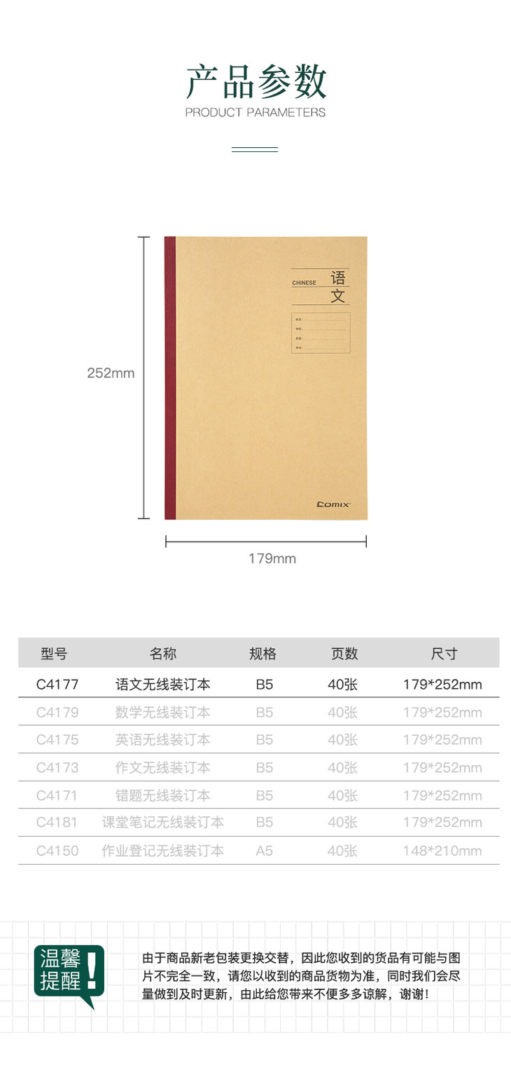 齐心 C4177 牛皮纸系列 语文无线装订本 B5 40张