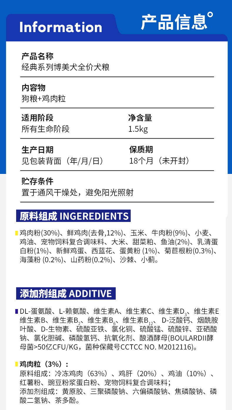 | 适用犬体型: 通用型 | 食品口味: 博美肉粒双拼粮3斤 |