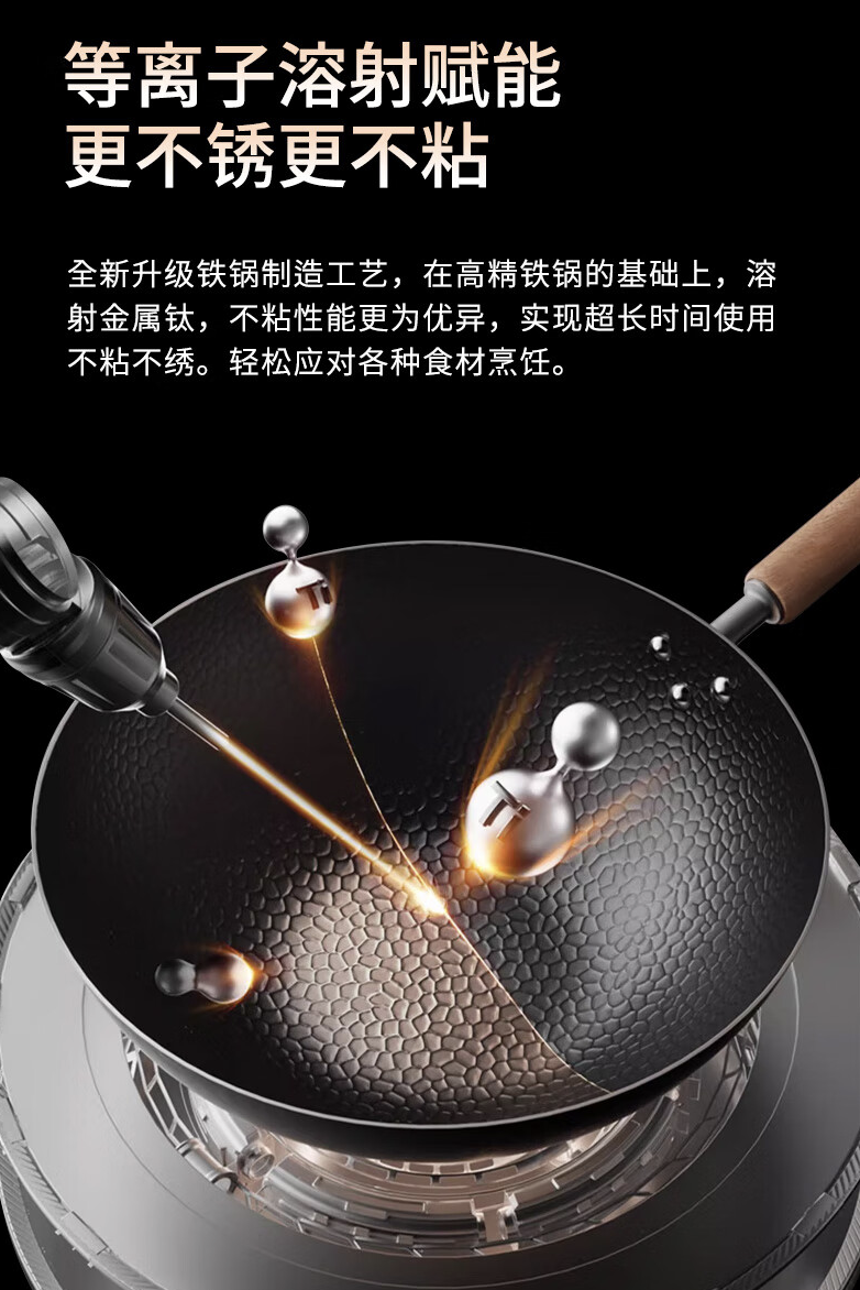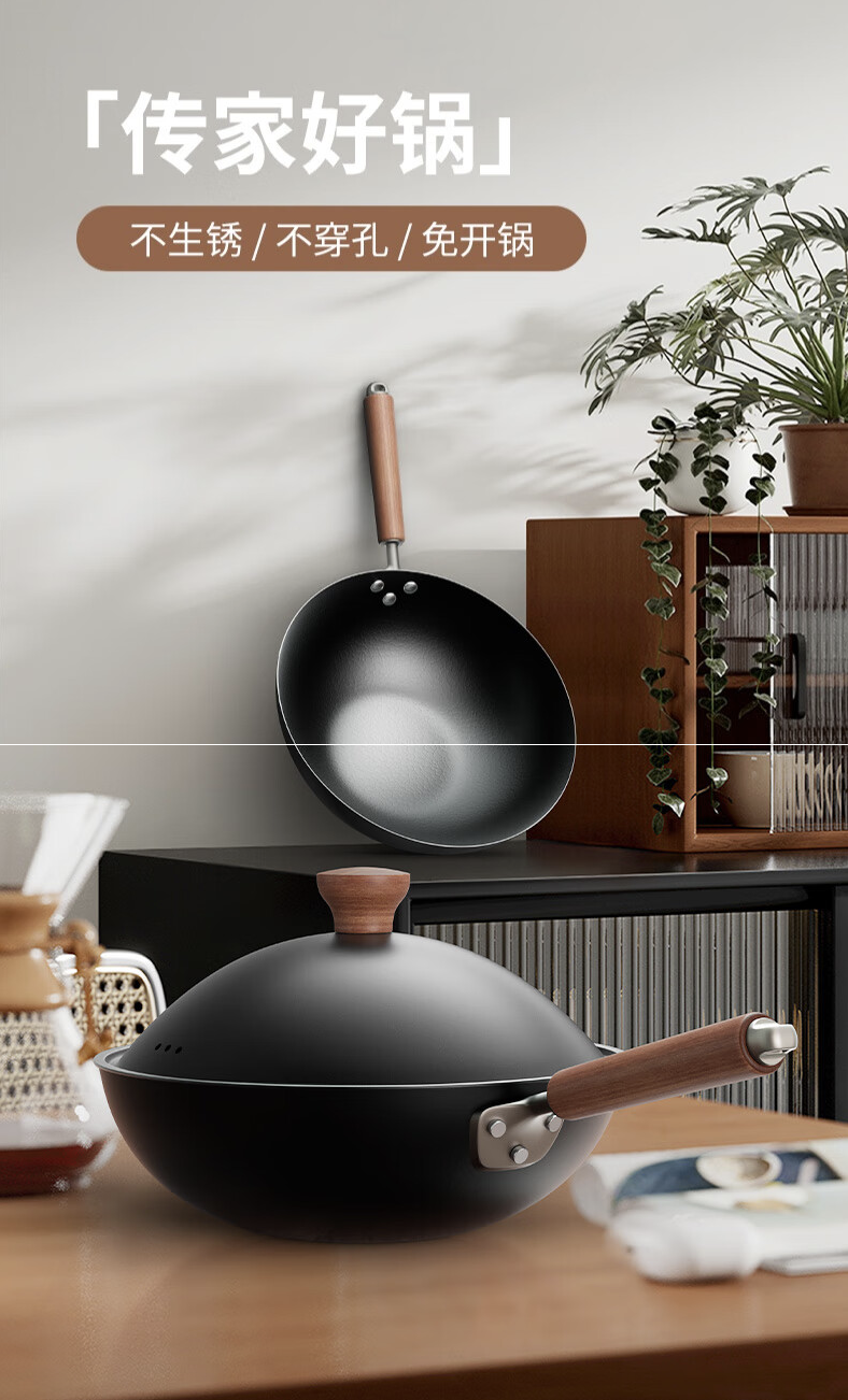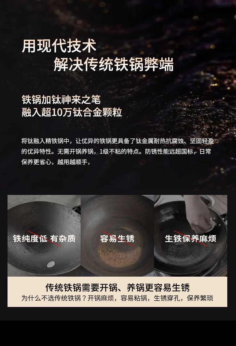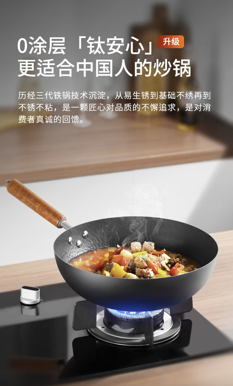 传世家徽炒锅铁锅有钛不粘炒菜锅 无涂层锻打锤纹铁锅 已开锅燃气电磁炉用