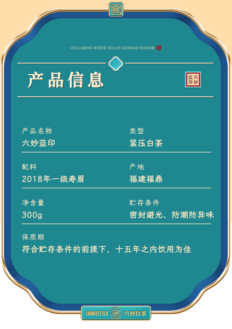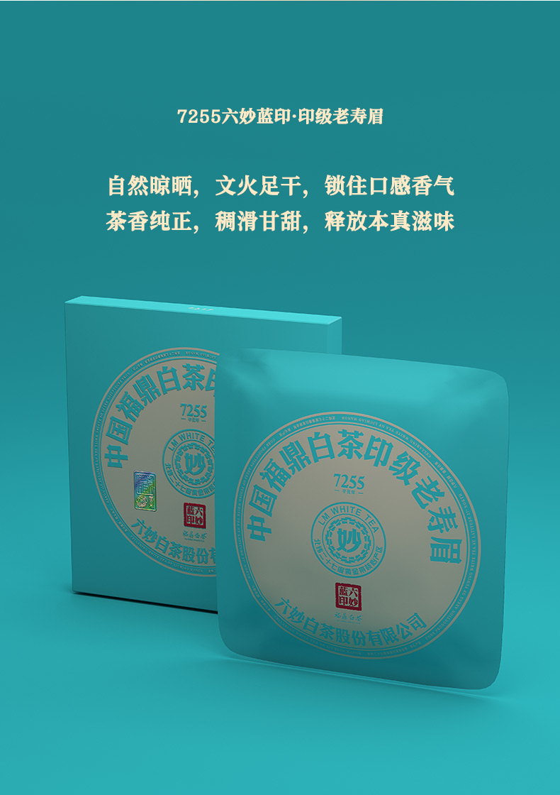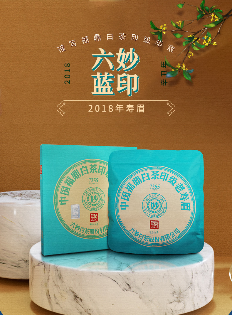 【白茶印级茶】六妙 7255蓝印 2018年寿眉 福鼎白茶 礼盒装 300g/饼(京东同款)