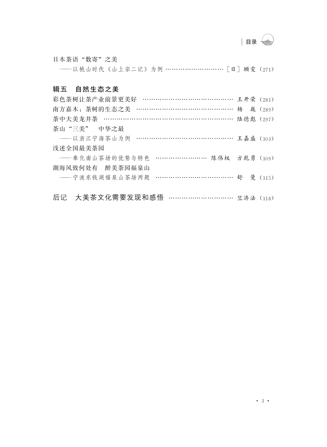 茶文化是美的文化,中国历史上美好茶事不胜枚举,宁波亦如是,唐宋元明清,自古喝到今,这一俗语道出了宁波悠久的茶文化历史,留下了诸多优美茶事佳话。 茶园生态美、茶乡旅游美、诗文佳作美、书画歌舞美、茶艺茶道美、茶器琳琅美、身心精神兼美……为了充分展示茶与人类美好生活,礼赞茶文化对人类 的重大贡献,自去年5月开始,宁波茶文件促进会与宁波东亚茶文化研究中心、浙江大学茶叶研究所、《农业考古·中国茶文化专号》编辑部一起联合举办2020“明州茶论” ——“茶与人类美好生活”研讨会,海内外专家、学者,提供了丰富多彩的相关论文,从不同角度,多元展示了茶文化之美,相信读者读后会大有裨益。