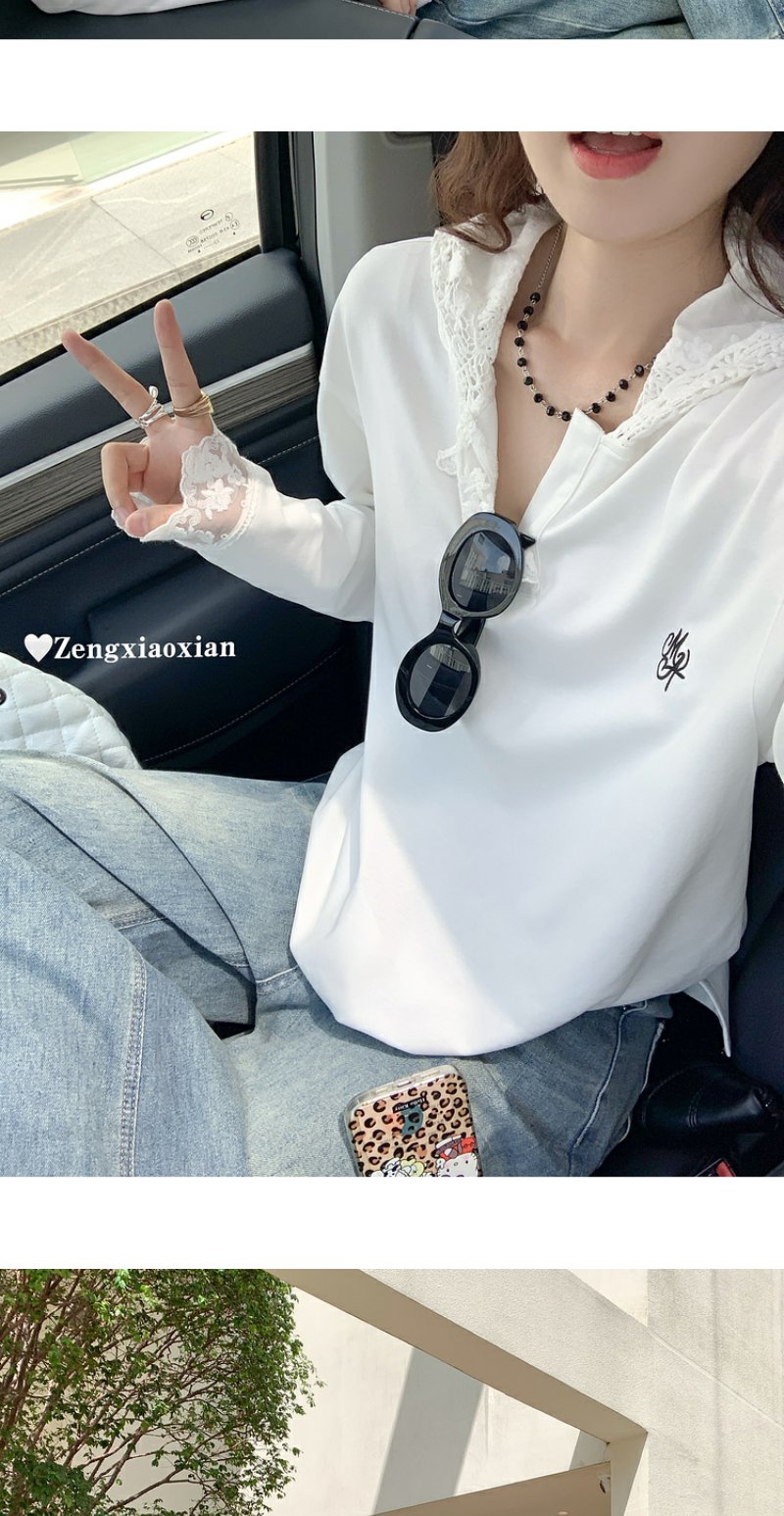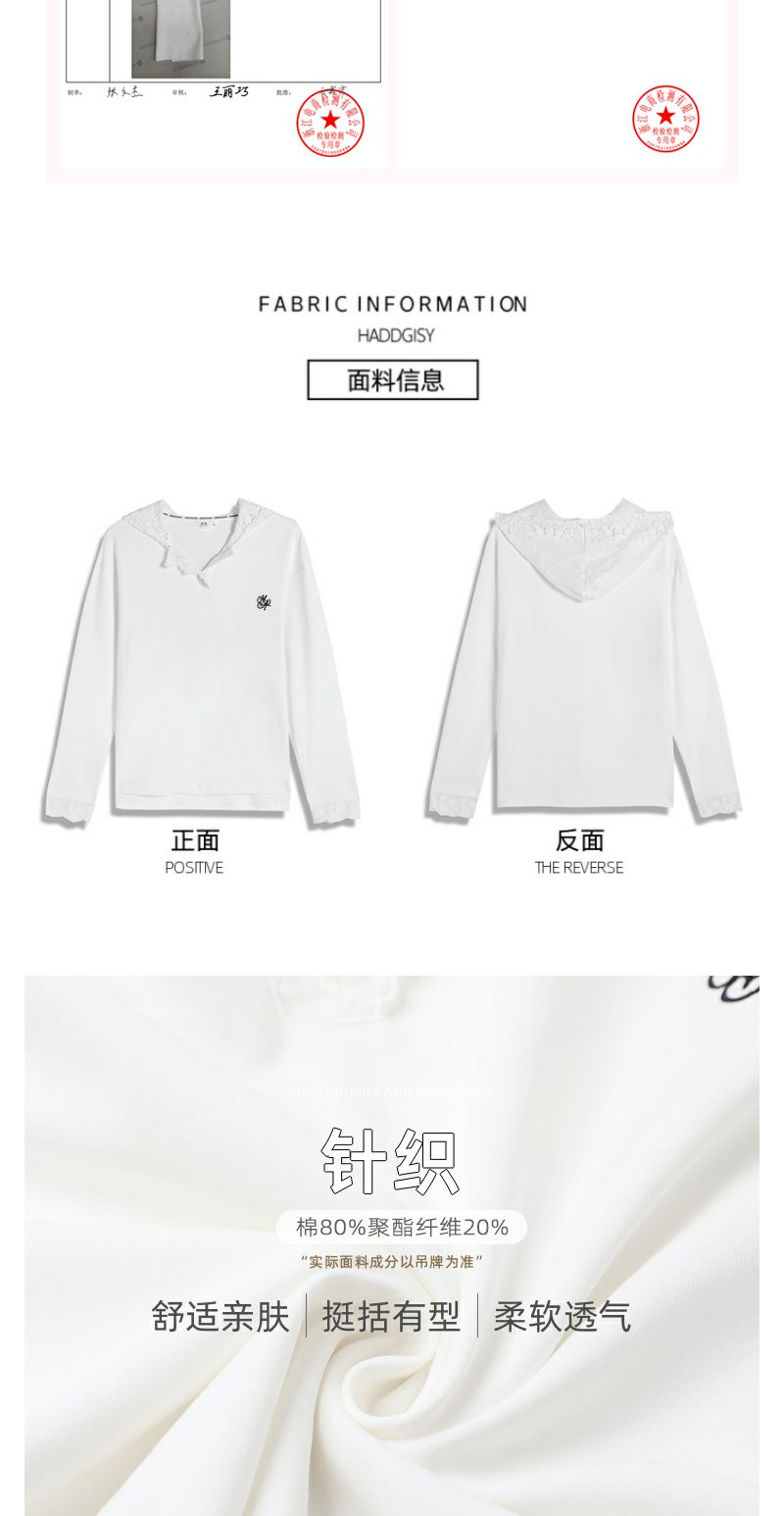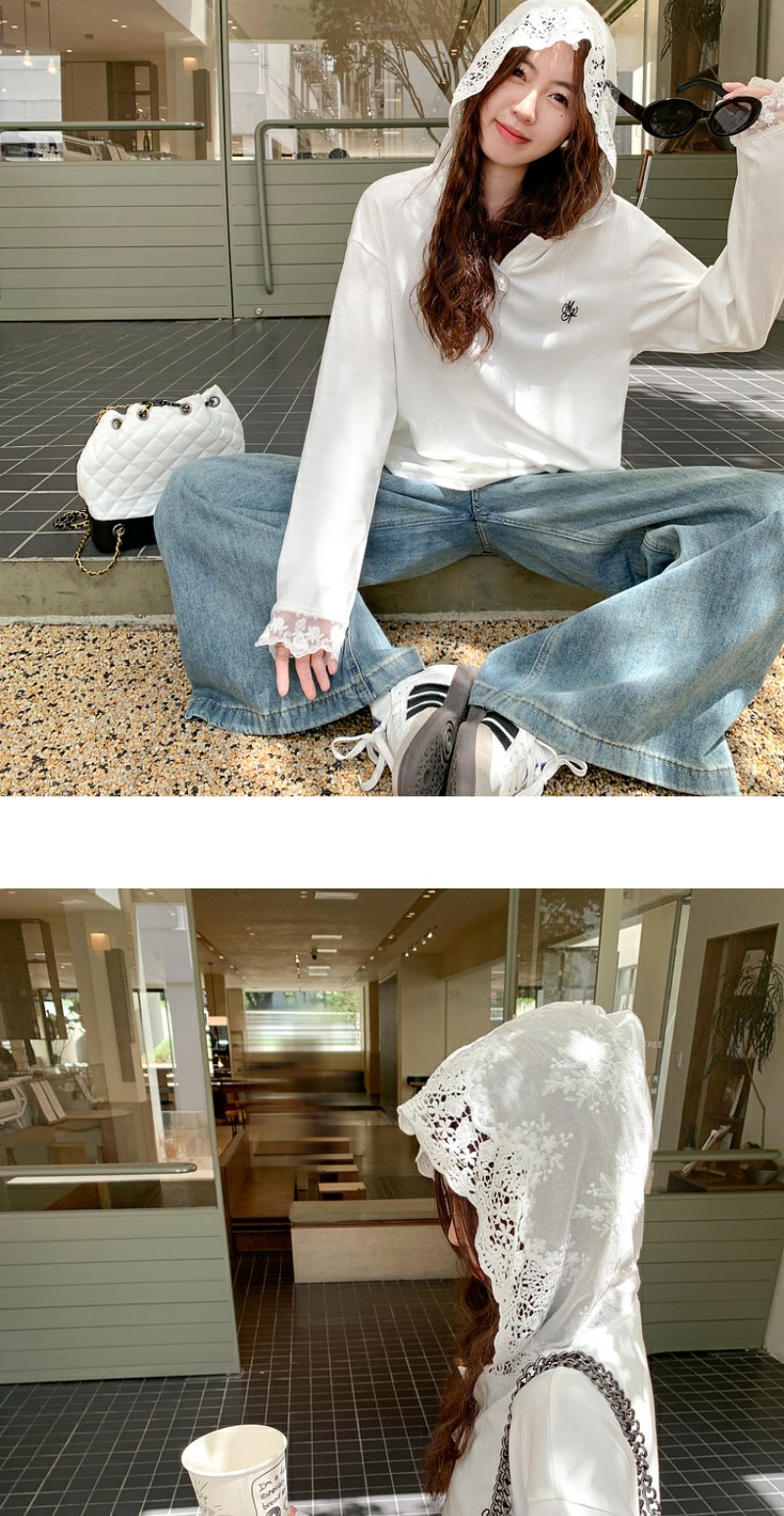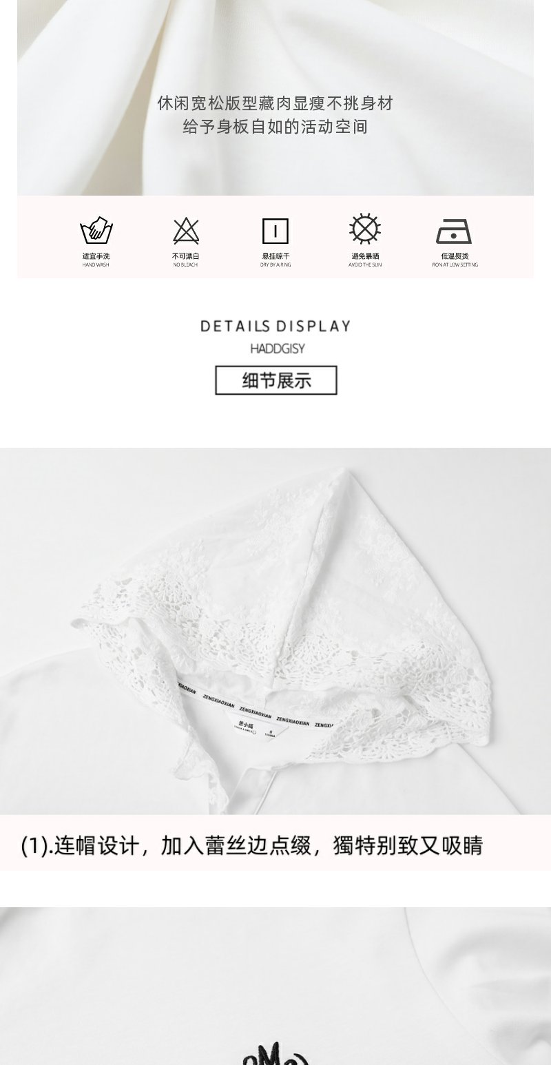 <曾小咸推荐>韩版白色蕾丝边长袖连帽T恤