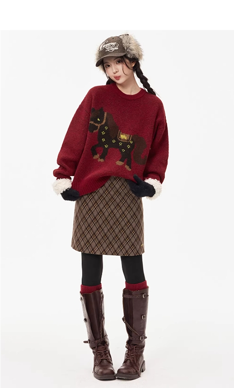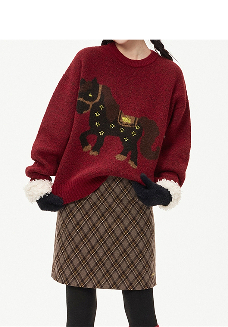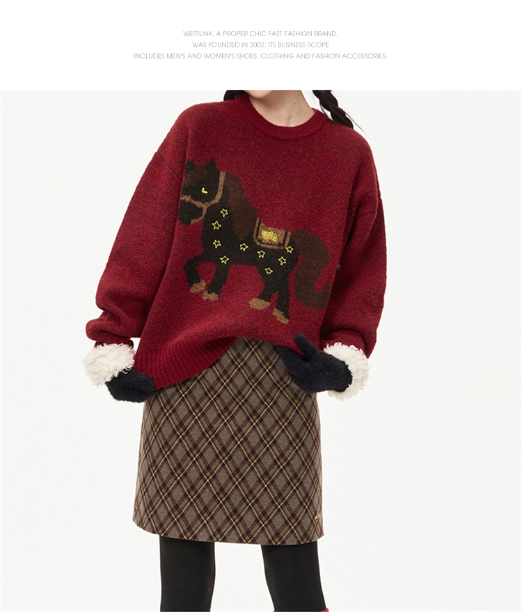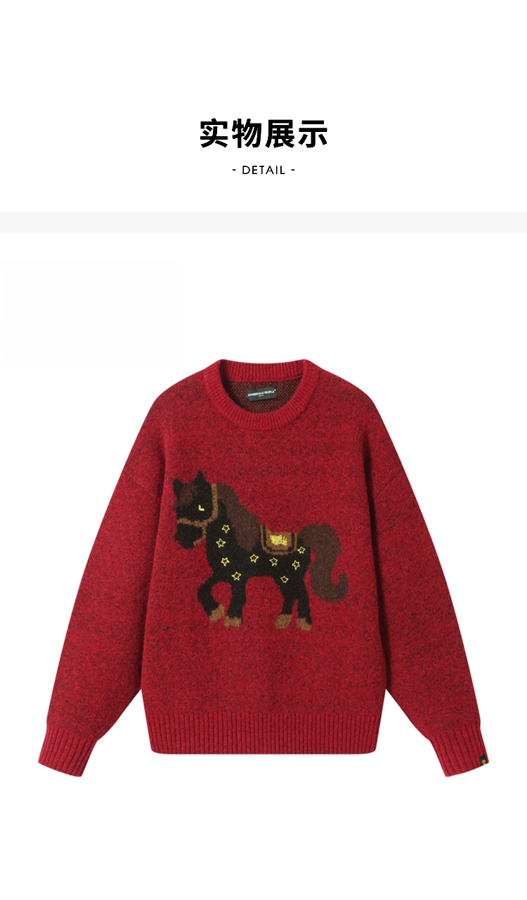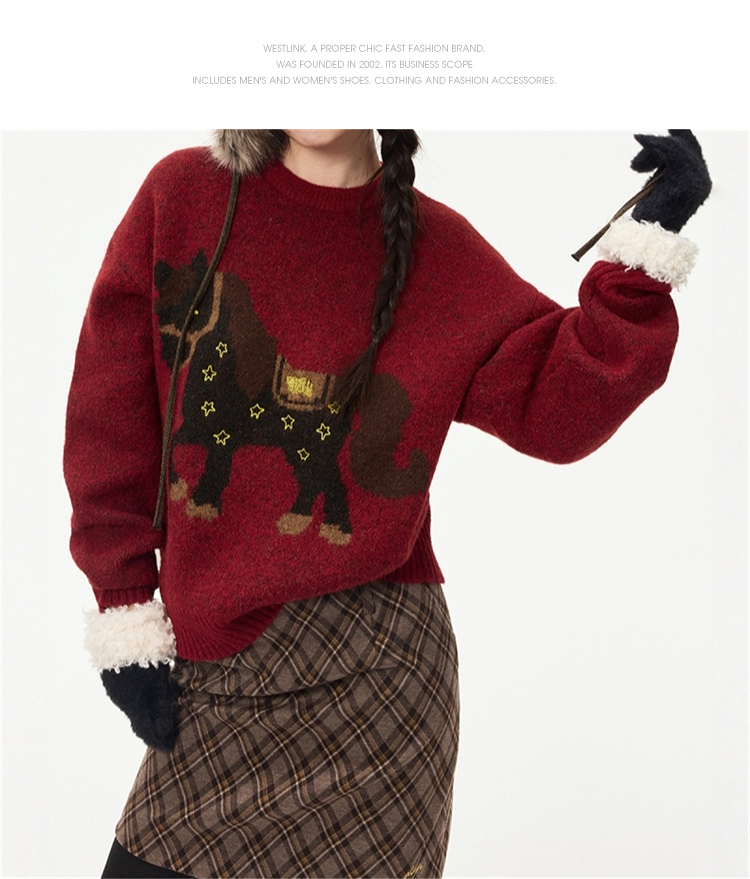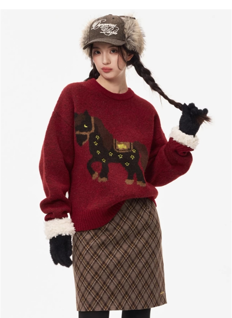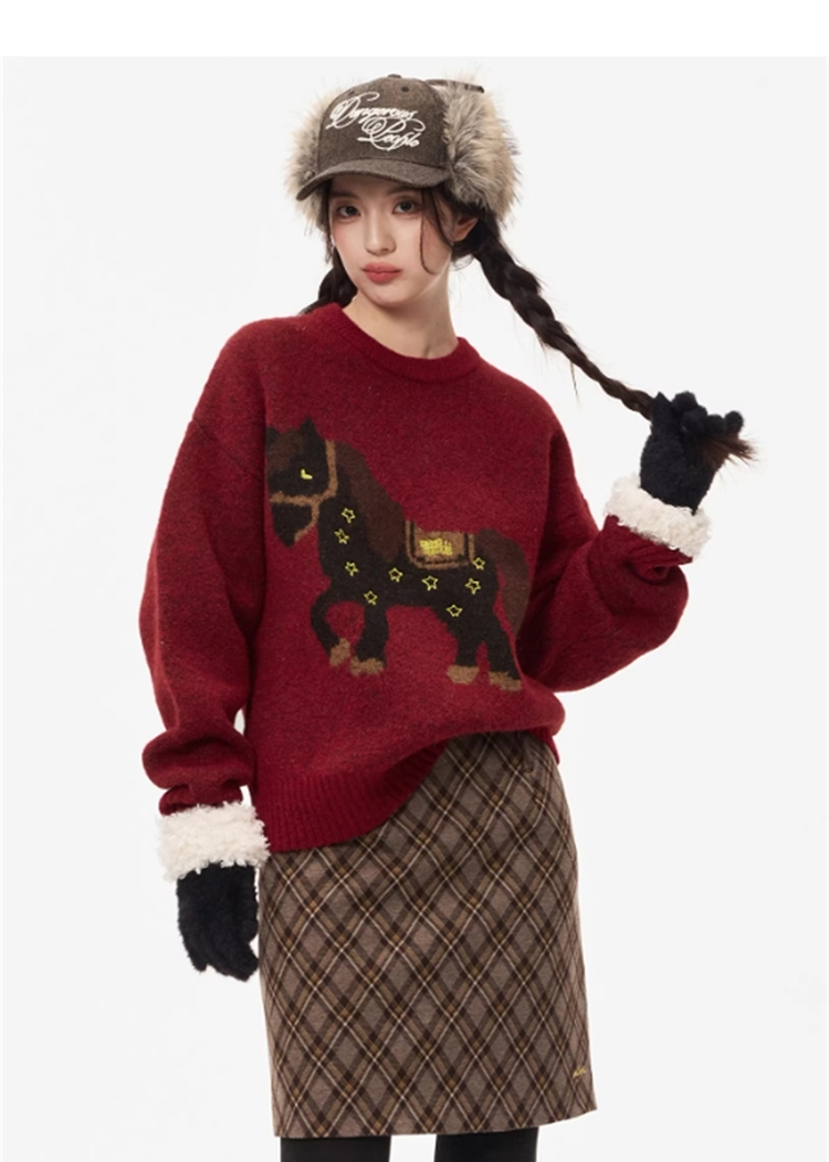西遇新年红色毛衣女2026春季新款韩式可爱风卡通圆领宽松慵懒上衣SS060051