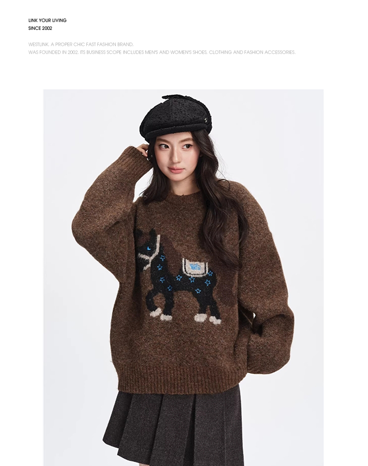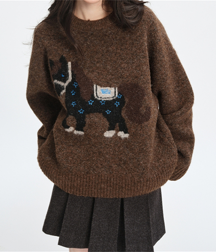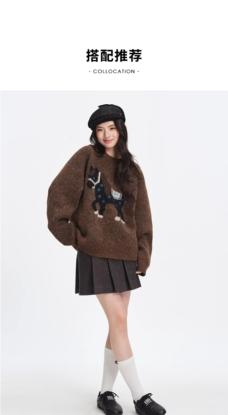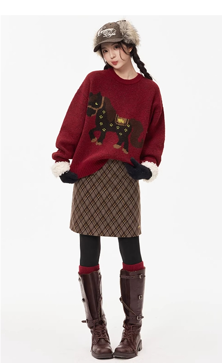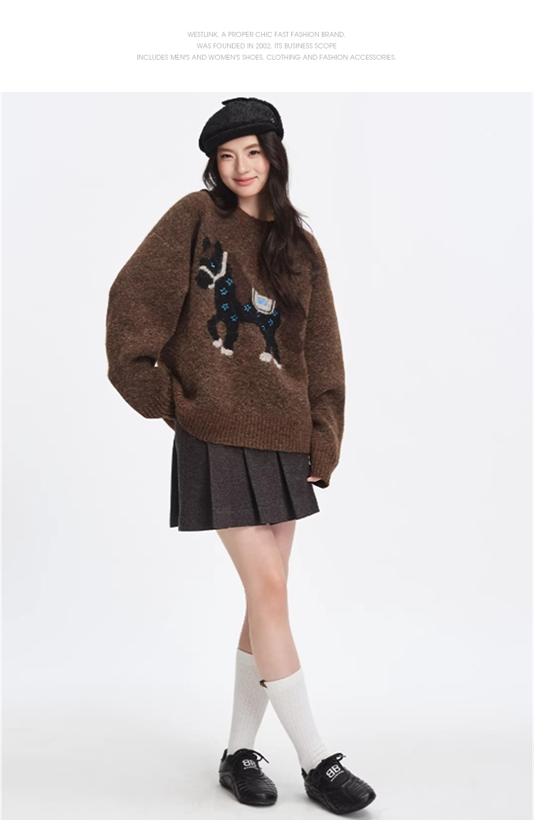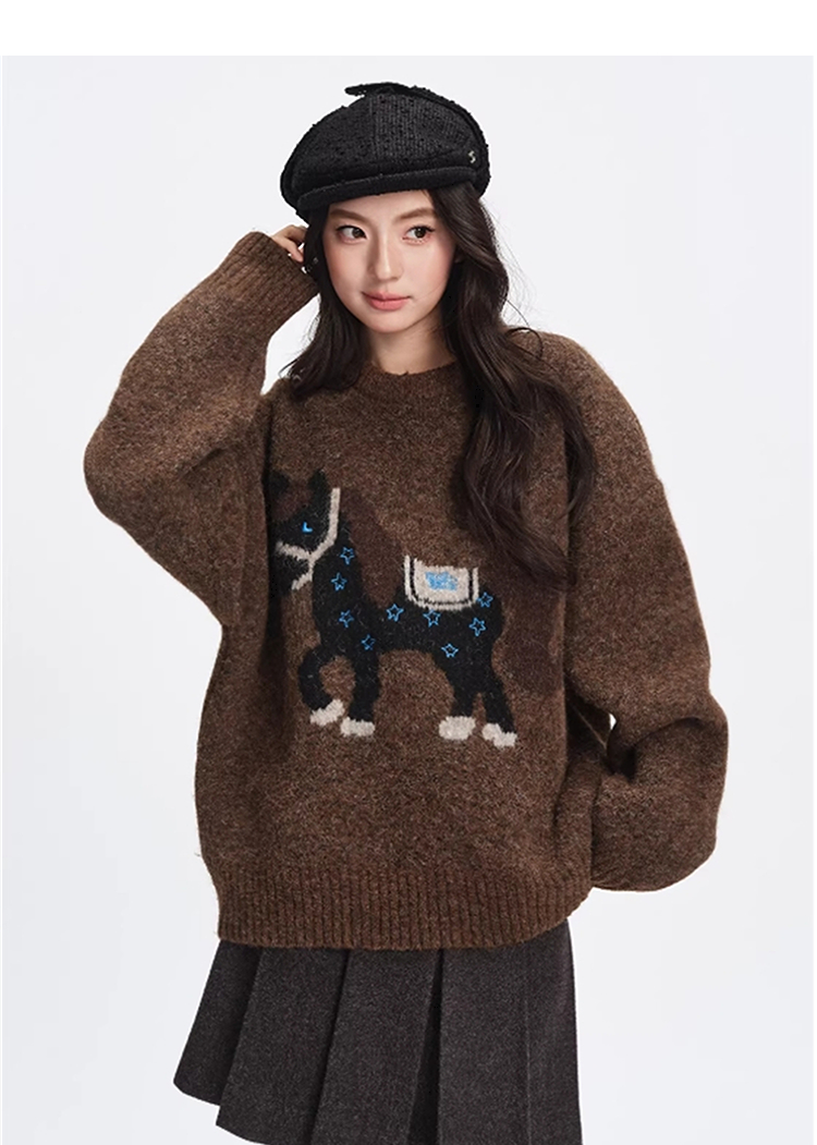 西遇新年红色毛衣女2026春季新款韩式可爱风卡通圆领宽松慵懒上衣SS060051