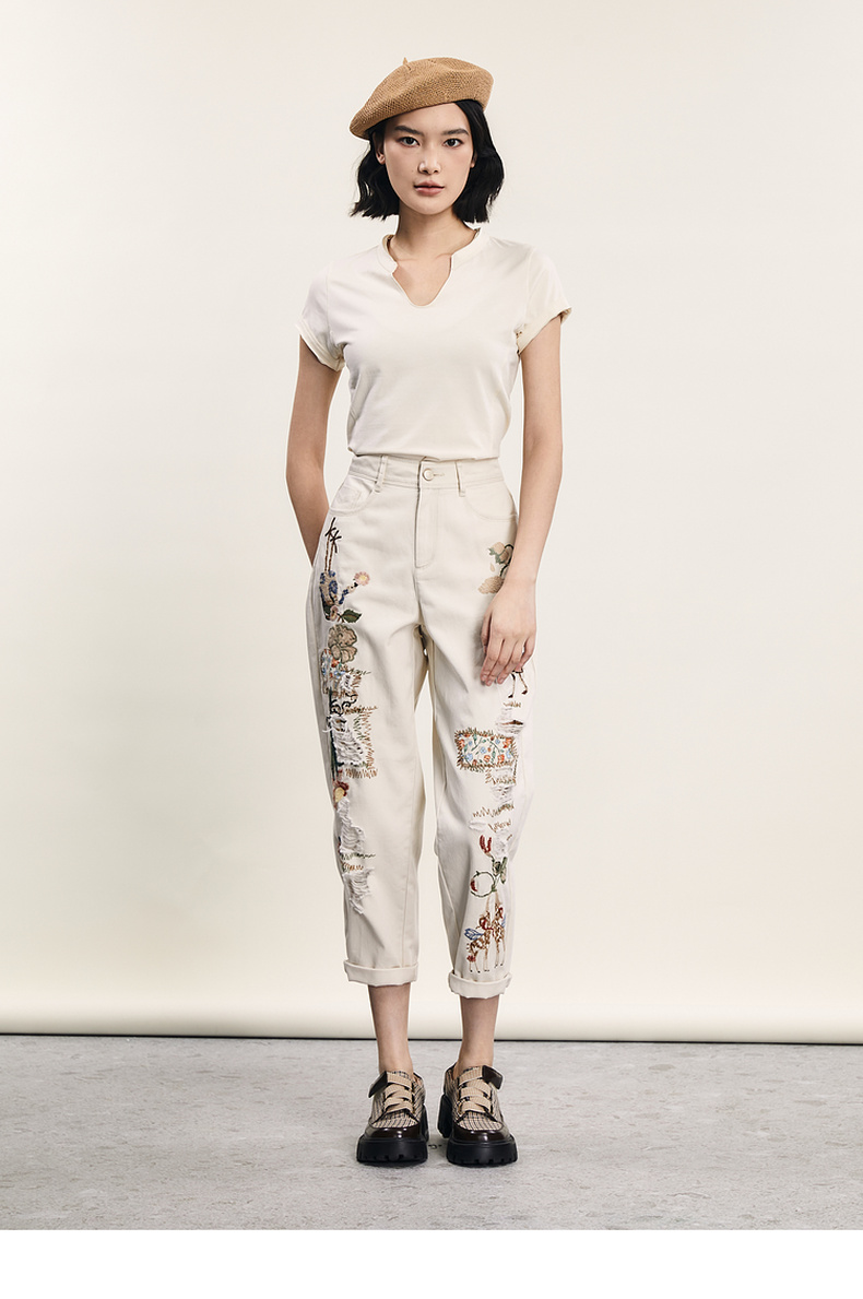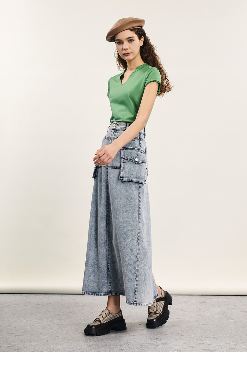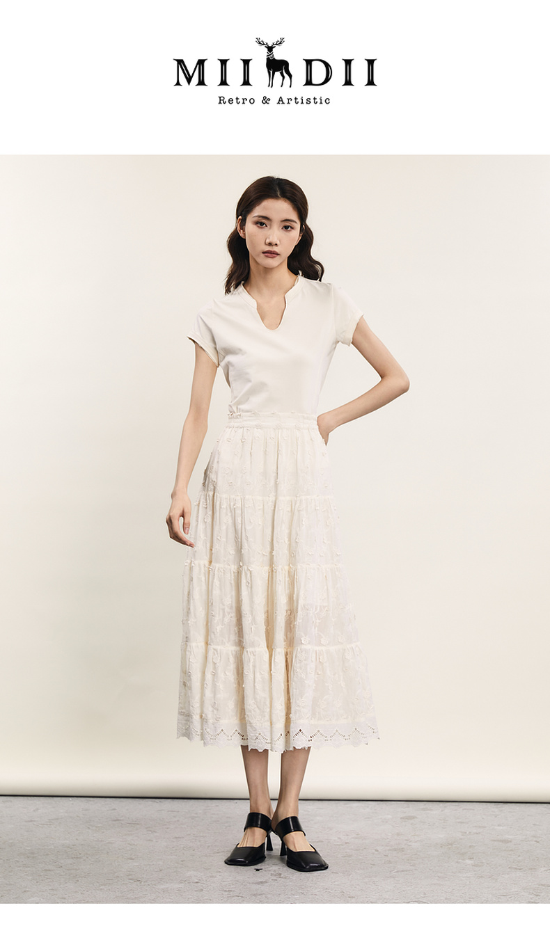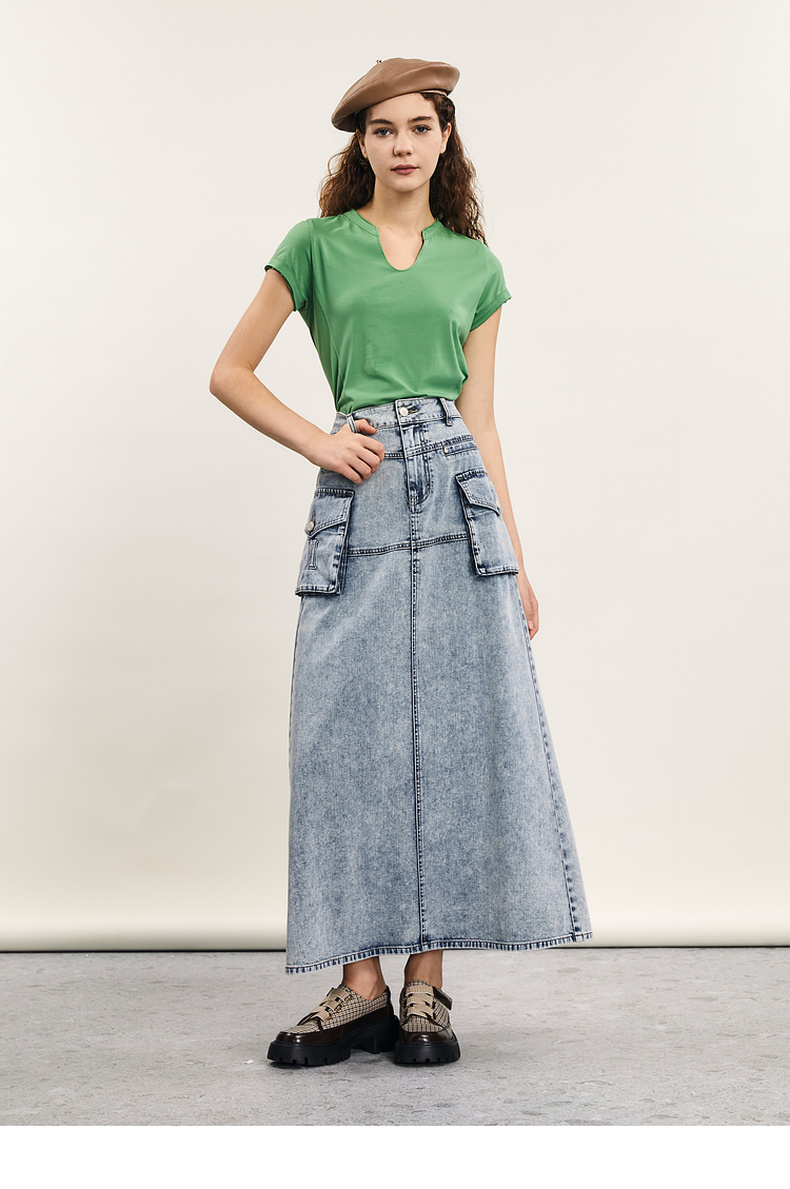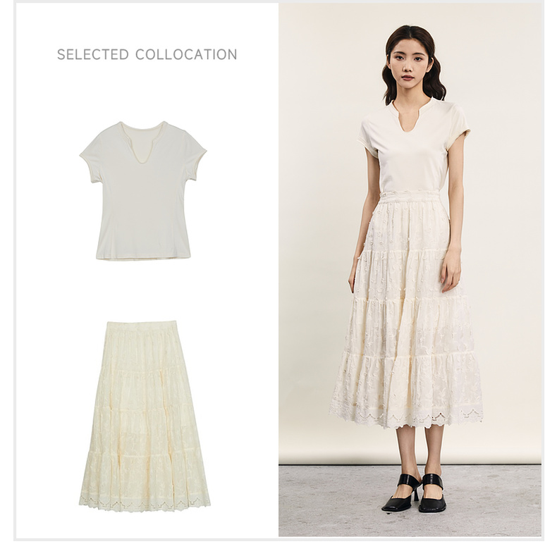 谜底V领T恤短袖女2024年夏季新品百搭纯色修身高弹上衣242MT0572