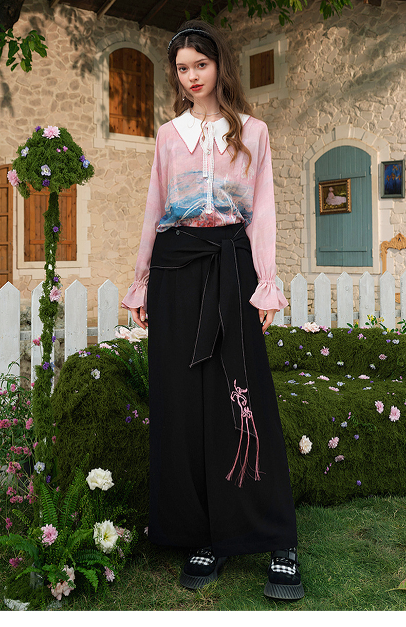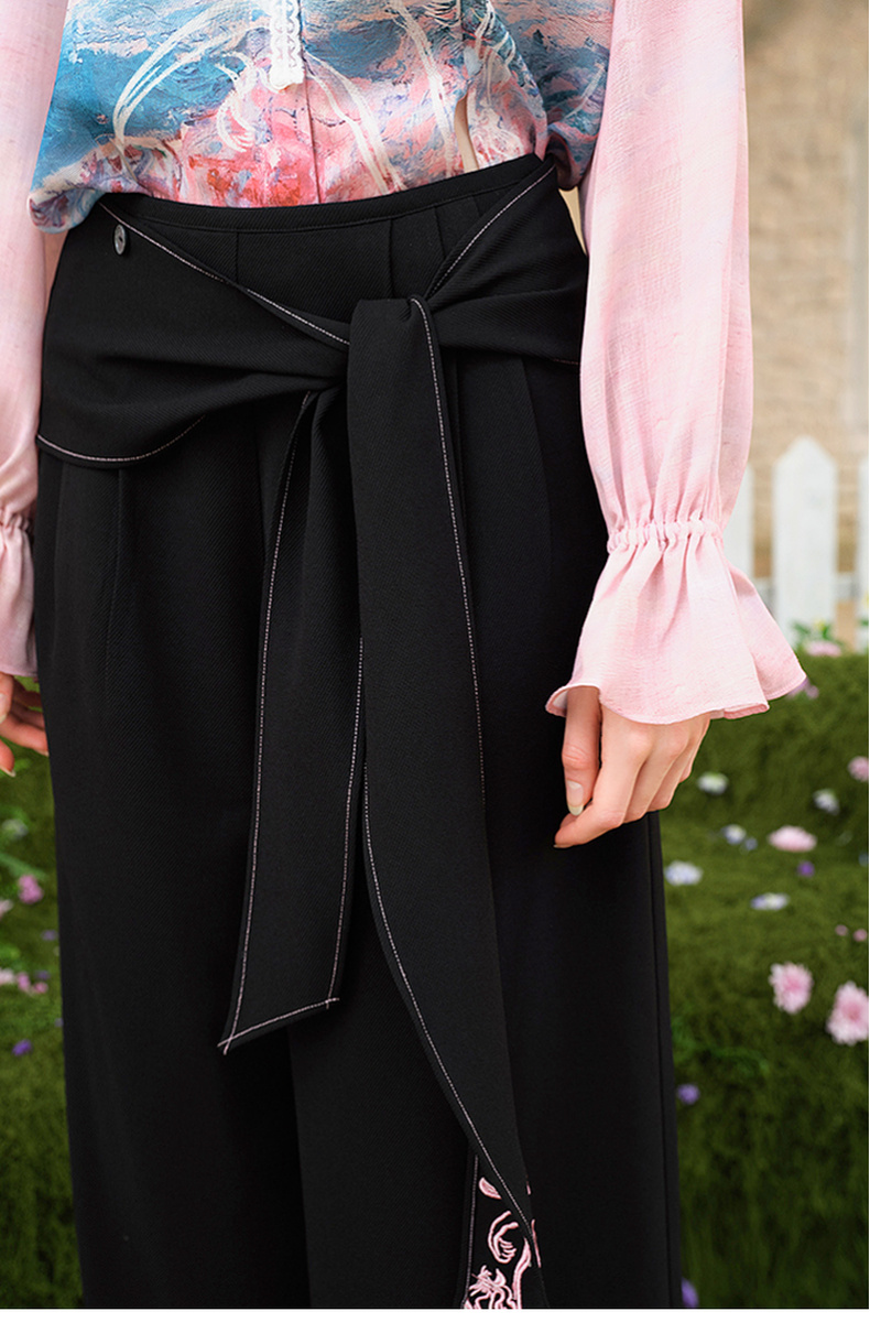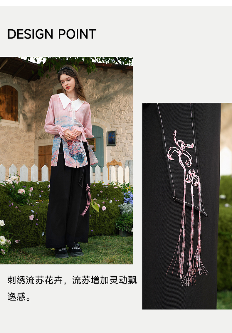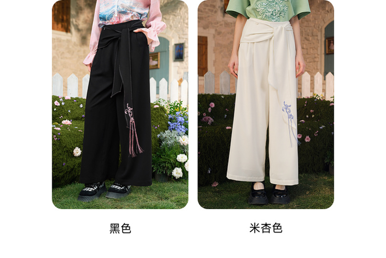 两三事 春水流云 2025春季新款复古流苏绣花系带阔腿高腰休闲裤女