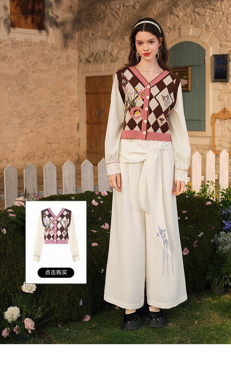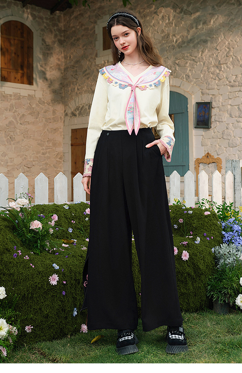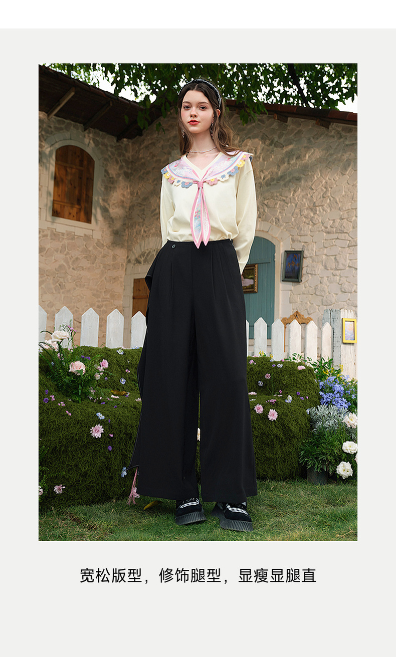 两三事 春水流云 2025春季新款复古流苏绣花系带阔腿高腰休闲裤女